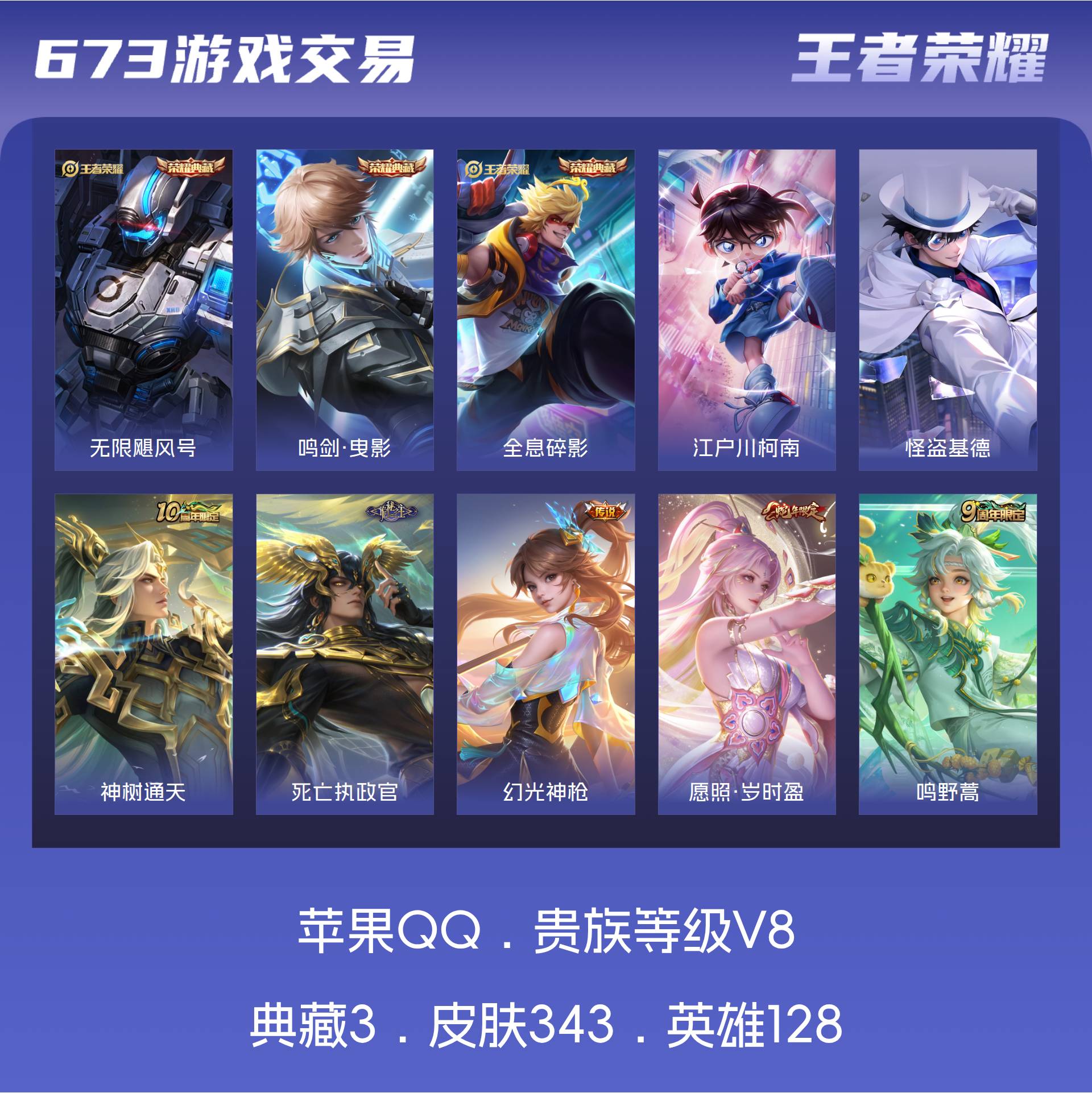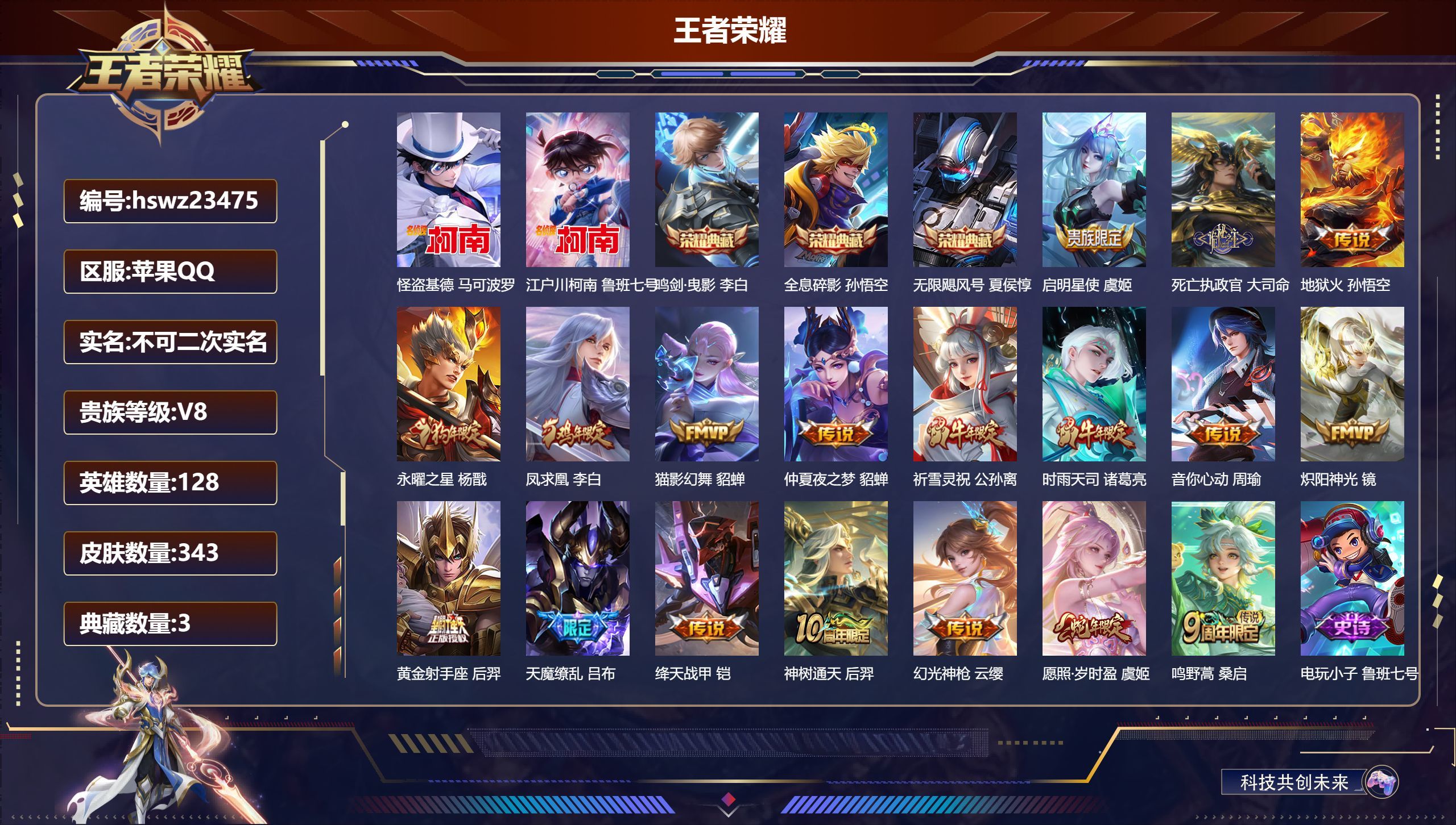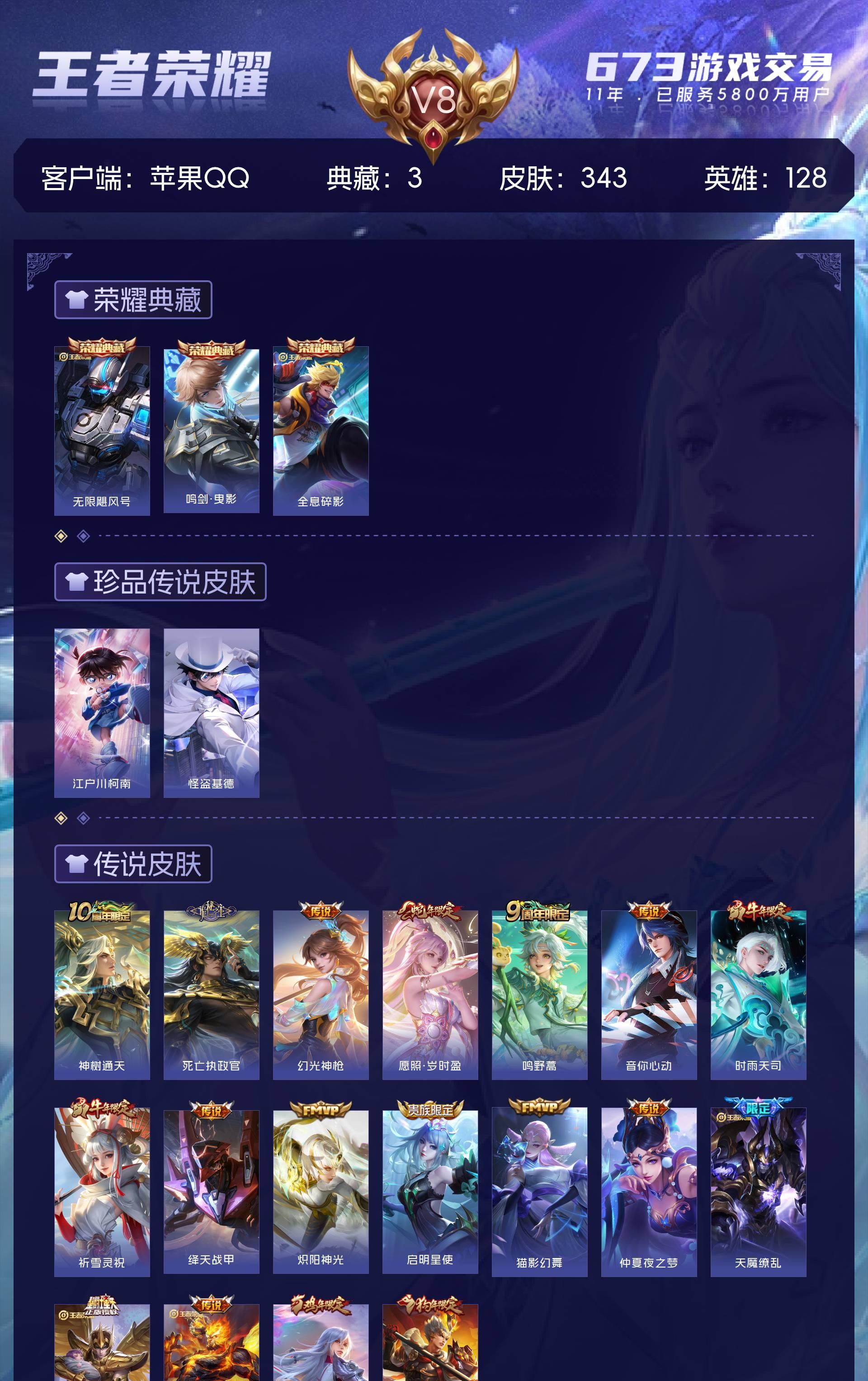 苹果QQ/永恒钻石/343皮肤/128英雄/3典藏/0珍品无双/0无双/2珍品传说/18传说/88史