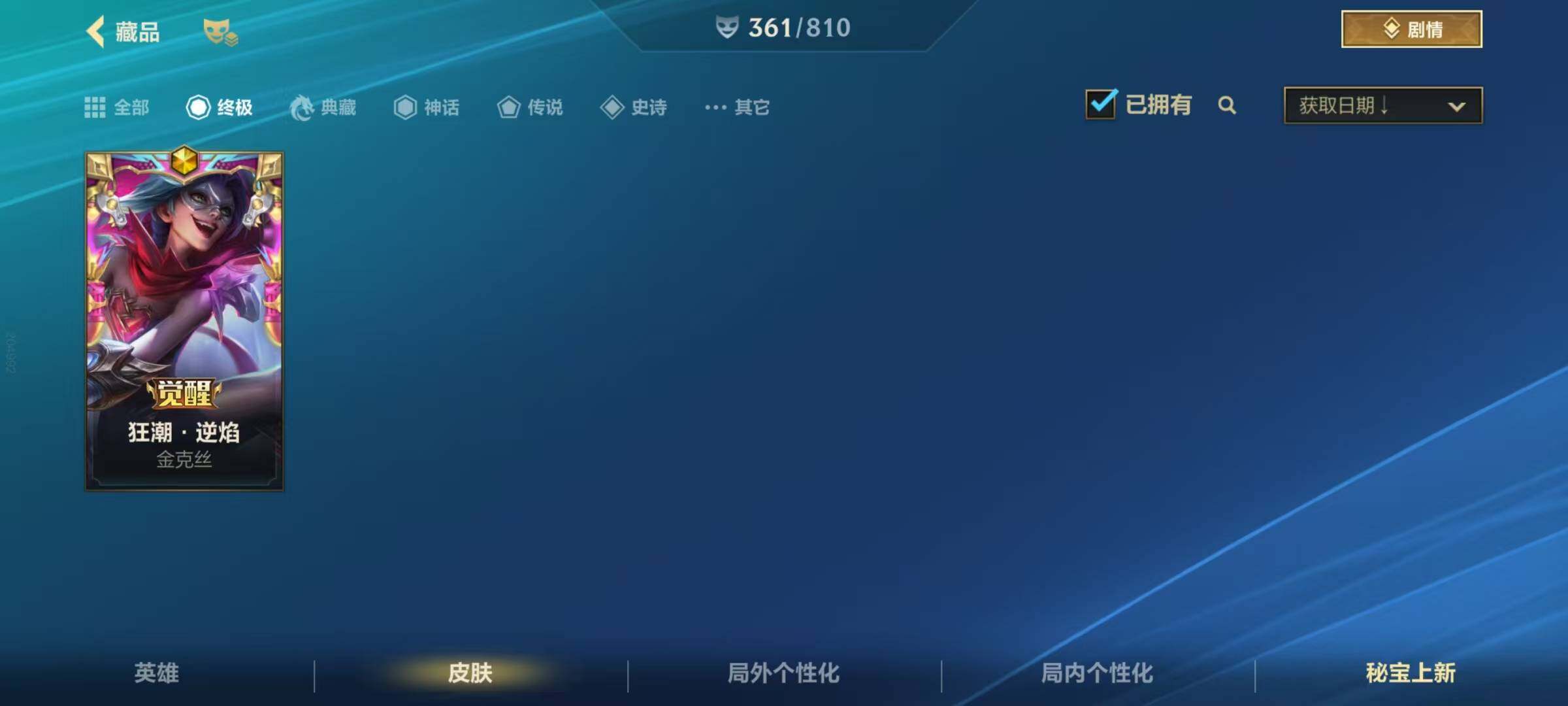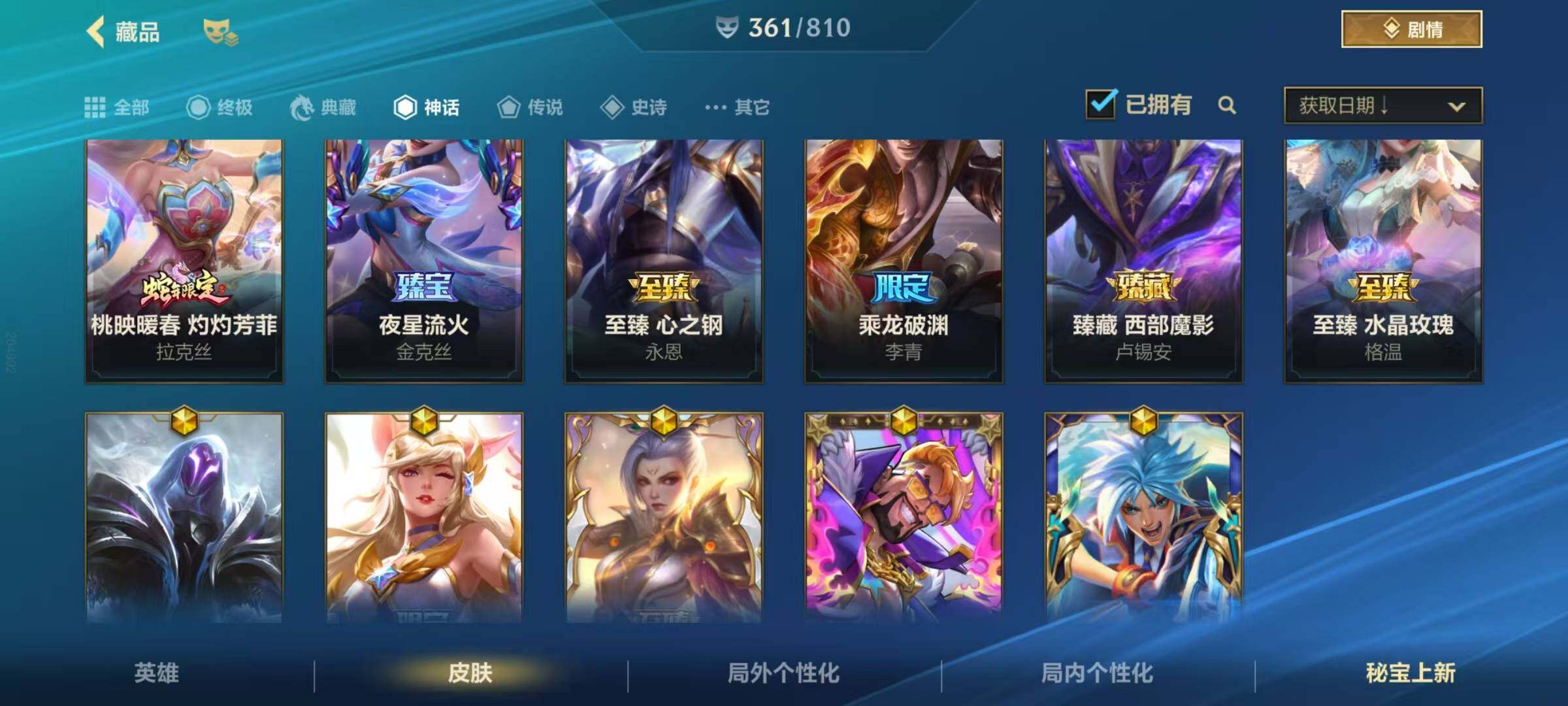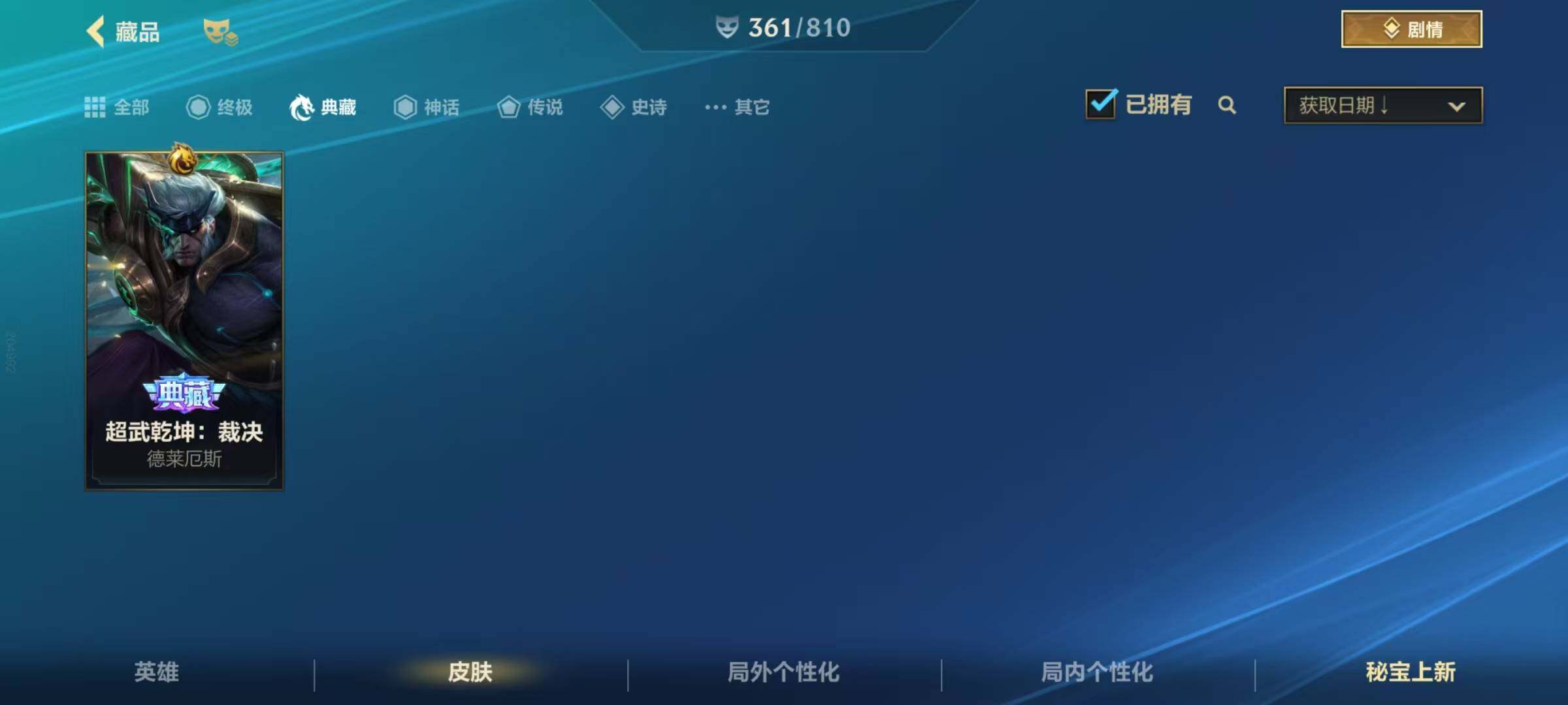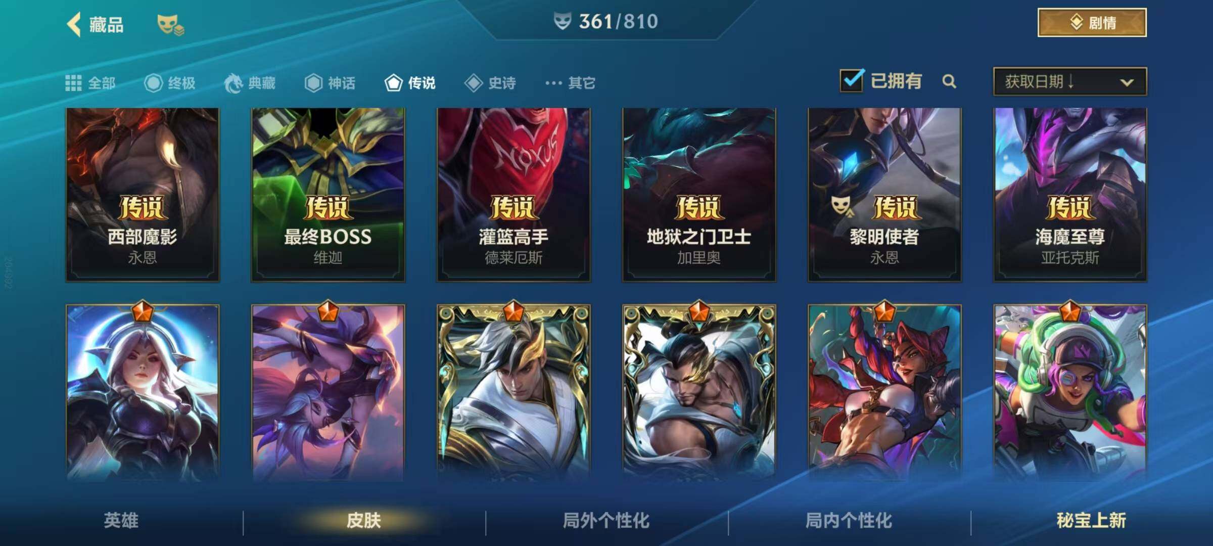 134英雄/361皮肤/1典藏/12神话/53传说/188史诗/流光翡翠/超武乾坤德莱厄斯/