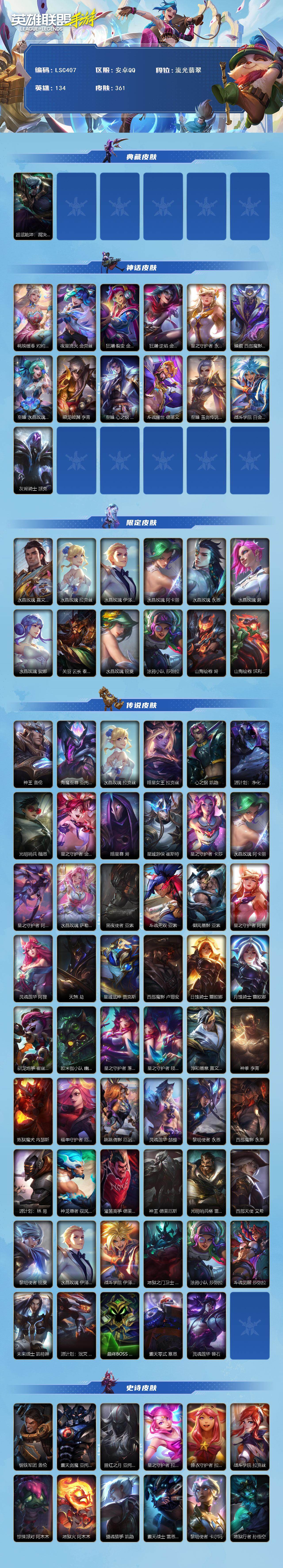 【LSC407】134英雄/361皮肤/1典藏/12神话/53传说/188史诗/流光翡翠/超武乾坤德莱厄斯/桃映暖春 灼灼芳菲 拉克丝/夜星流火 金克丝/狂潮·裂变 金克丝/狂潮·逆焰 金克丝/星之守护者 永绽盛芒 阿狸/臻藏 西部魔影 卢锡安/至臻 水晶玫瑰 格温/乘龙破渊 李青/至臻 心之钢 永恩/斗魂耀世 德莱文/至臻 玉剑传说 武剑仙 锐雯/战斗学院 白金学长 伊泽瑞尔/灰烬骑士 派克/水晶玫瑰 嘉文四世/水晶玫瑰 拉克丝/水晶玫瑰 伊泽瑞尔/水晶玫瑰 阿卡丽/水晶玫瑰 永恩/水晶玫瑰