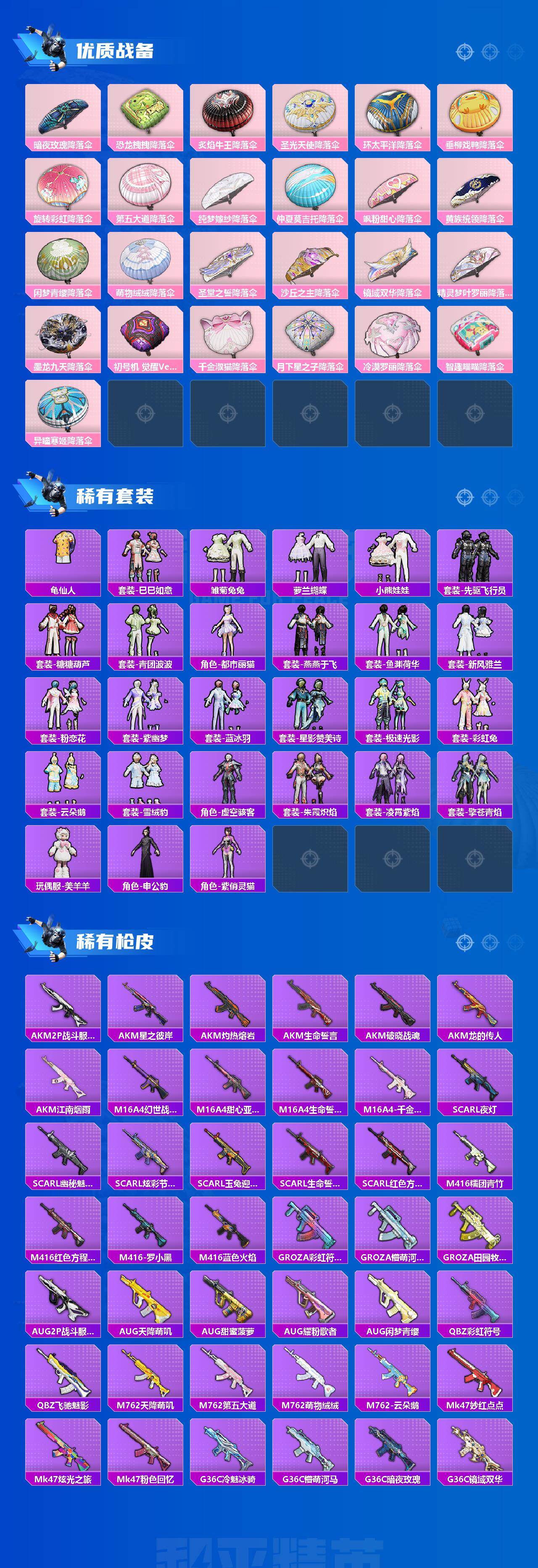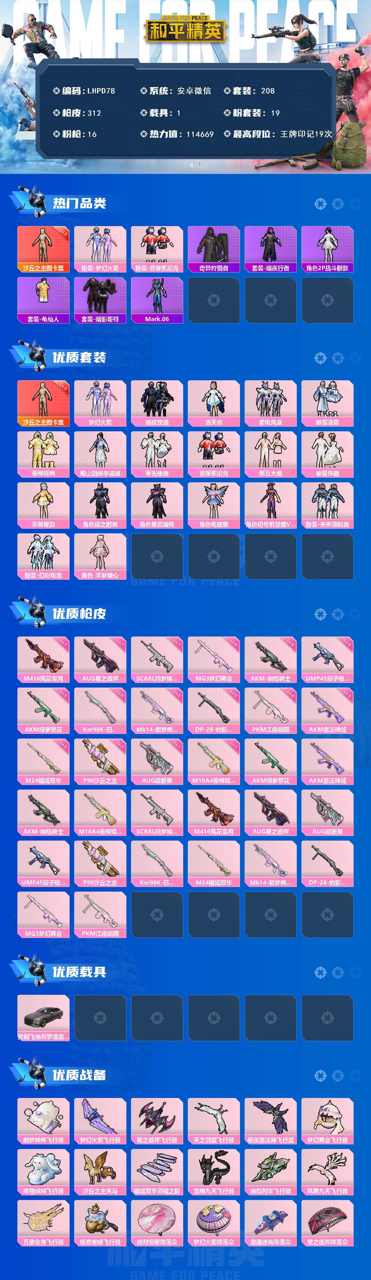 【特价出售/店主推荐】安卓 微信-1神装-19粉装-16特效枪-1载具-16粉色飞行器-114669热力值-19王牌印记-208套装-312枪皮【红色神装等级】:沙丘之主-图卡盟(三级)【红色角色神装】:沙丘之主-图【热门品类】:粉装-梦幻火箭,粉装-音爆索尼克,套装-奇异狩猎者,套装-暗夜行者,角色-2P战斗服款,套装-龟仙人,套装-暗影哥特,角色-Mark.06【粉色套装】:粉装-梦幻火箭,