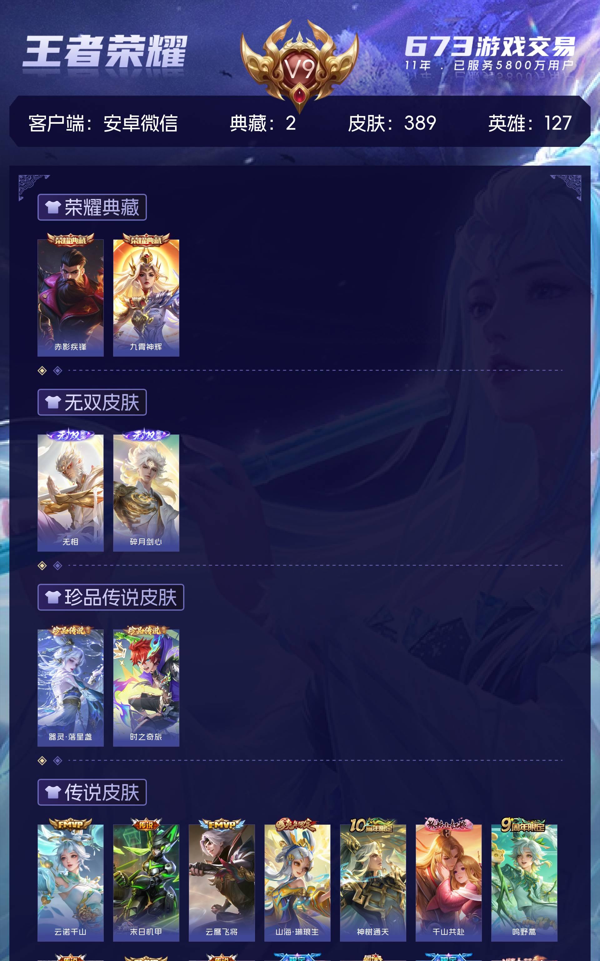 安卓微/无双王者/389皮肤/127英雄/2典藏/0珍品无双/2无双/2珍品传说/32传说/105