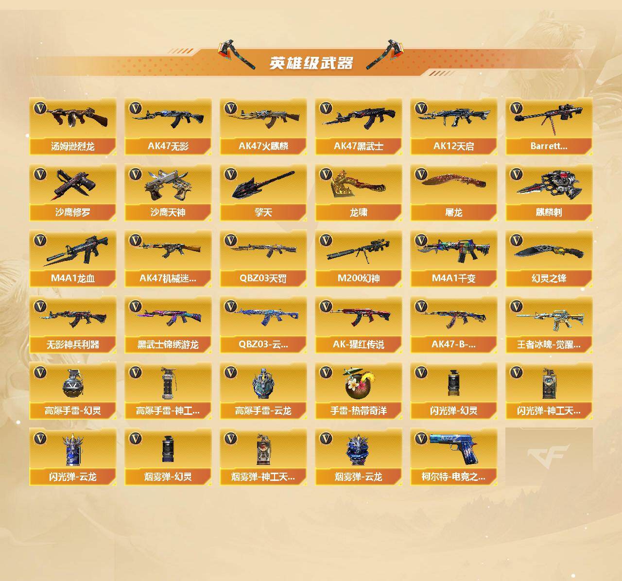 【热门武器】:QBZ03-金色蔷薇,M200-幻神,M4A1-黑骑士,汤姆逊-烈龙,加特林-炼狱*3,MK5-炽火炎龙,沙鹰-修罗*2