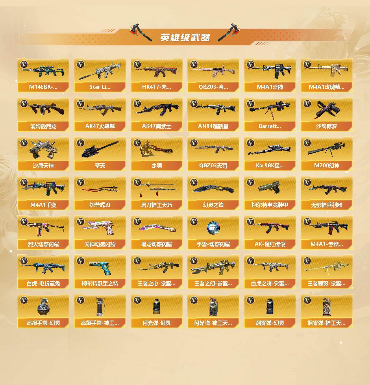 【热门武器】:传说暗裔,QBZ03-金色蔷薇,M14EBR-玄武,Scar Light-白虎,HK417-朱雀,M200-幻神,死亡之眼*2,白虎-电玩蓝兔,QBZ03-街机,柯尔特-冠军之特,Kar98K-星神,汤姆逊-烈龙*5,火麒麟-绝迹,COP-白鲨,沙鹰-修罗,炽芒蝶刃