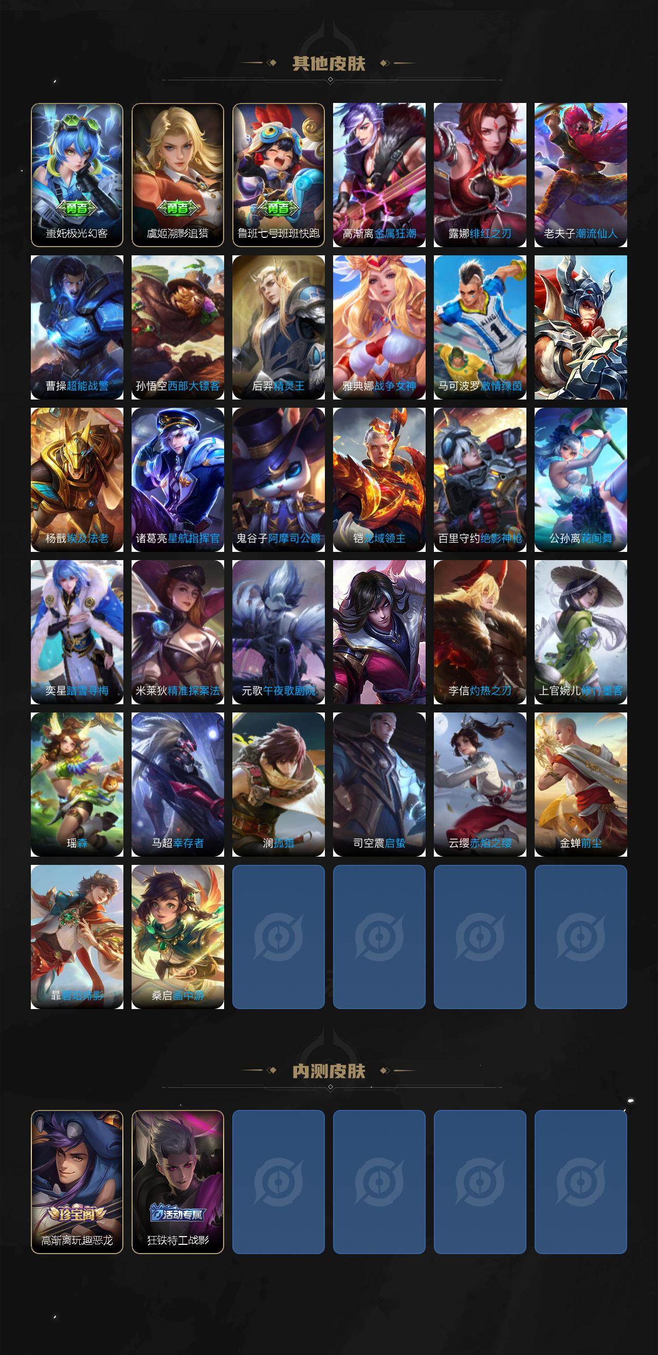 【传说皮肤】:后羿神树通天,桑启鸣野蒿,夏洛特浮生妄,干将莫邪画中仙,花木兰燃星之曲,虞姬无限倾心,项羽无限倾心,李信山海炽霜斩,李白诗剑行,马可波罗深海之息,后羿无尽星芒,