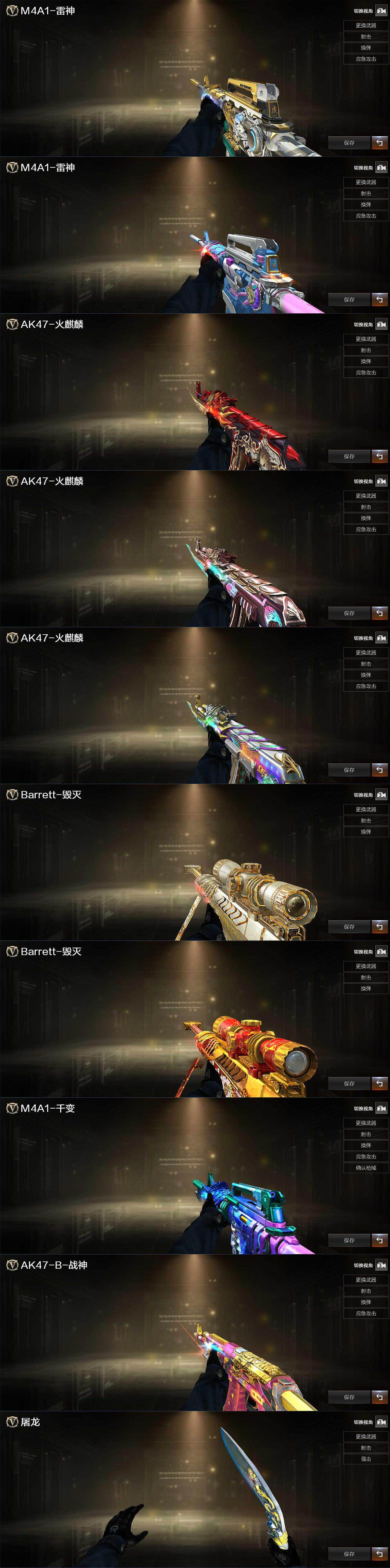 【热门武器】:传说圣灵,QBZ03-金色蔷薇,HK417-朱雀,M200-幻神,死亡之眼,白虎-电玩蓝兔,Kar98K-星神,金色小号,M4A1-黑骑士,汤姆逊-烈龙*5