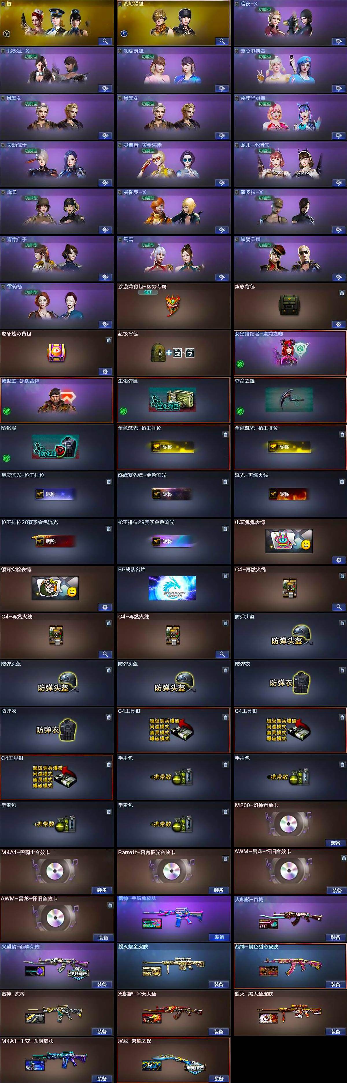 【音效卡】:M200-幻神音效卡,M4A1-黑骑士音效卡,Barrett-碧霄极光音效卡,AWM-昌龙-怀旧音效卡*2