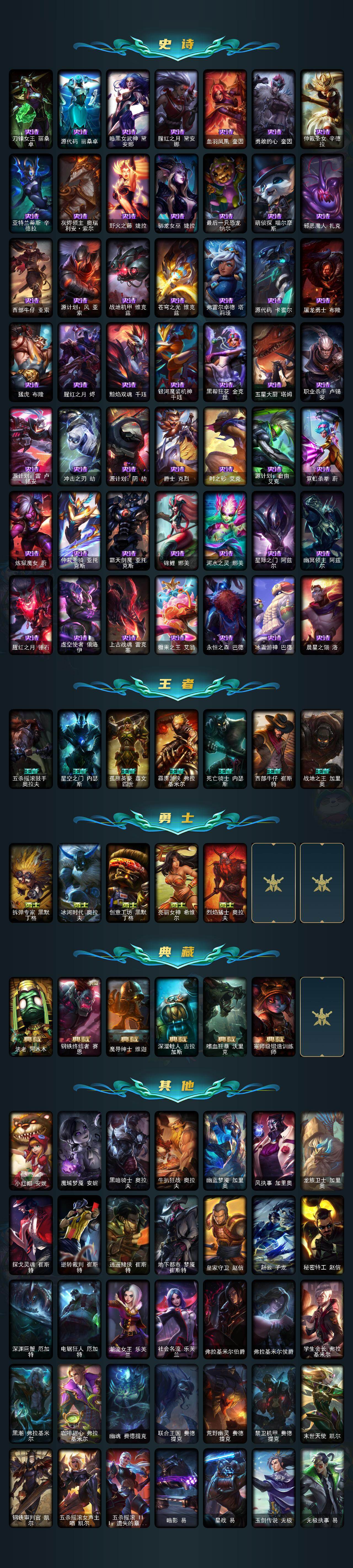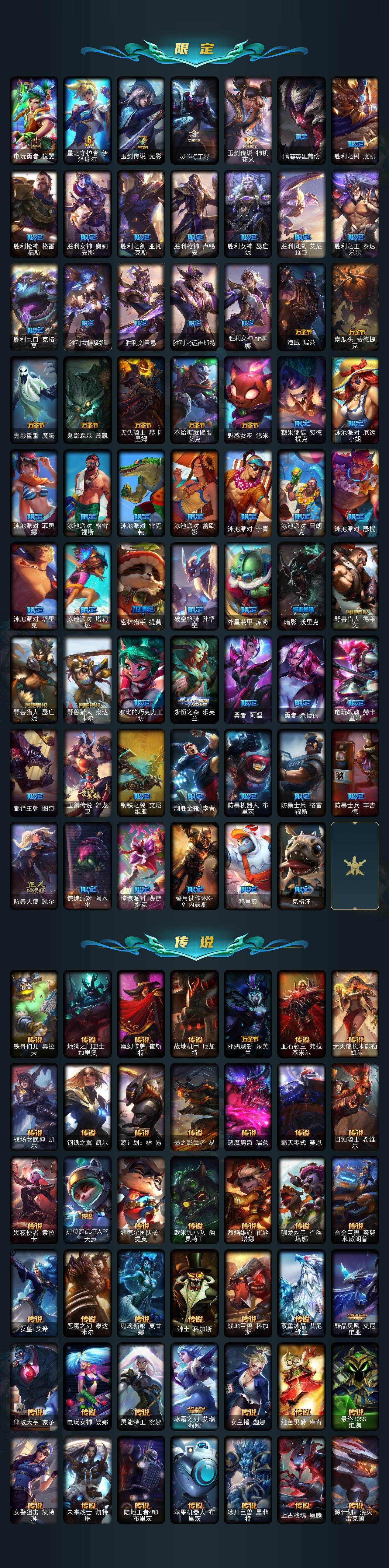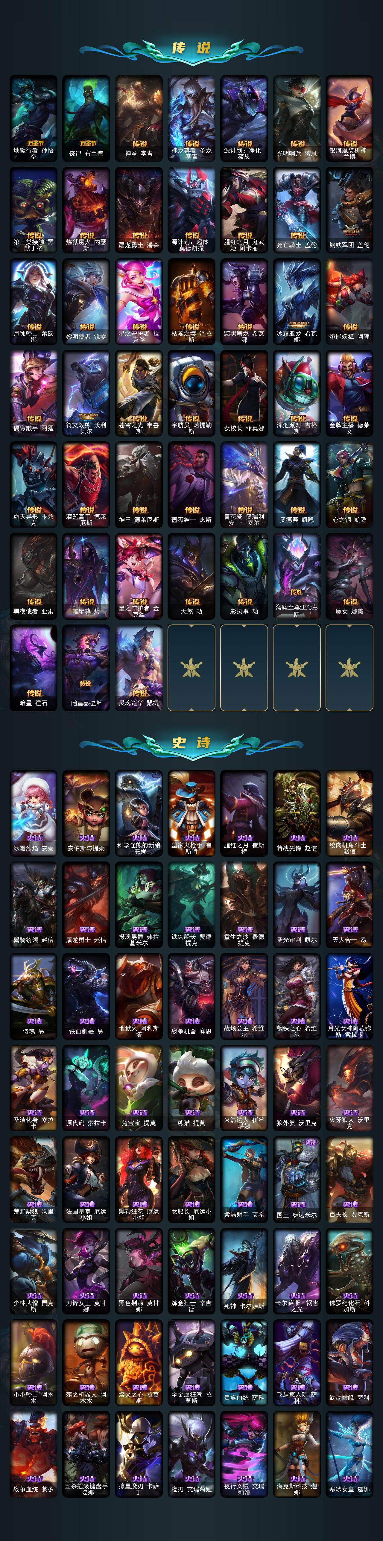 172英雄/960皮肤/3终极/29神话/167限定/27臻彩/430炫彩/87传说/210史诗/铂金/十周年纪念安妮/