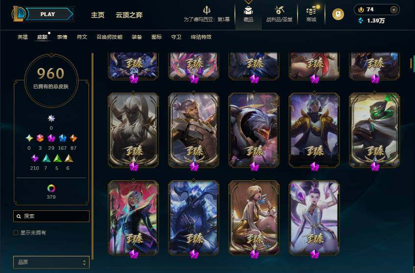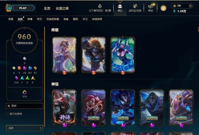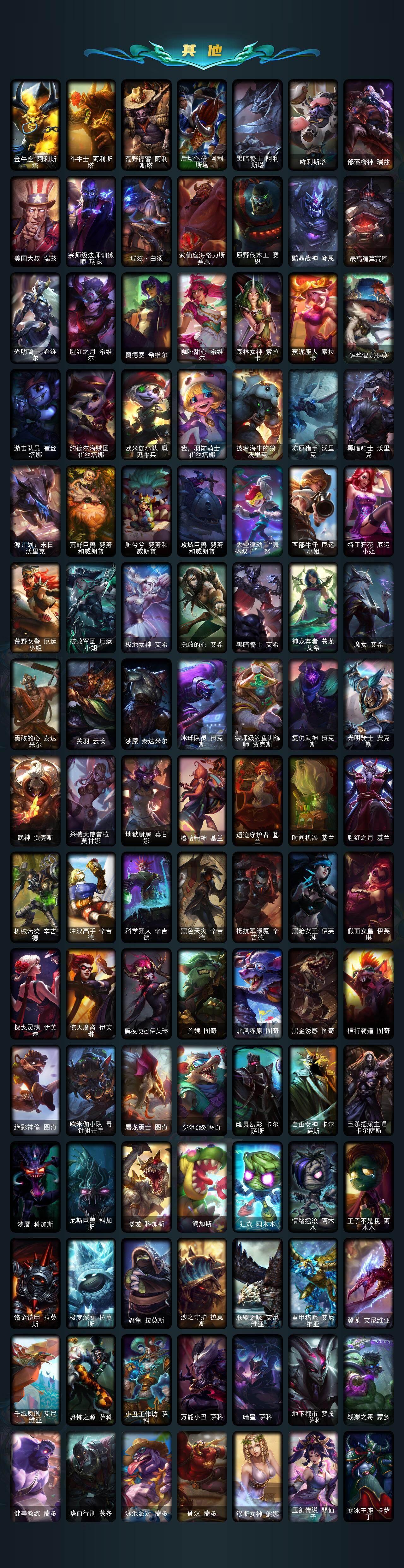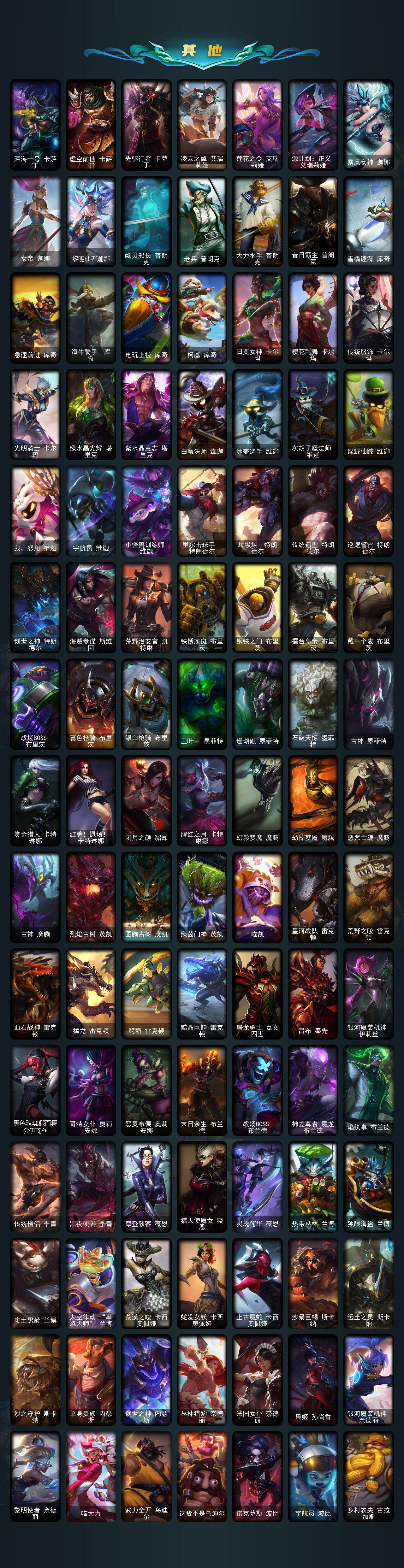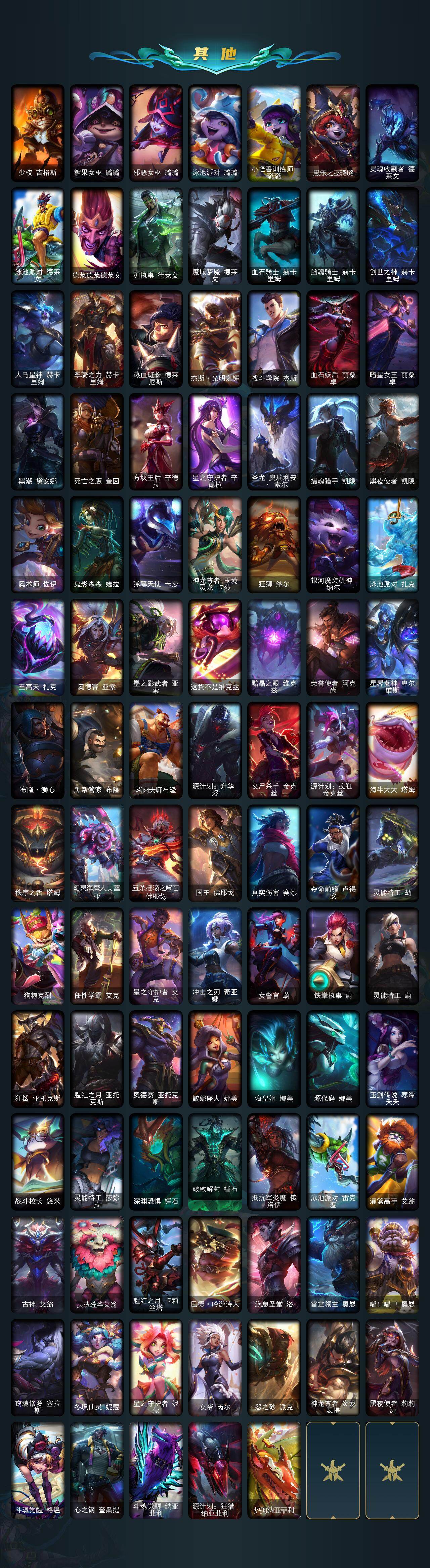 172英雄/960皮肤/3终极/29神话/167限定/27臻彩/430炫彩/87传说/210史诗/铂金/十周年纪念安妮/