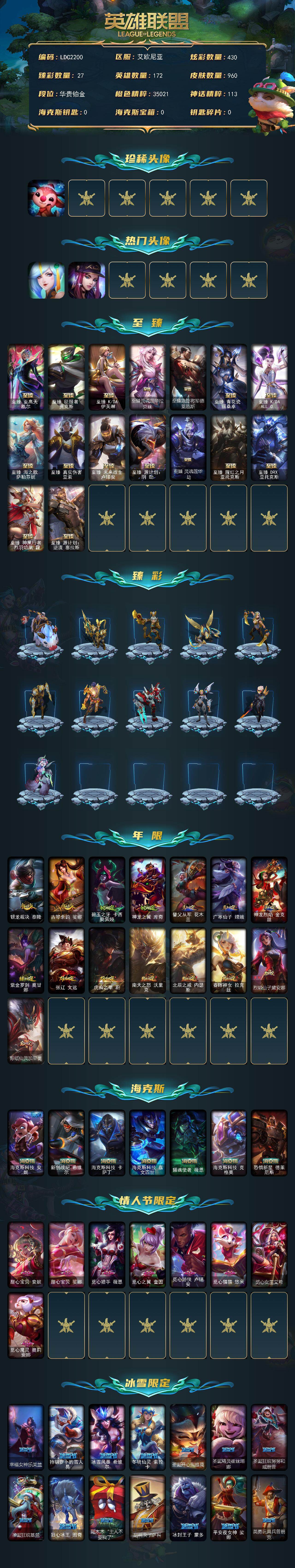【LDC2200】172英雄/960皮肤/3终极/29神话/167限定/27臻彩/430炫彩/87传说/210史诗/铂金/十周年纪念安妮/源代码乐芙兰/新卧虎藏龙贾克斯/殿堂传奇薇恩/水晶掠夺者卡兹克/西部魔影炽天使永恩/海克斯科技安妮/海克斯科技嘉文四世/海克斯科技卡萨丁/海克斯科技克格莫/恐惧新星德莱厄斯/摄魂使者薇恩/新创战纪希维尔/至臻征服者贾克斯/至臻真实伤害亚索/至臻至高天凯尔/至臻DRX亚托克斯/至臻海之歌萨勒芬妮/至臻KDAALLOUT卡莎/至臻KDA伊芙琳/至臻青花瓷丽桑卓/至