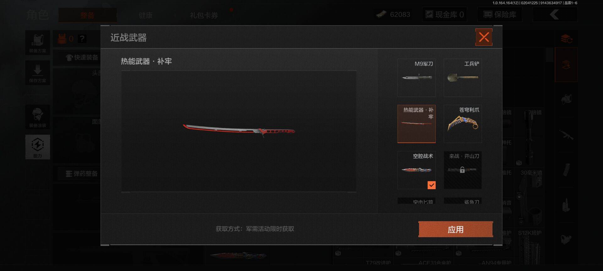 等级:30/段位:大师/仓库价值(百万):4.1/柯恩币:62083/热能武器补牢/