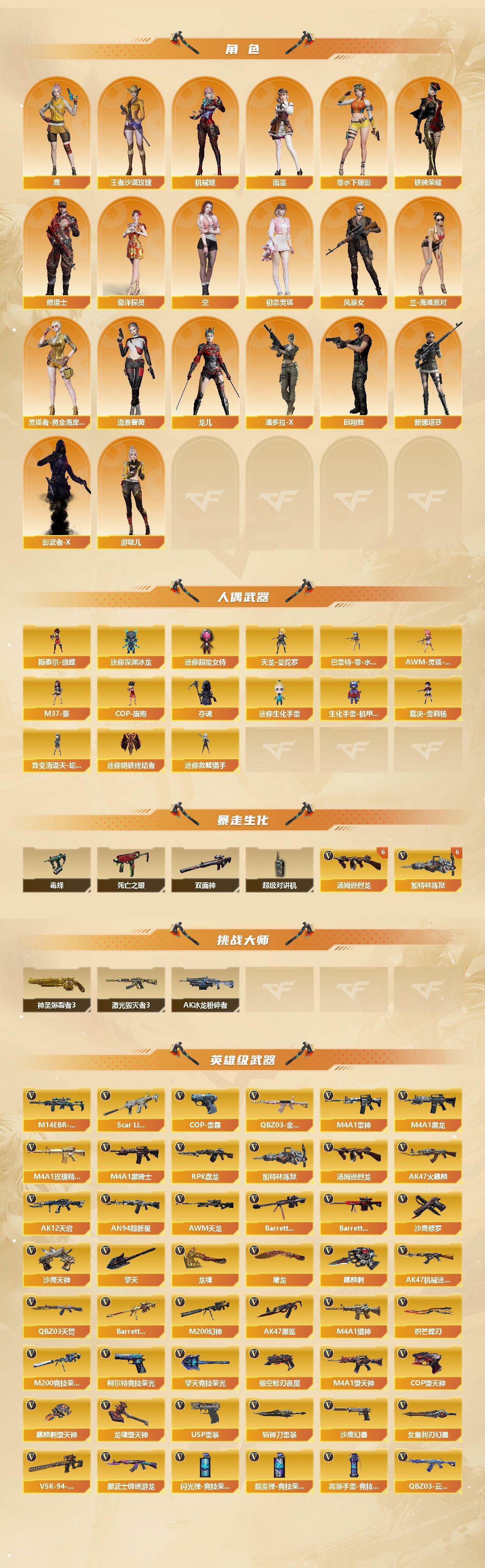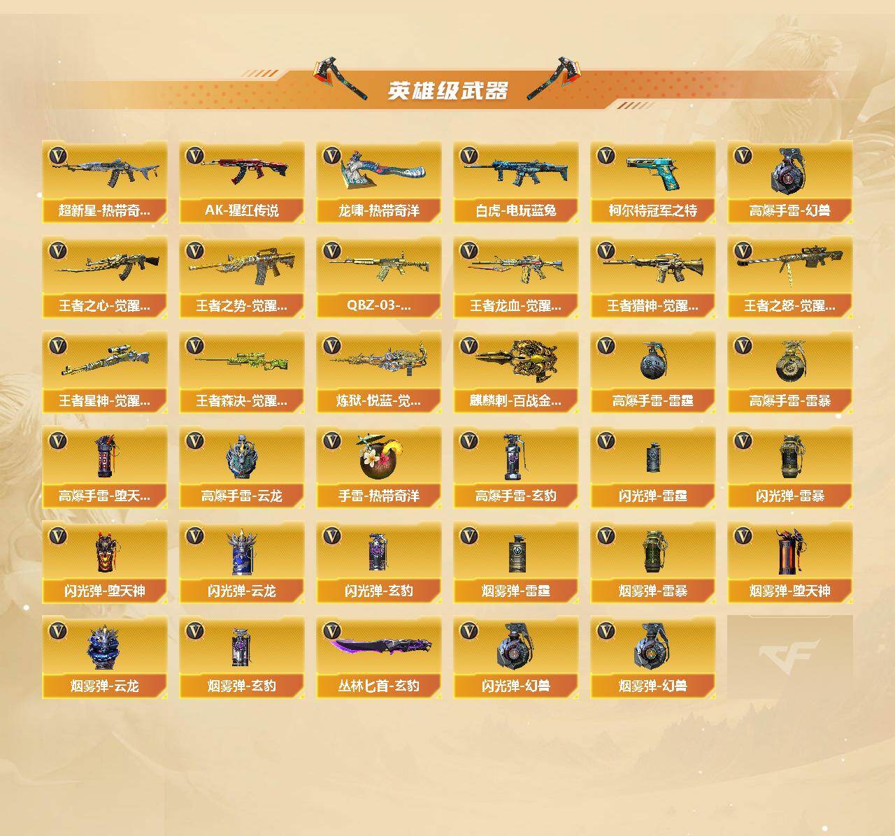 【热门武器】:传说辉光,传说破晓,QBZ03-金色蔷薇,M14EBR-玄武,Scar Light-白虎,M200-幻神*3,M200-竞技荣光,死亡之眼*3,青龙之魄,白虎-电玩蓝兔,柯尔特-冠军之特*2,毒蜂,M4A1-黑骑士*2,汤姆逊-烈龙*6,RPK-盘龙*2,加特林-炼狱*6,斯