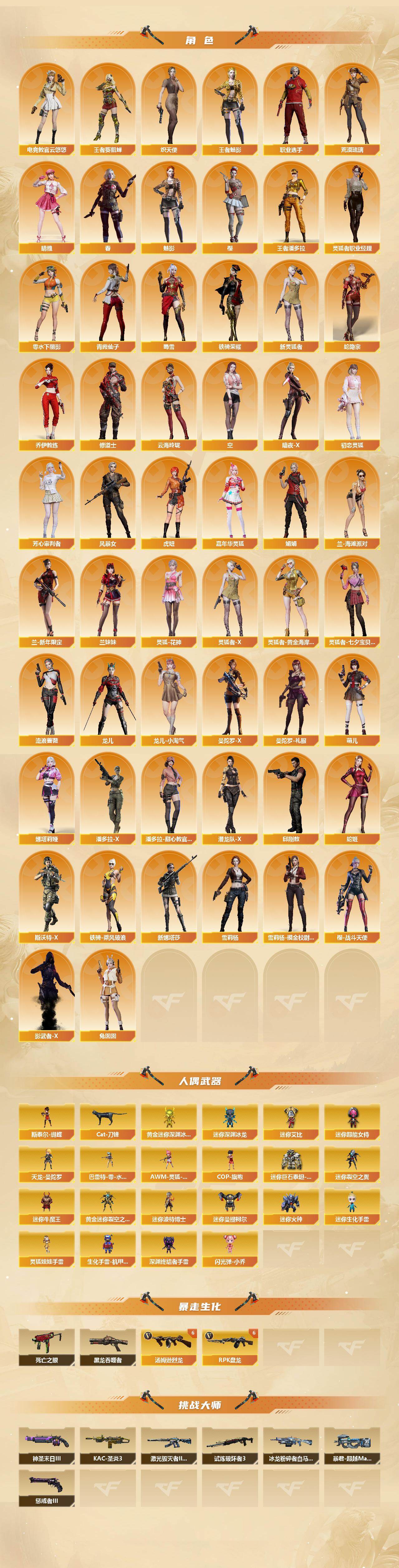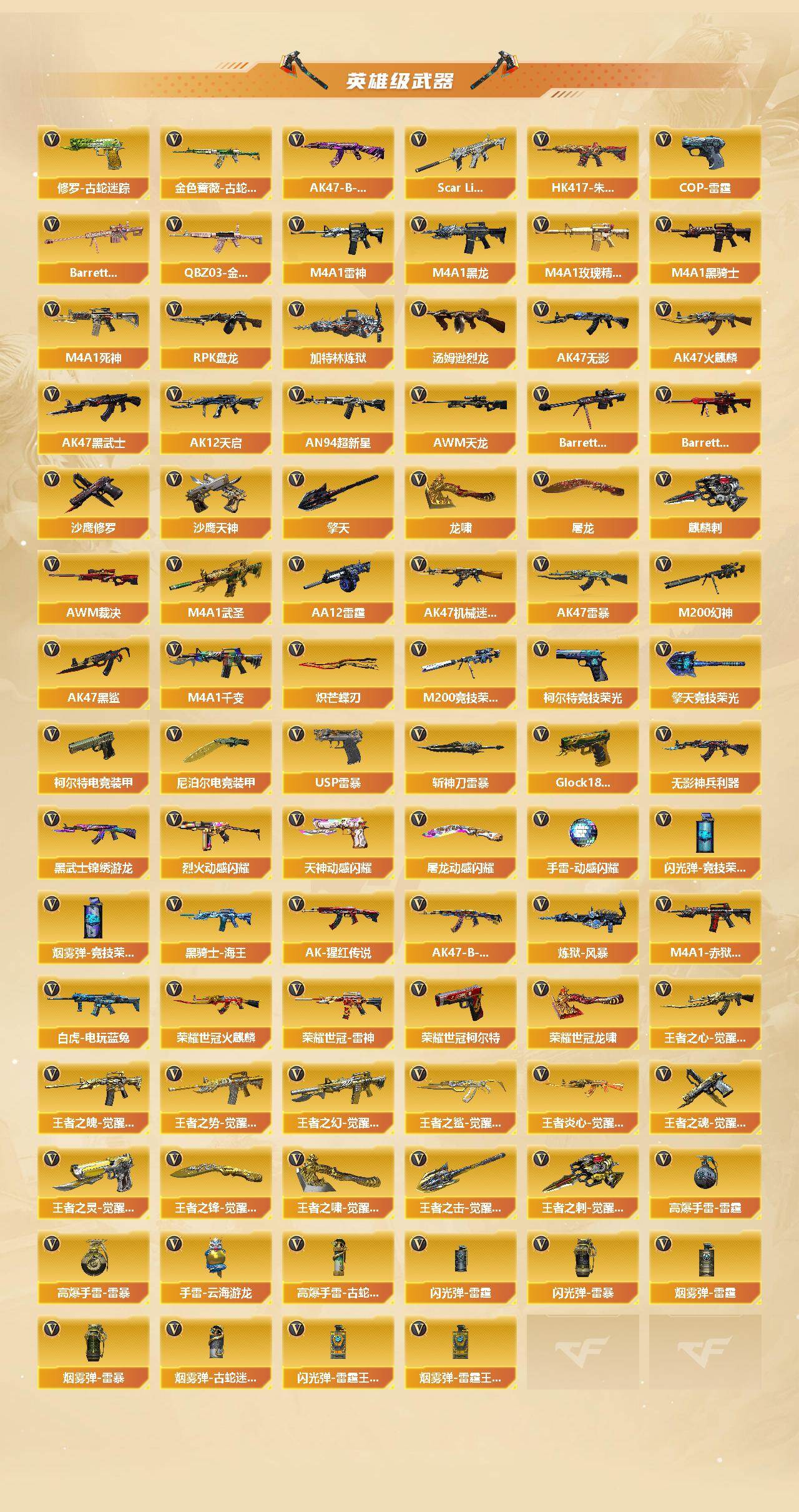 【热门武器】:QBZ03-金色蔷薇,Scar Light-白虎,HK417-朱雀,M200-幻神,金色蔷薇-古蛇迷踪,修罗-古蛇迷踪,M200-竞技荣光,死亡之眼,荣耀世冠-火麒麟,荣耀世冠-雷神,白虎-电玩蓝兔,荣耀世冠-柯尔特,金色小号,Cat-刀锋,M4A1-黑骑士*4,汤姆逊-烈龙*6,RPK-盘龙*6,加特林-炼狱,斯泰尔-蝴蝶,羊驼玩