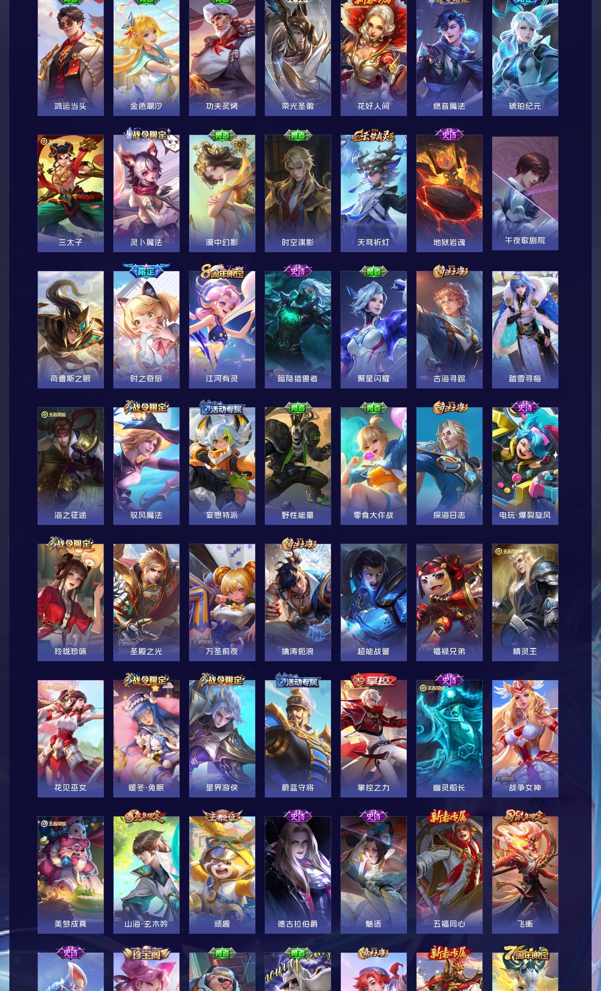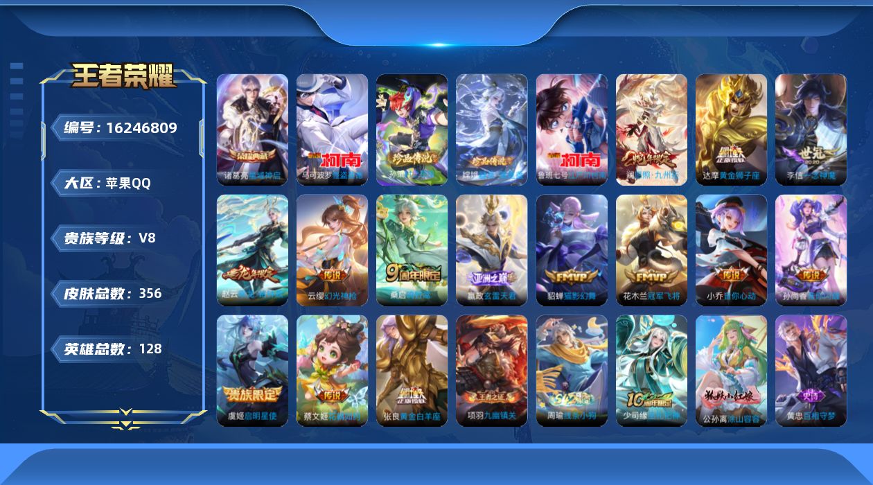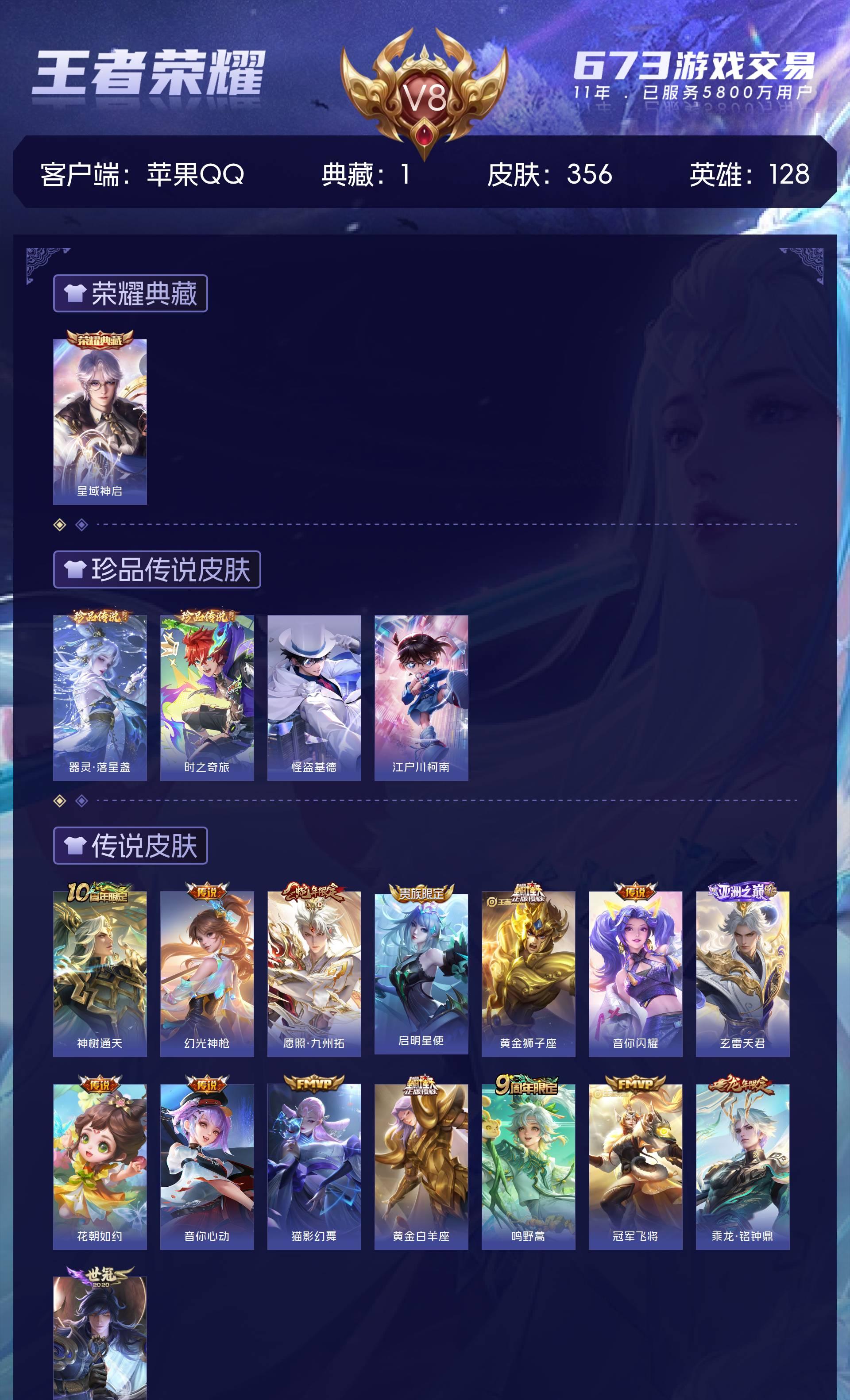 V8 皮肤356 英雄128 永恒钻石 荣耀典藏1 珍品传说4 传说15 其他皮肤341