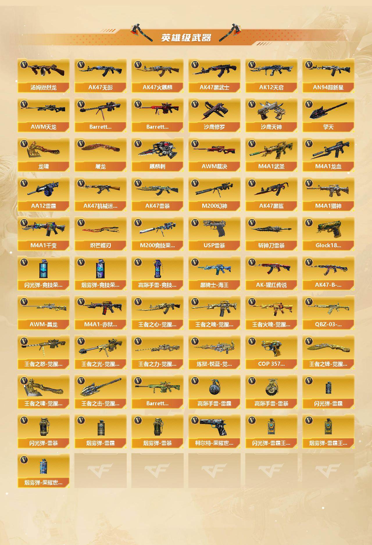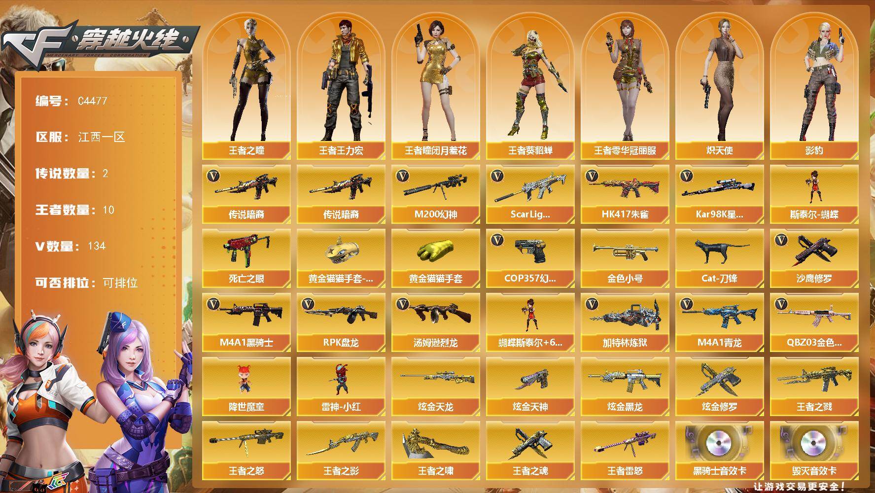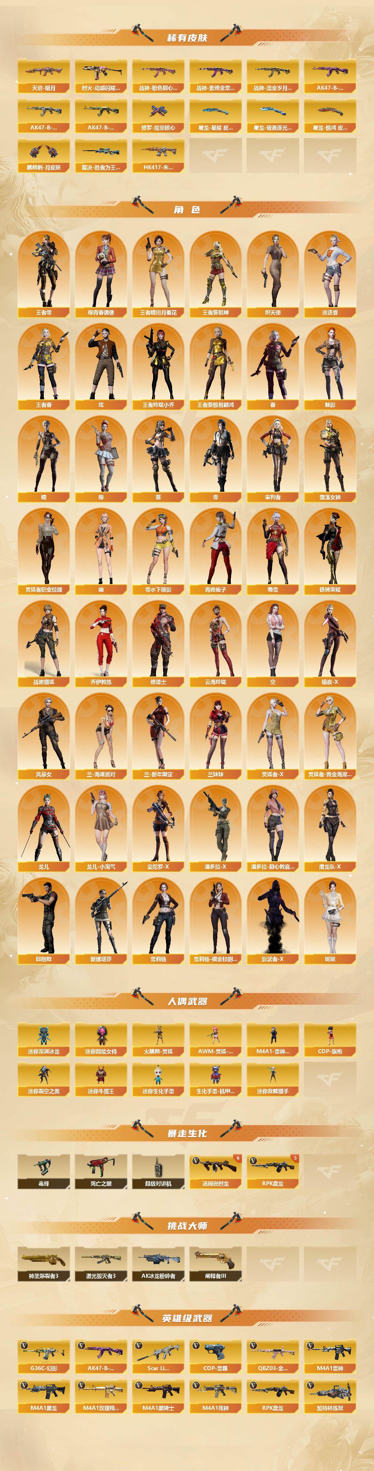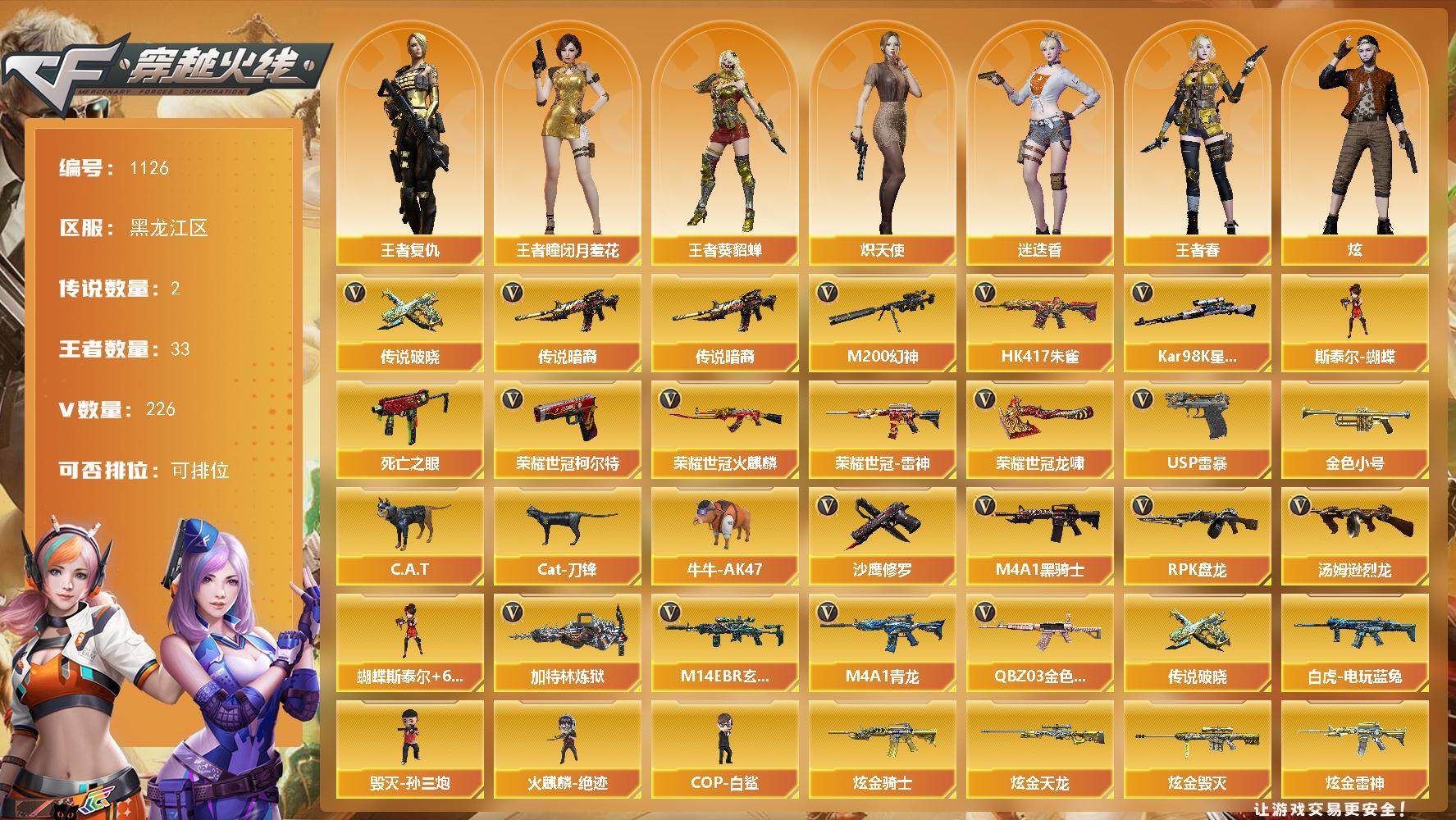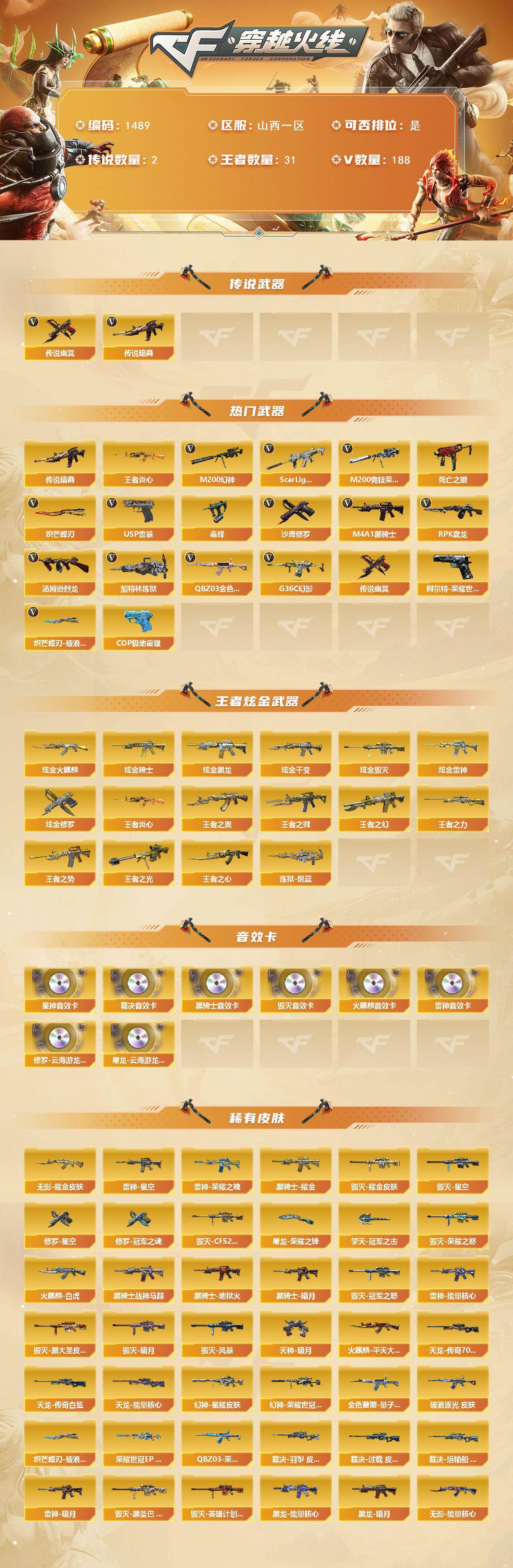 【热门武器】:传说暗裔,传说幽冥,G36C-幻影,QBZ03-金色蔷薇*3,Scar Light-白虎,M200-幻神,柯尔特-荣耀世冠白鲨2023,M200-竞技荣光,死亡之眼,王者炎心,毒蜂,M4A1-黑骑士*4,汤姆逊-烈龙*7,RPK-盘龙*5,加特林-炼狱*3,USP-雷暴,沙鹰-修罗*7,炽芒蝶刃,