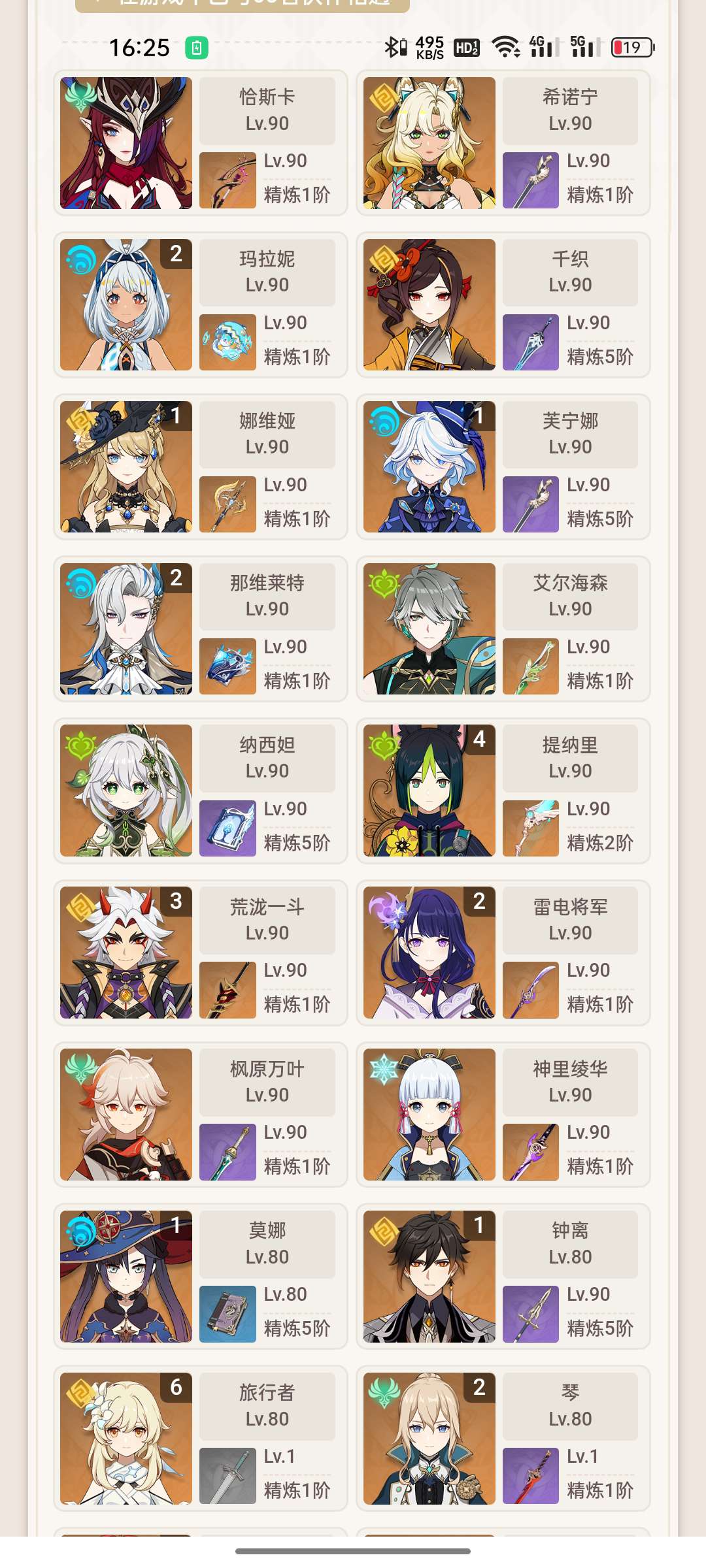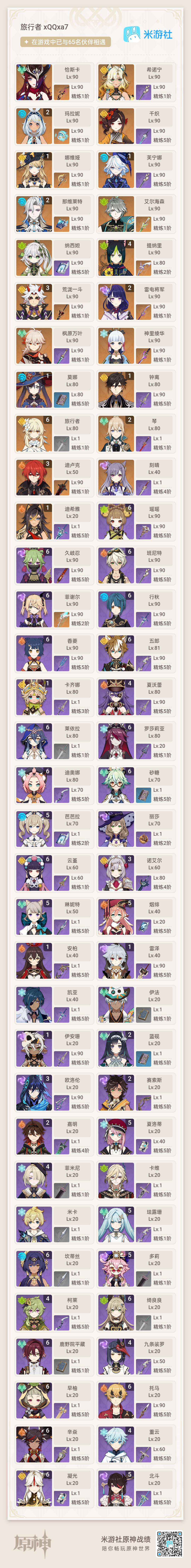 官服56金,3+1一斗,2+1玛拉妮,2+1龙,2+1雷神,1+1娜维娅,1命水神,一命岩神等