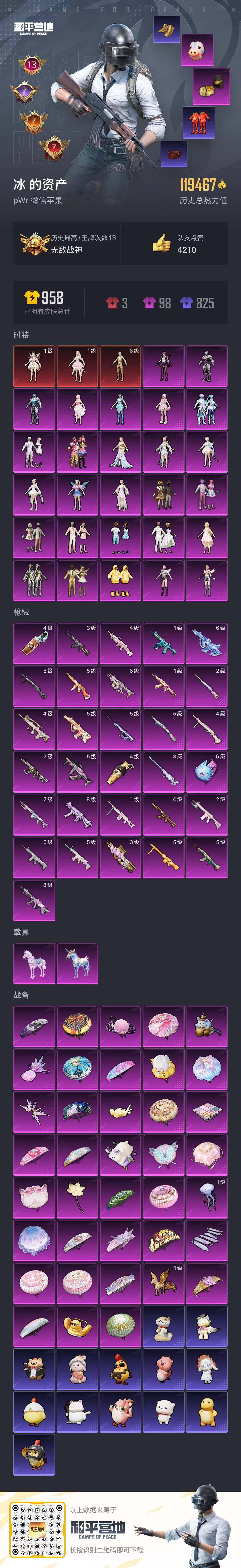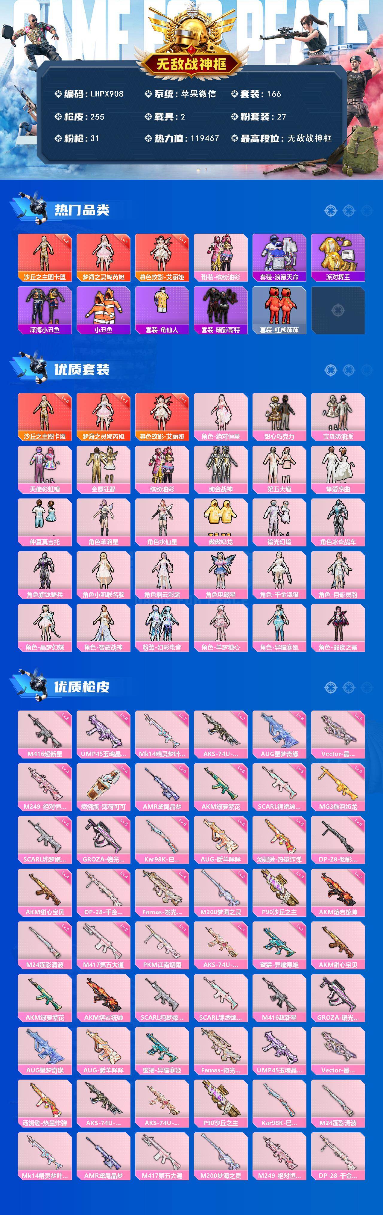 3套6级红装可随意切换【特价出售/店主推荐】苹果 微信-无敌战神框-3神装-27粉装-31特效枪-2载具-12粉色飞行器-119467热力值-13王牌印记-166套装-255枪皮