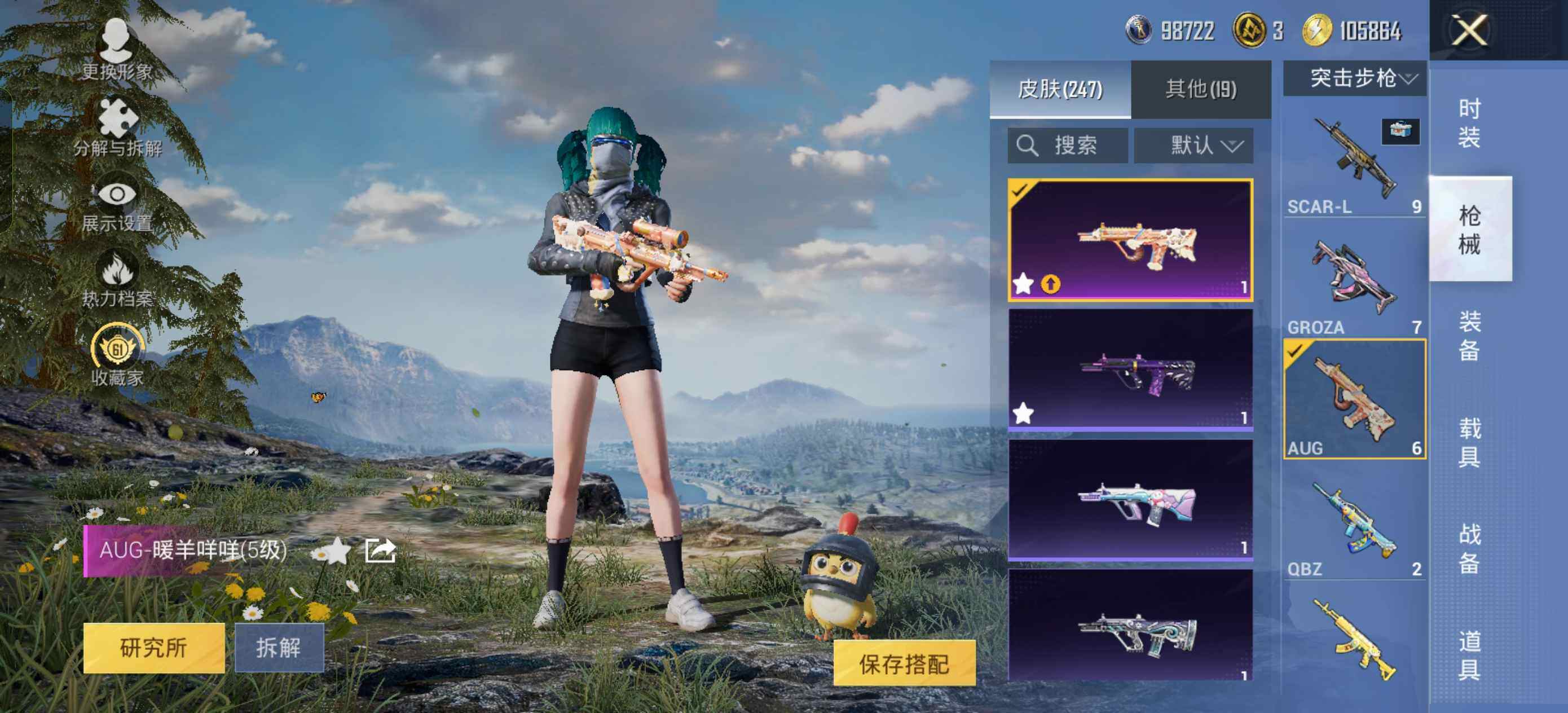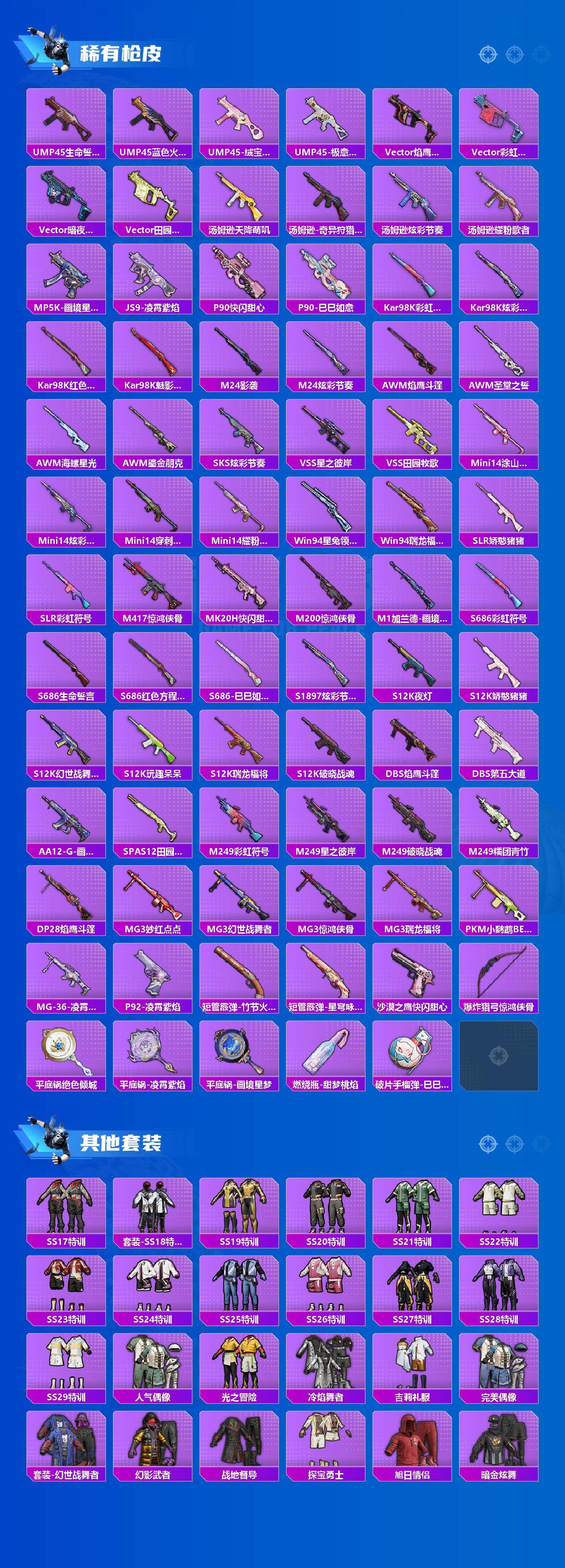 【粉色枪皮等级】:M416-电玩时刻(五级),GROZA-镜光银凌(五级),AUG-暖羊咩咩(五级),AKS-74U-森灵之息(五级),Kar98K-巳巳如意(五