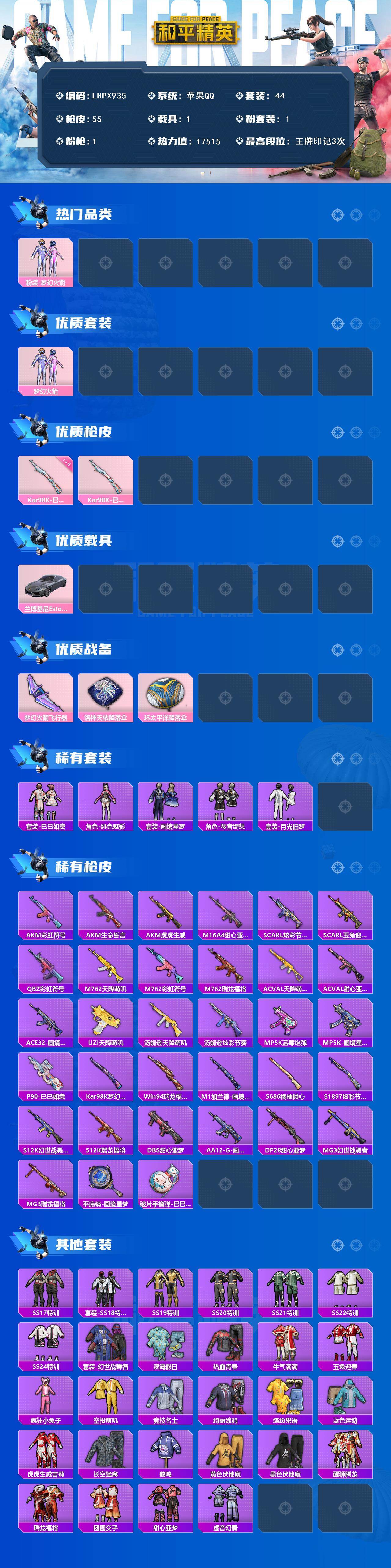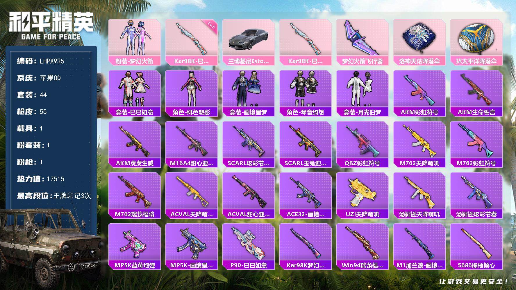 可二次【特价出售/店主推荐】苹果 手Q-1粉装-1特效枪-1载具-1粉色飞行器-17515热力值-3王牌印记-44套装-55枪皮