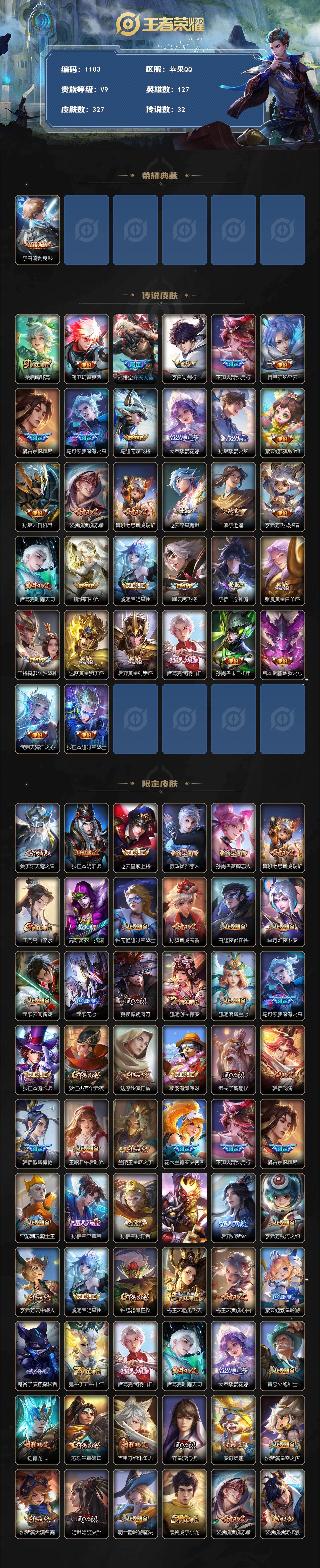 西游记天幕 金虎啸春 水晶333抽 苹果Q-V9-至尊星耀V段位-127英雄-327皮肤-1典藏皮肤-32传说-98史诗