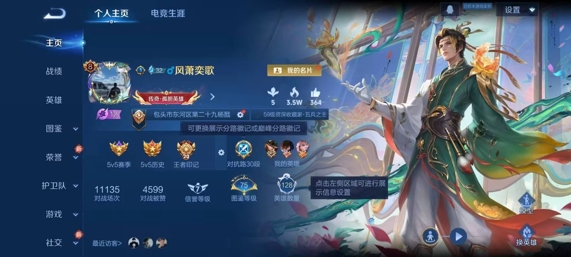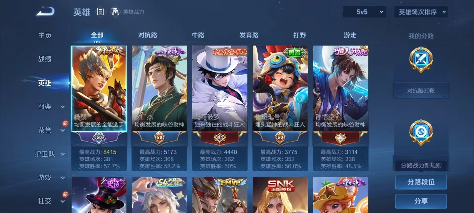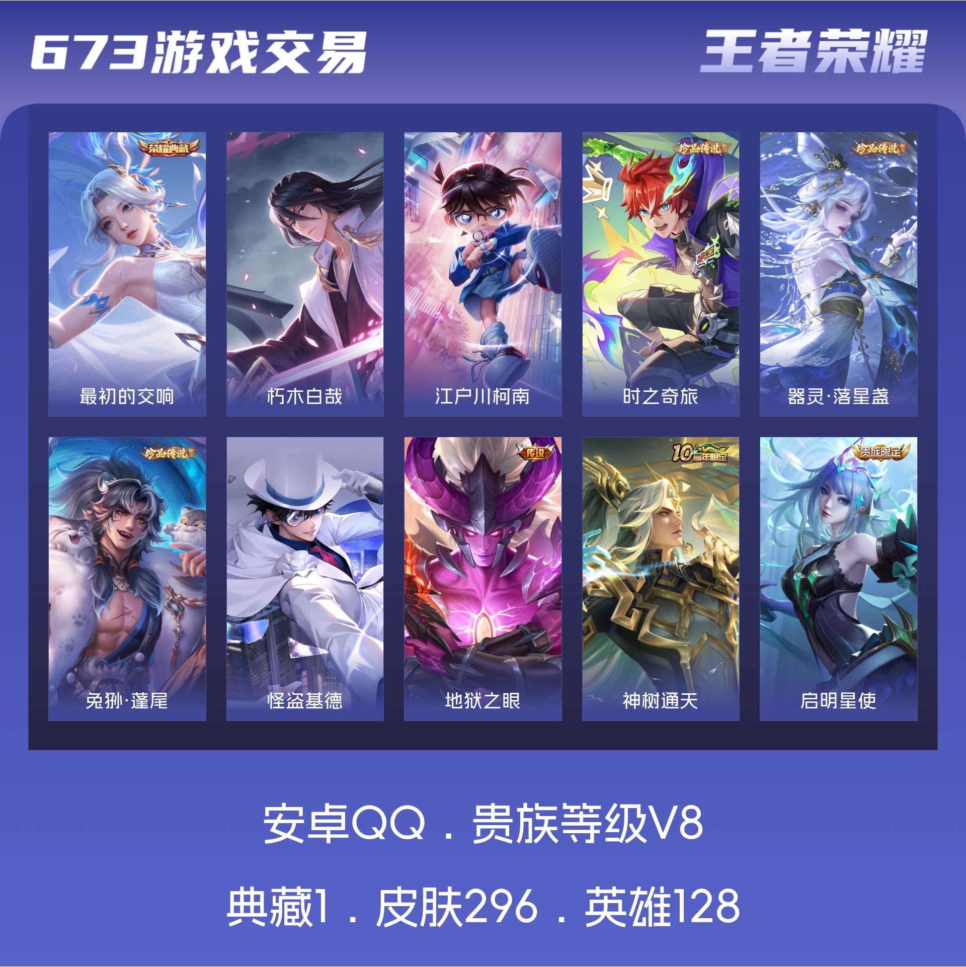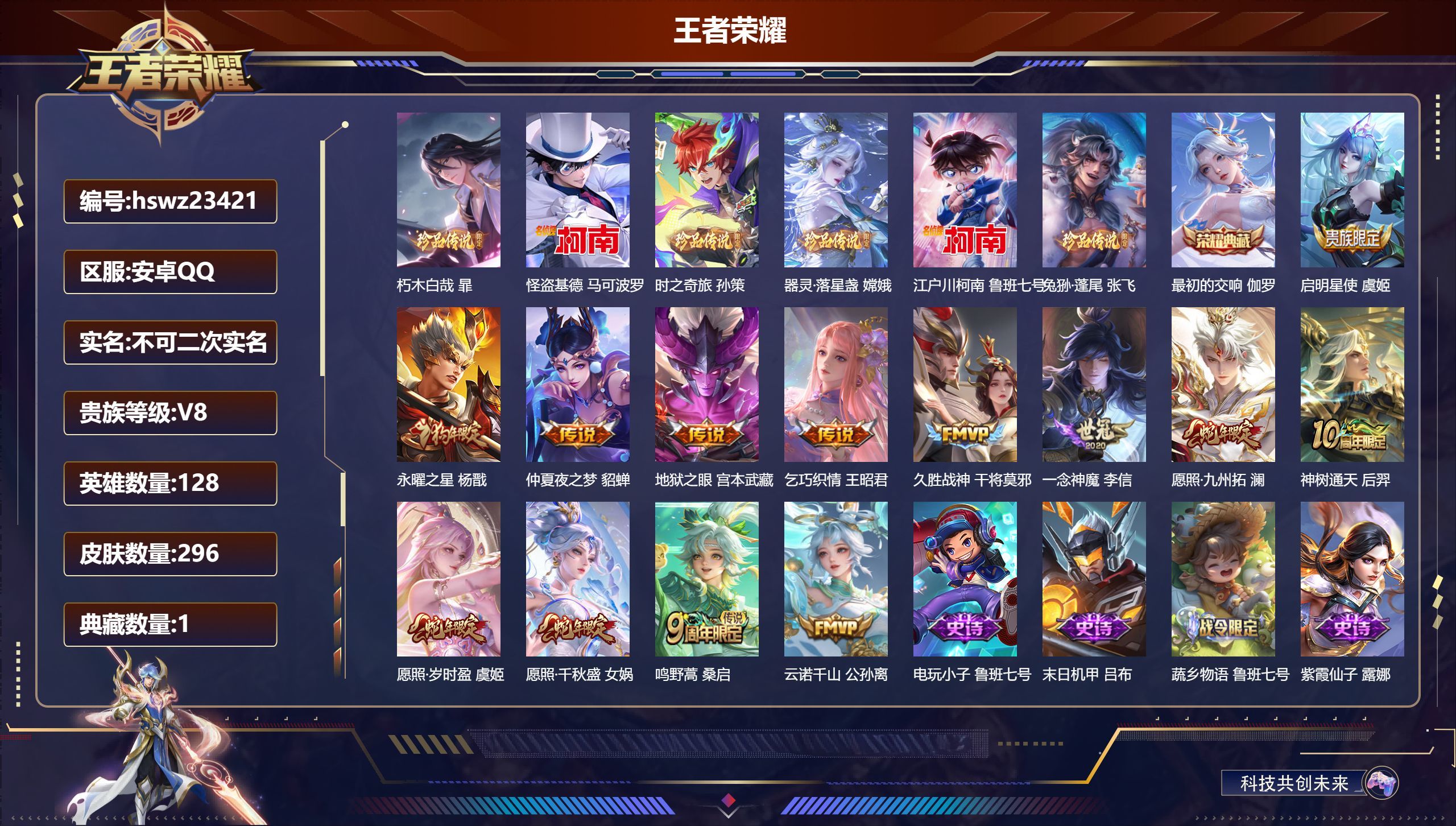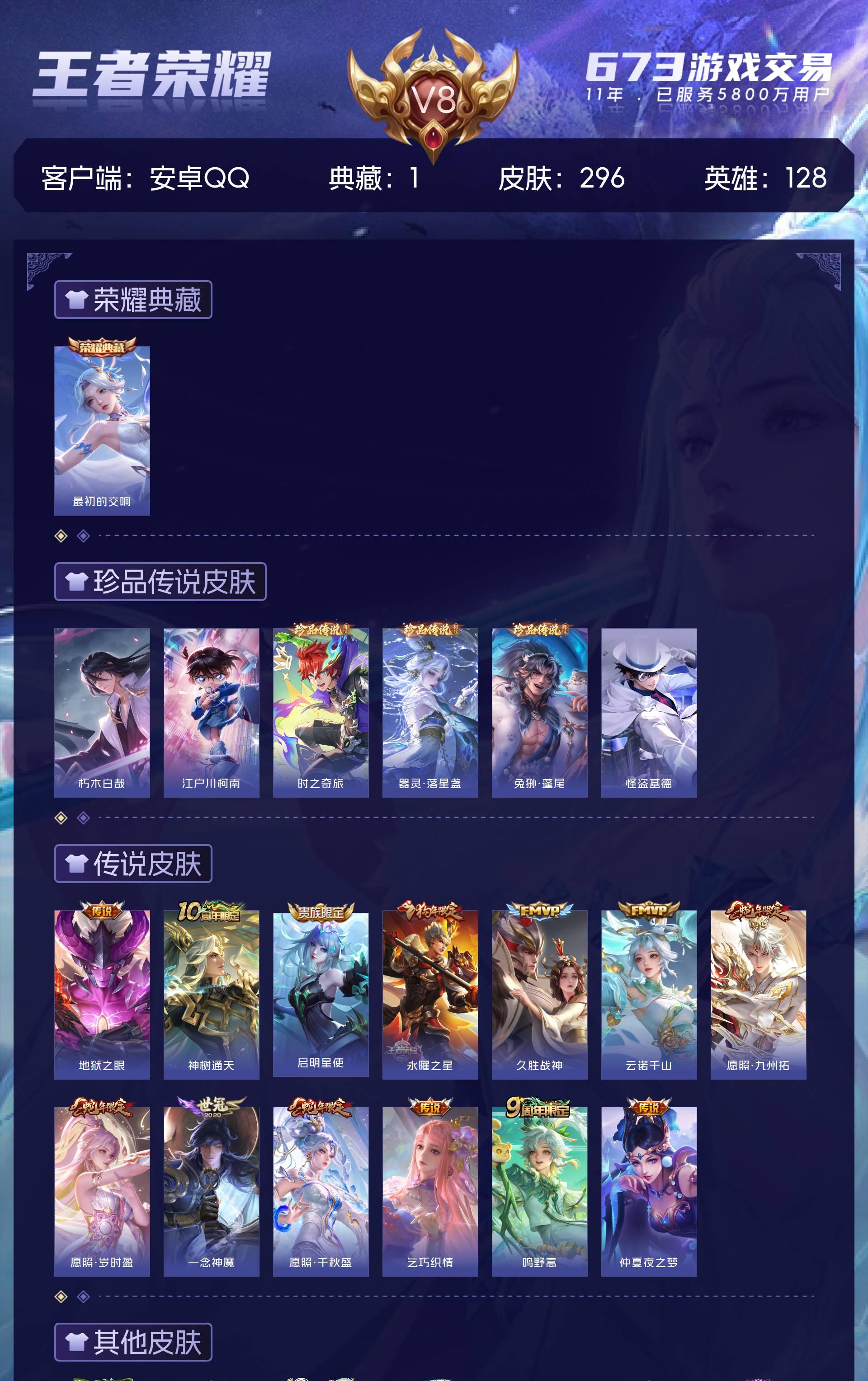 安卓QQ/非凡王者/296皮肤/128英雄/1典藏/0珍品无双/0无双/6珍品传说/13传说/95史