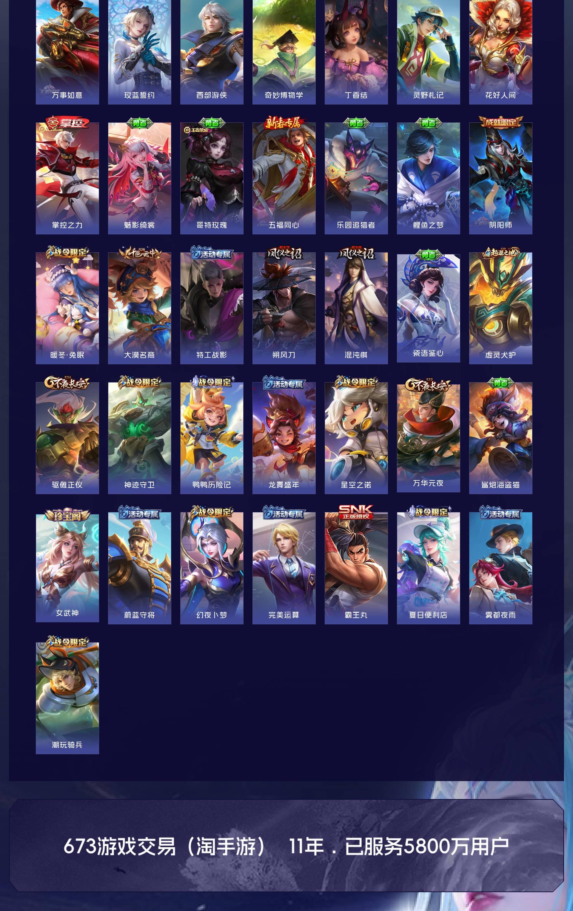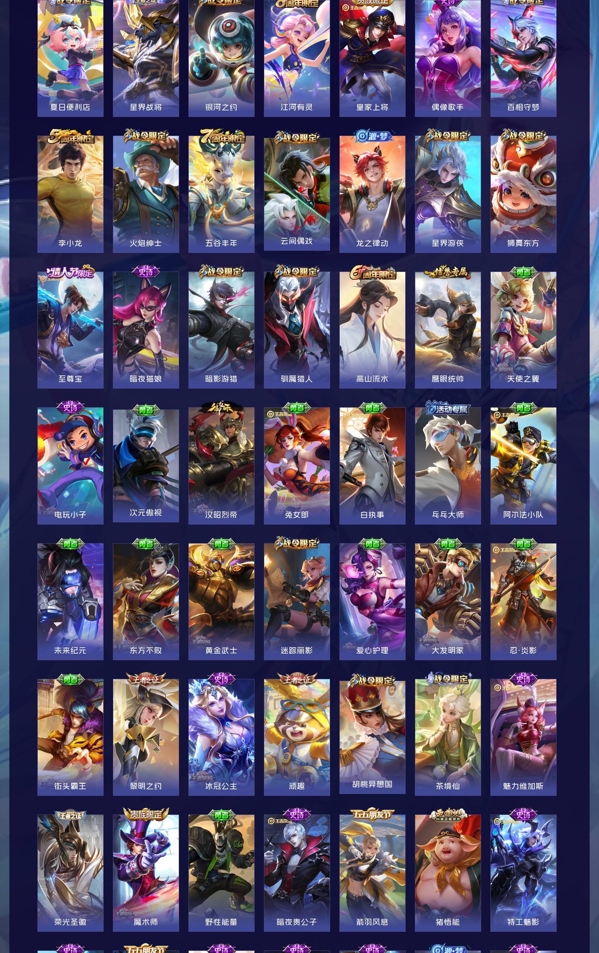 V8 皮肤296 英雄128 非凡王者 荣耀典藏1 珍品传说6 传说13 其他皮肤281