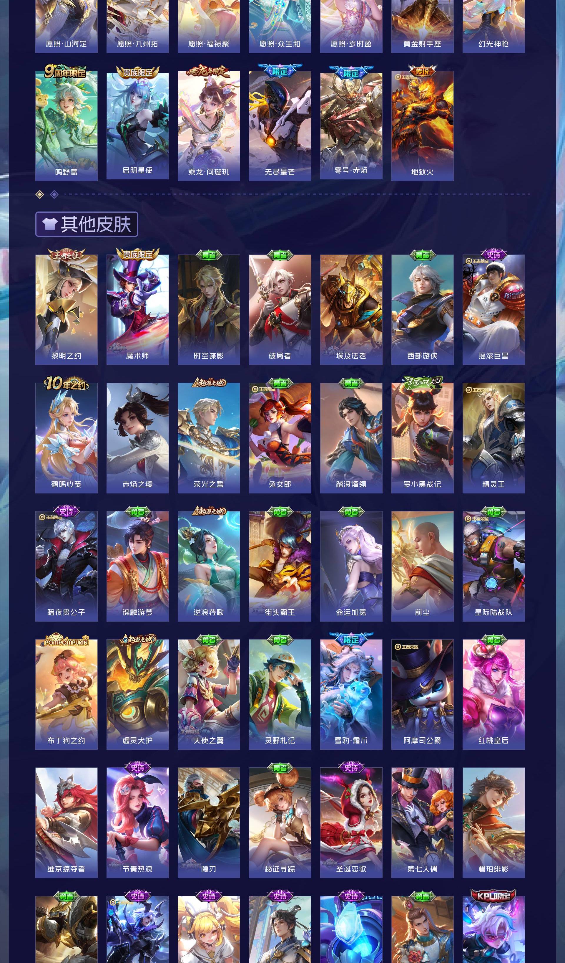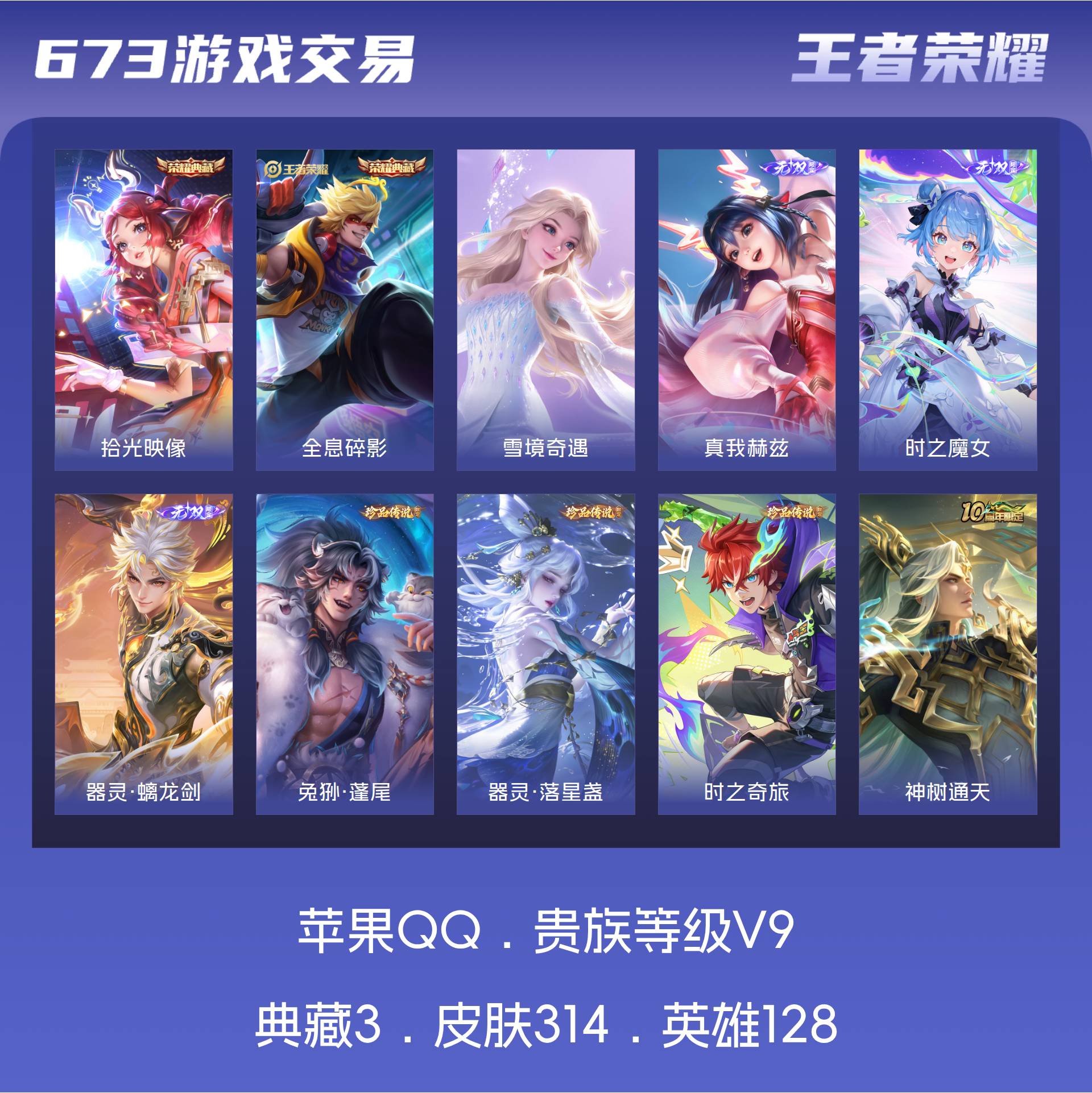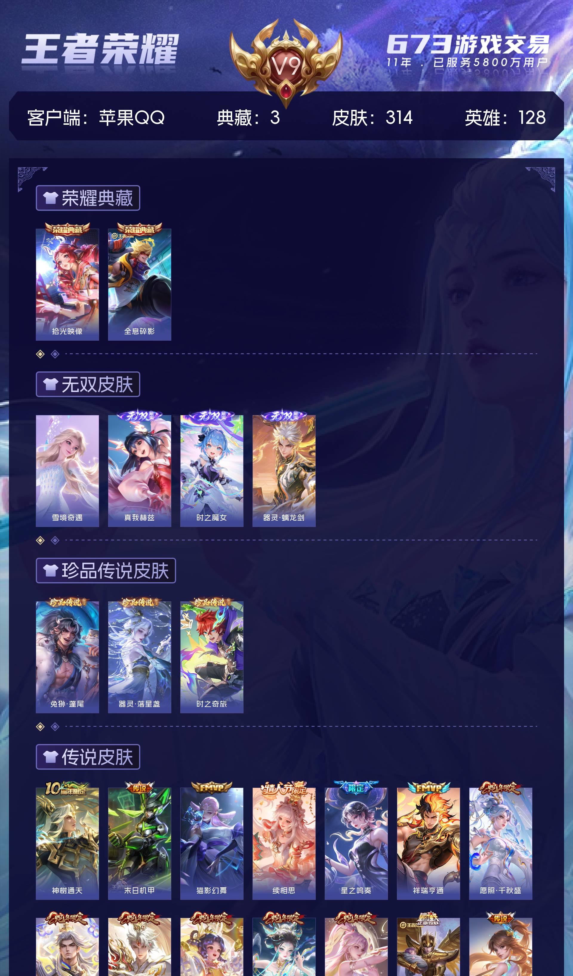 V9 皮肤314 英雄128 荣耀王者 荣耀典藏3 无双皮肤4 珍品传说3 星传说1 传说20 其他皮肤290