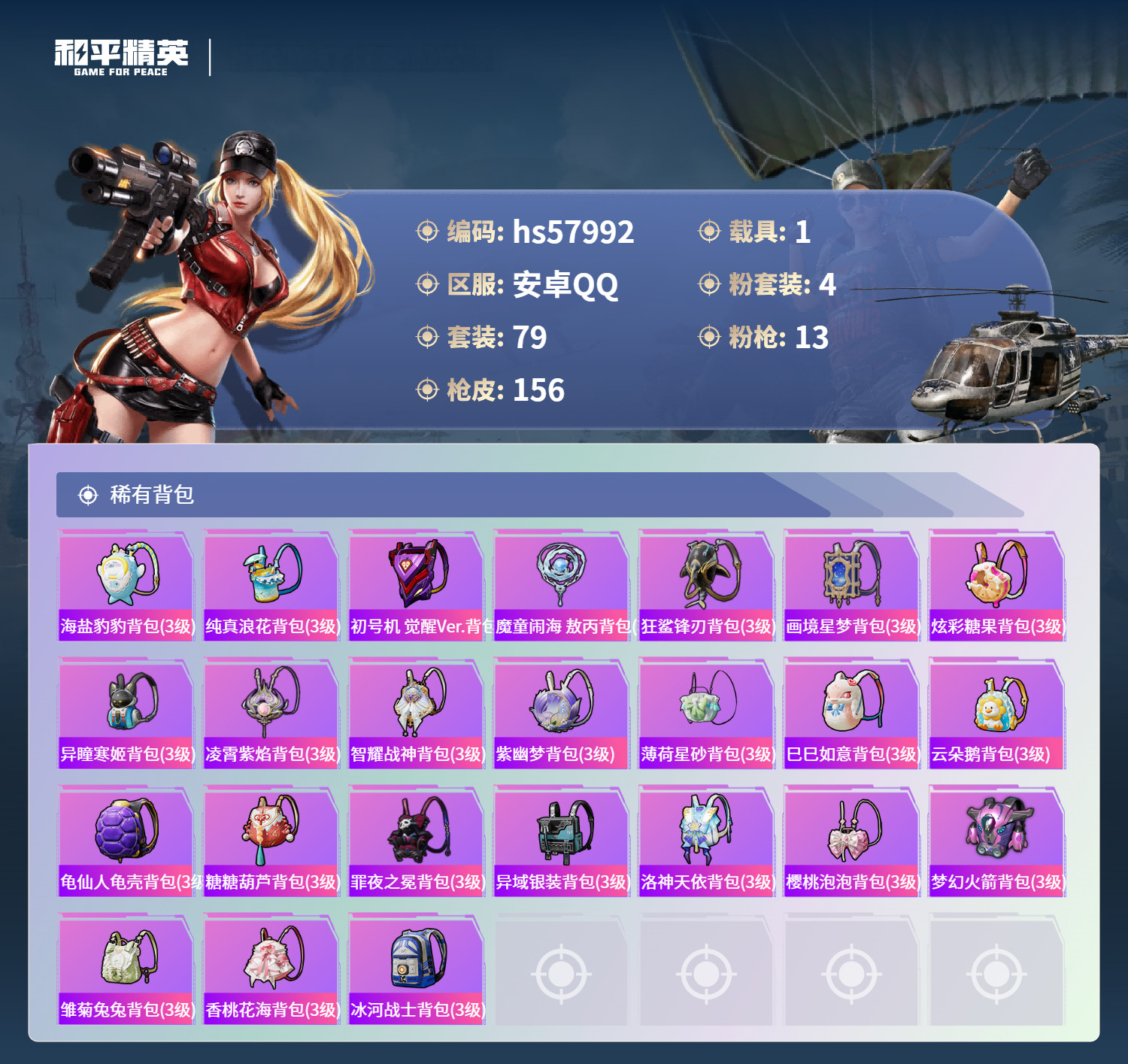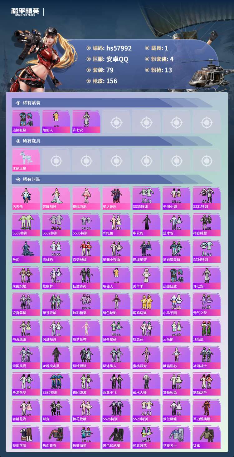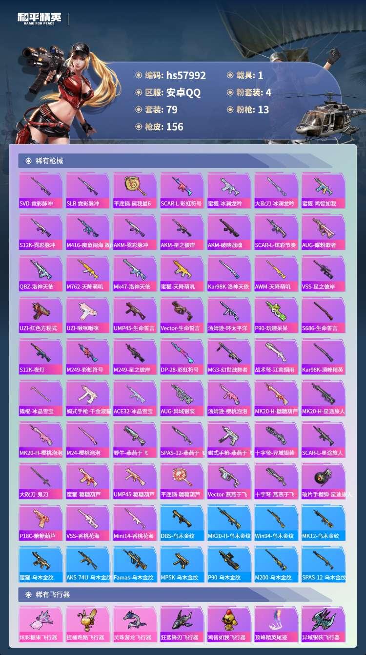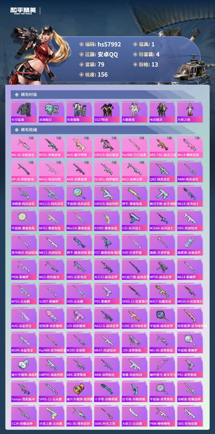 hs57992 安卓手Q-8王牌印记-4粉装-13特效枪-1载具-47422热力值-79套装-156