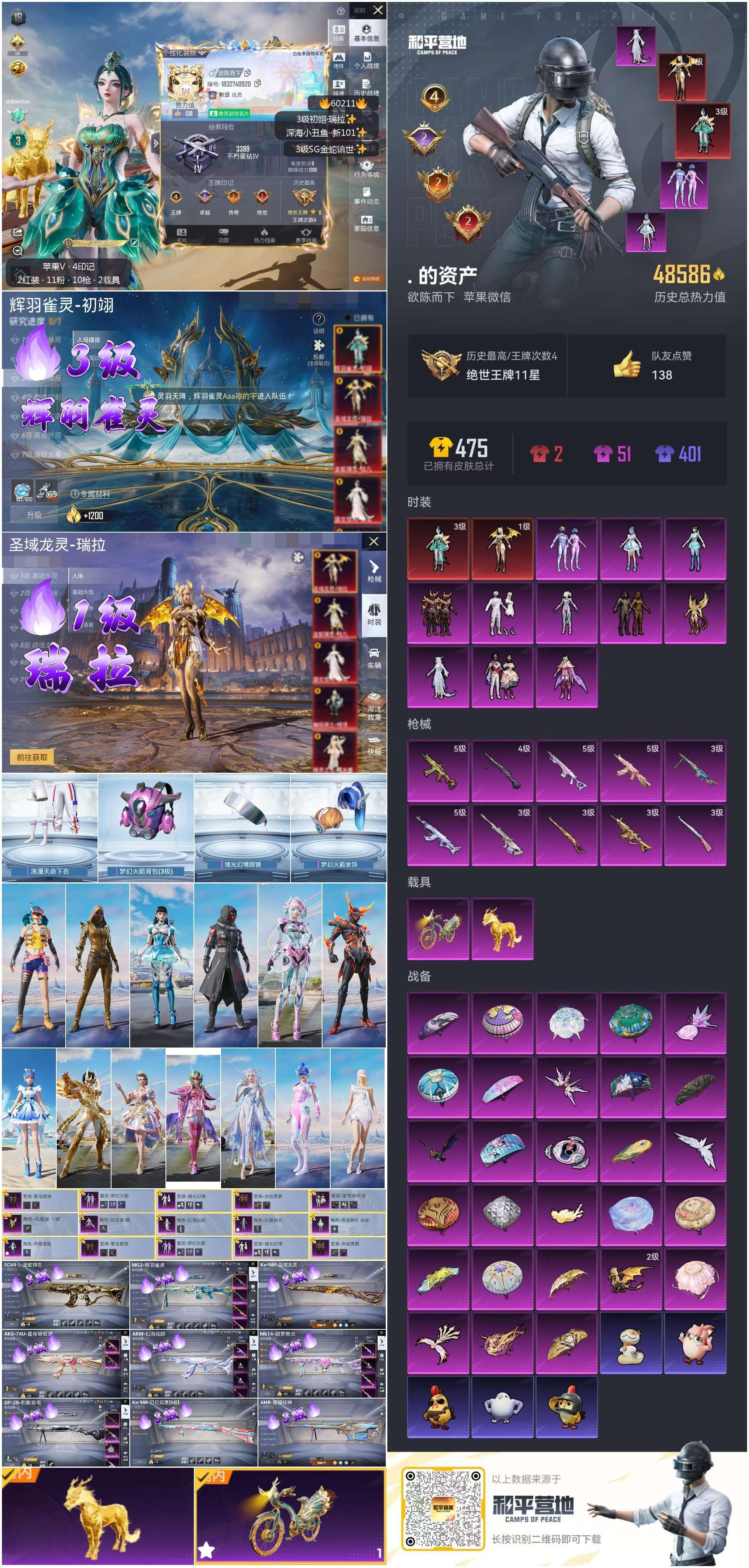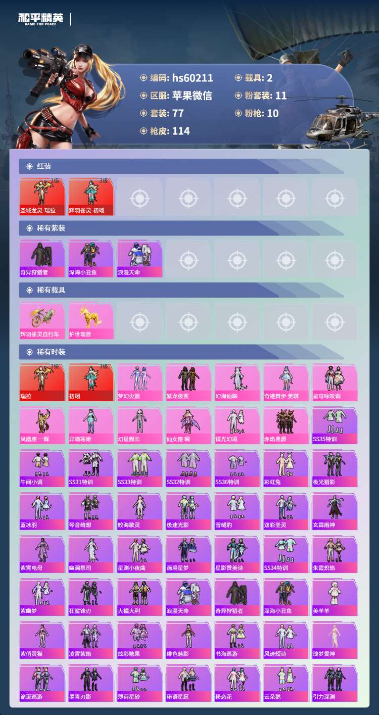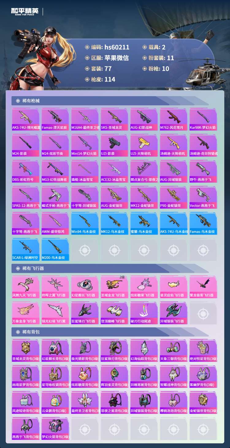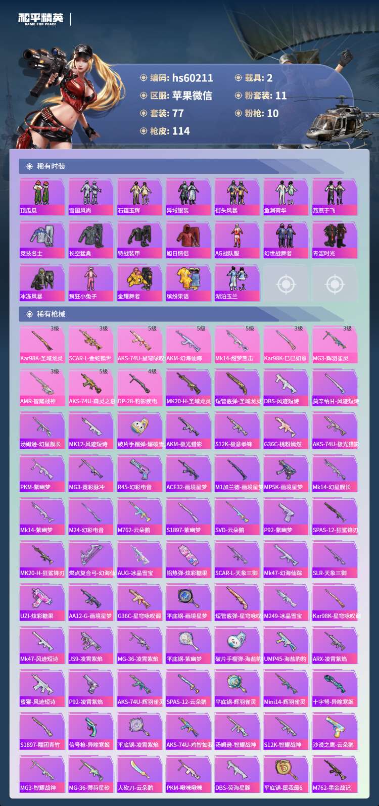 hs60211 苹果微-4王牌印记-2红装-11粉装-10特效枪-2载具-48586热力值-77套