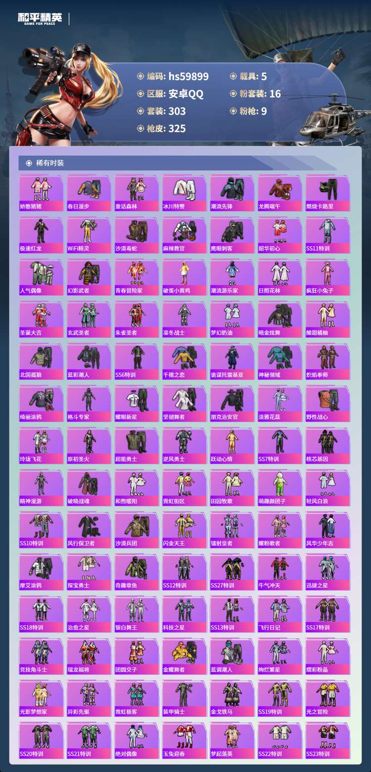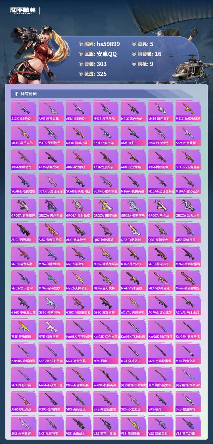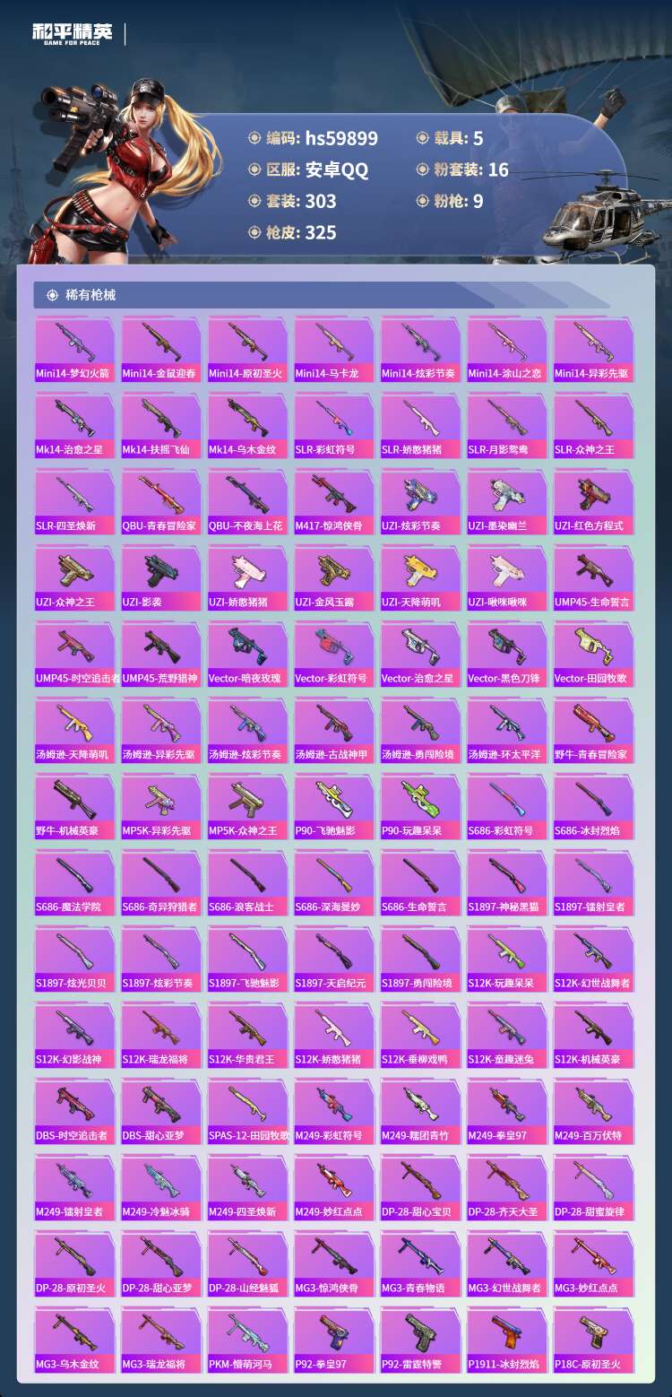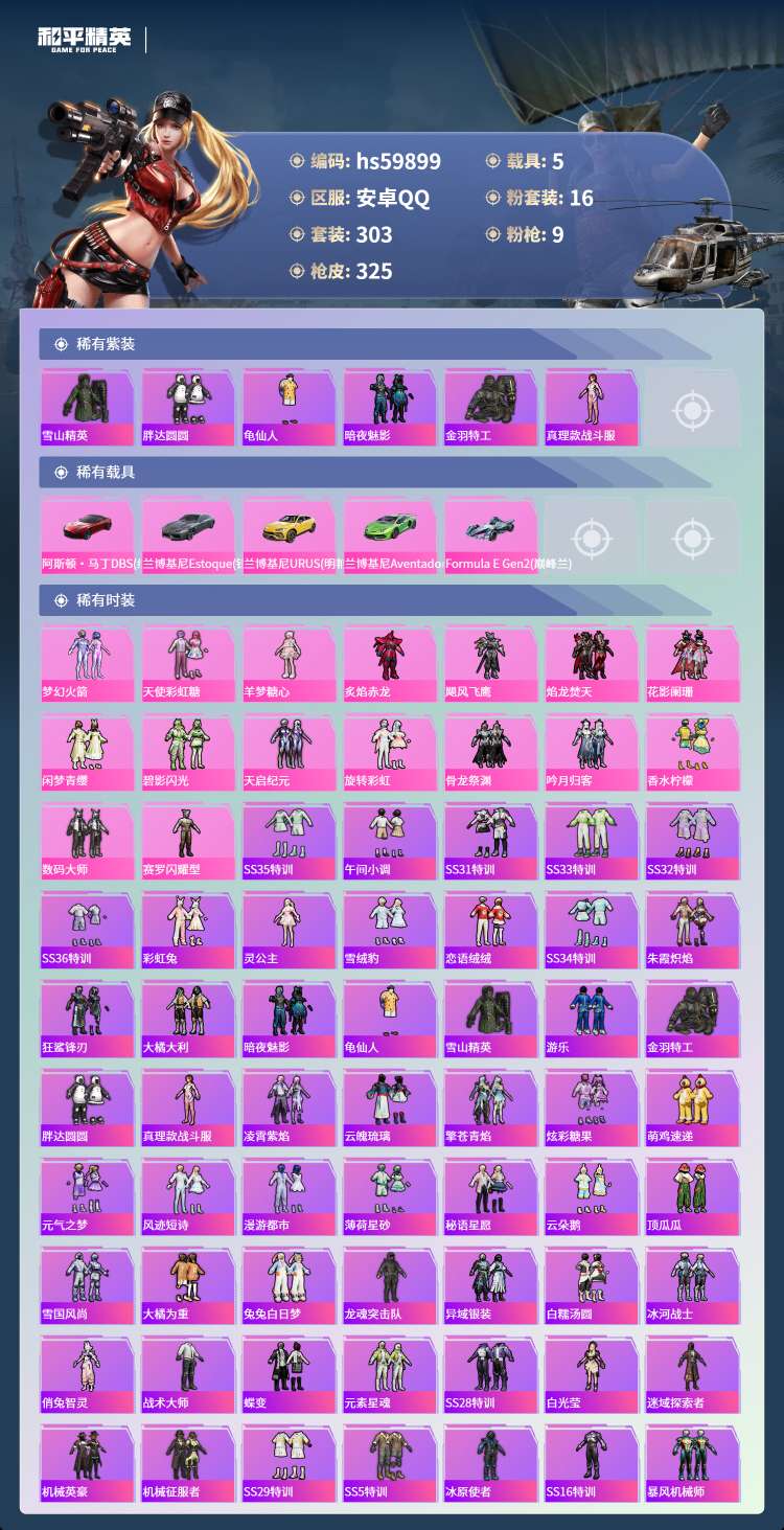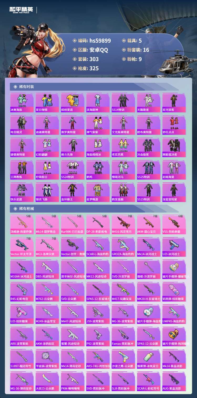 hs59899 安卓手Q-18王牌印记-16粉装-9特效枪-5载具-123140热力值-303套装-