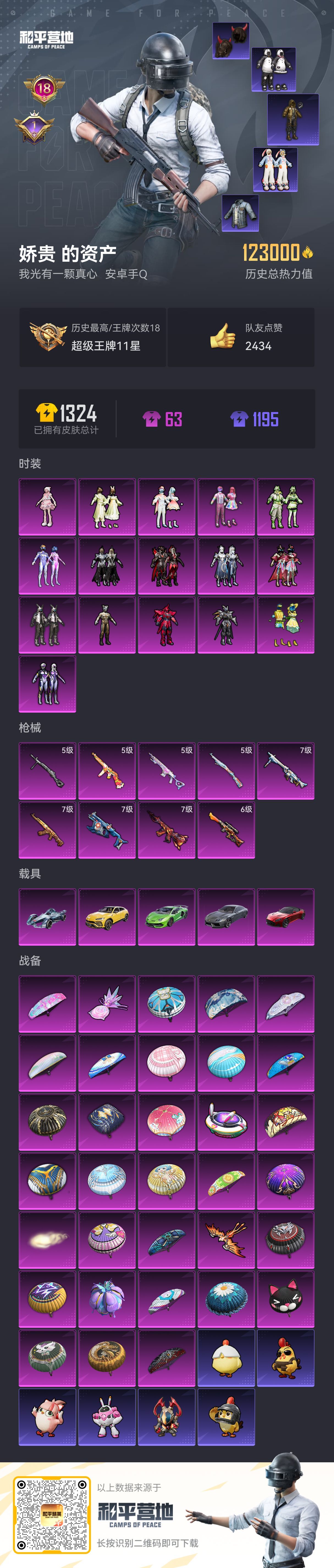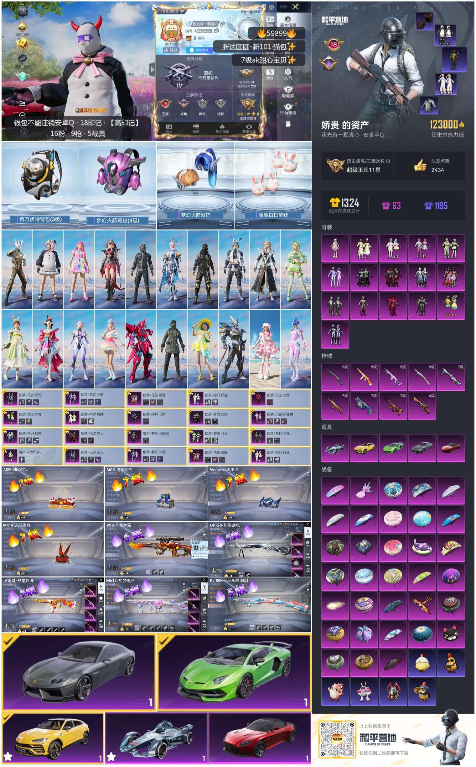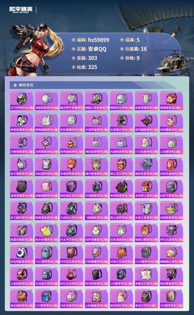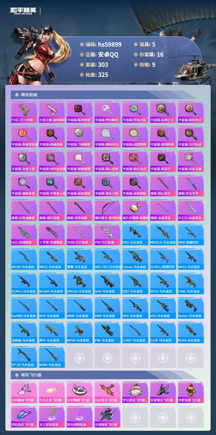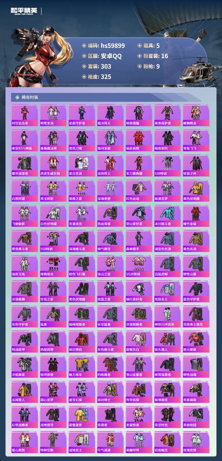 hs59899 安卓手Q-18王牌印记-16粉装-9特效枪-5载具-123140热力值-303套装-