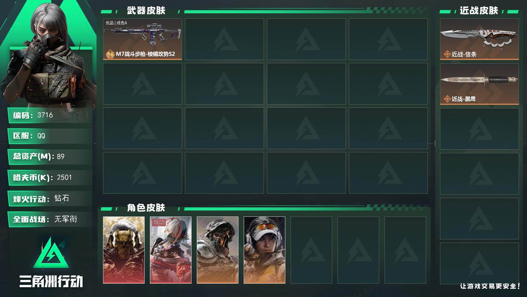 总资产89.4m/信条捆绑包/蚀金玫瑰/戴什维尔/金牌射手/不破誓约/优品a品质m7,红狼-蚀金玫瑰,骇爪-维什戴尔,露娜-金牌射手,深蓝-不破誓约,近战-信条,近战-黑鹰,M7战斗步枪-棱镜攻势S2,M7战斗步枪-棱镜攻势S2(优品A)