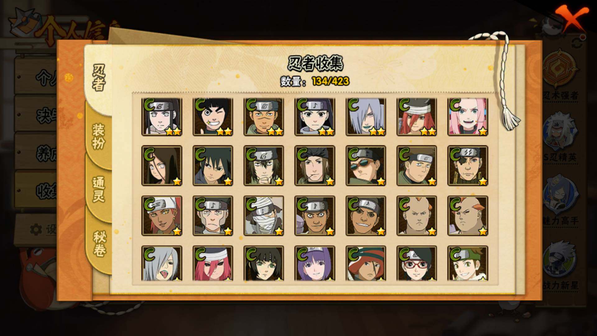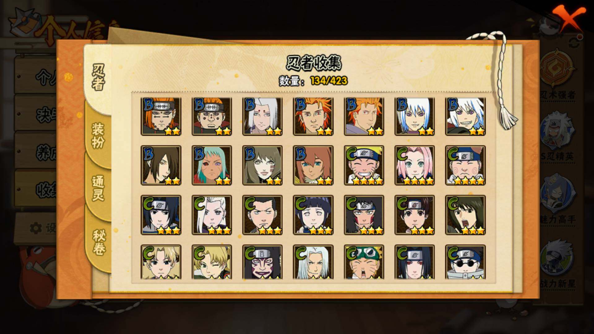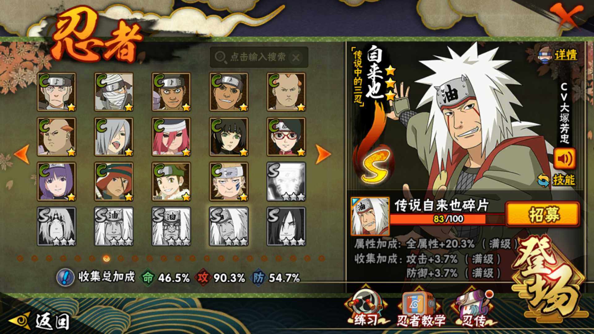 【S级忍者】:宇智波斑「秽土转生·解」(3星),宇智波带土「忍界大战」(3星),艾「忍界大战」(3星),宇智波鼬「须佐能乎」(3星),旗木卡卡西「须佐能乎」(3星),千手柱间「木叶创立」(3星),自来也「舞之豪杰」(3星),波风水门(3星),佩恩「天道」(3星),宇智波佐助「永恒万花筒」(3星),大筒