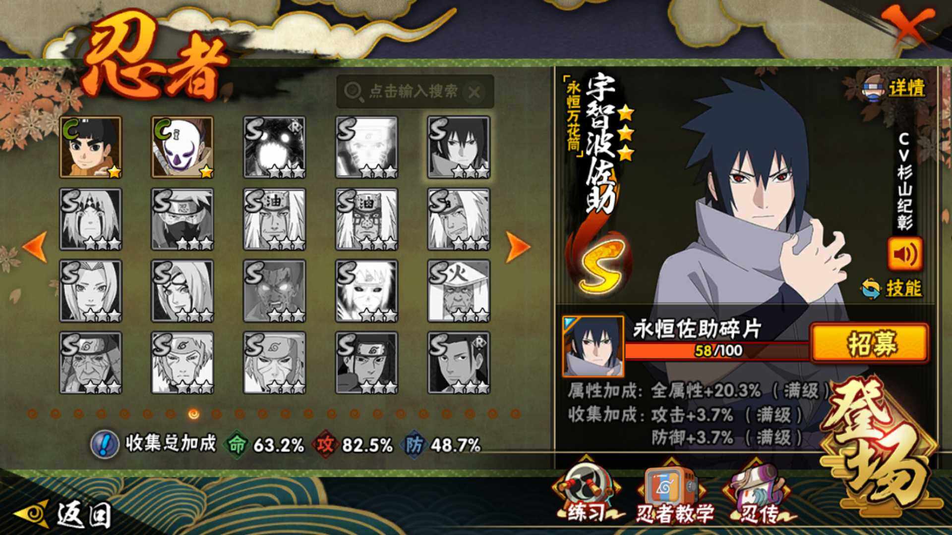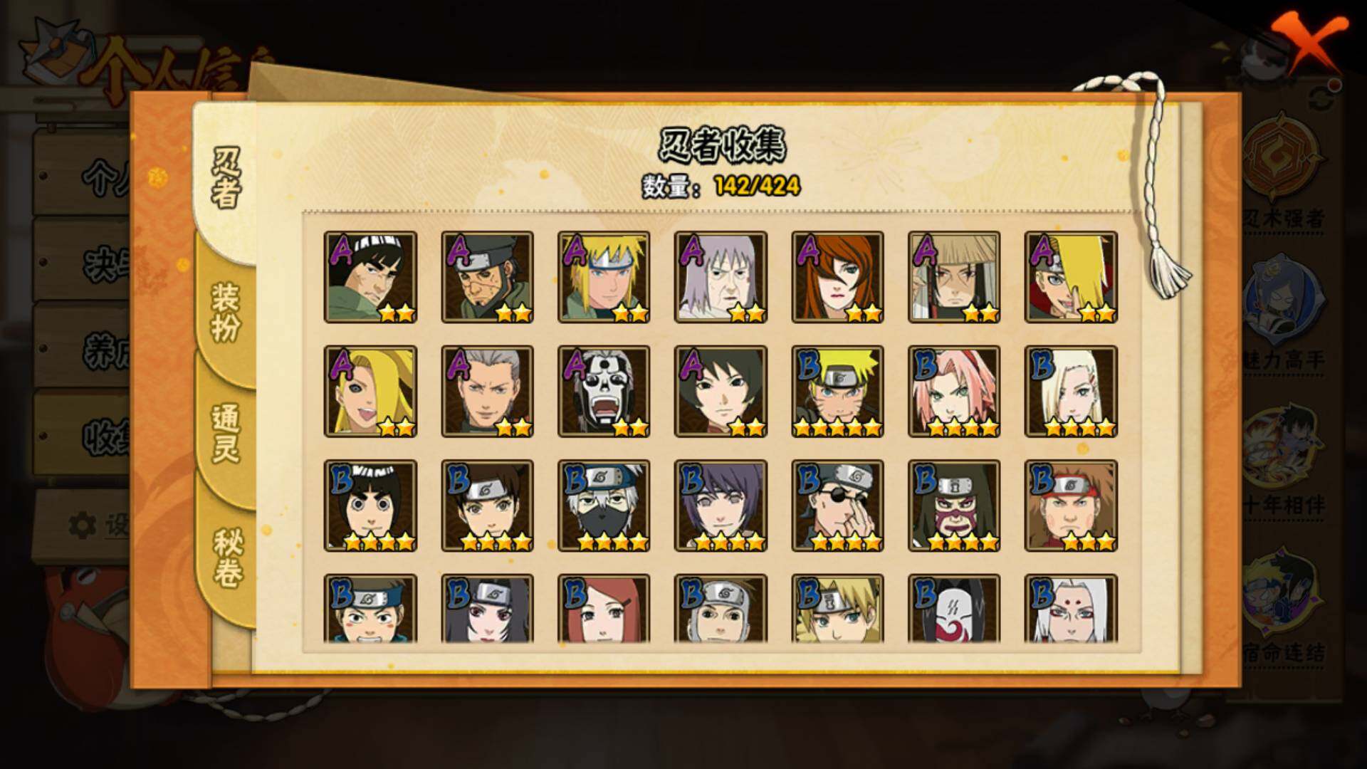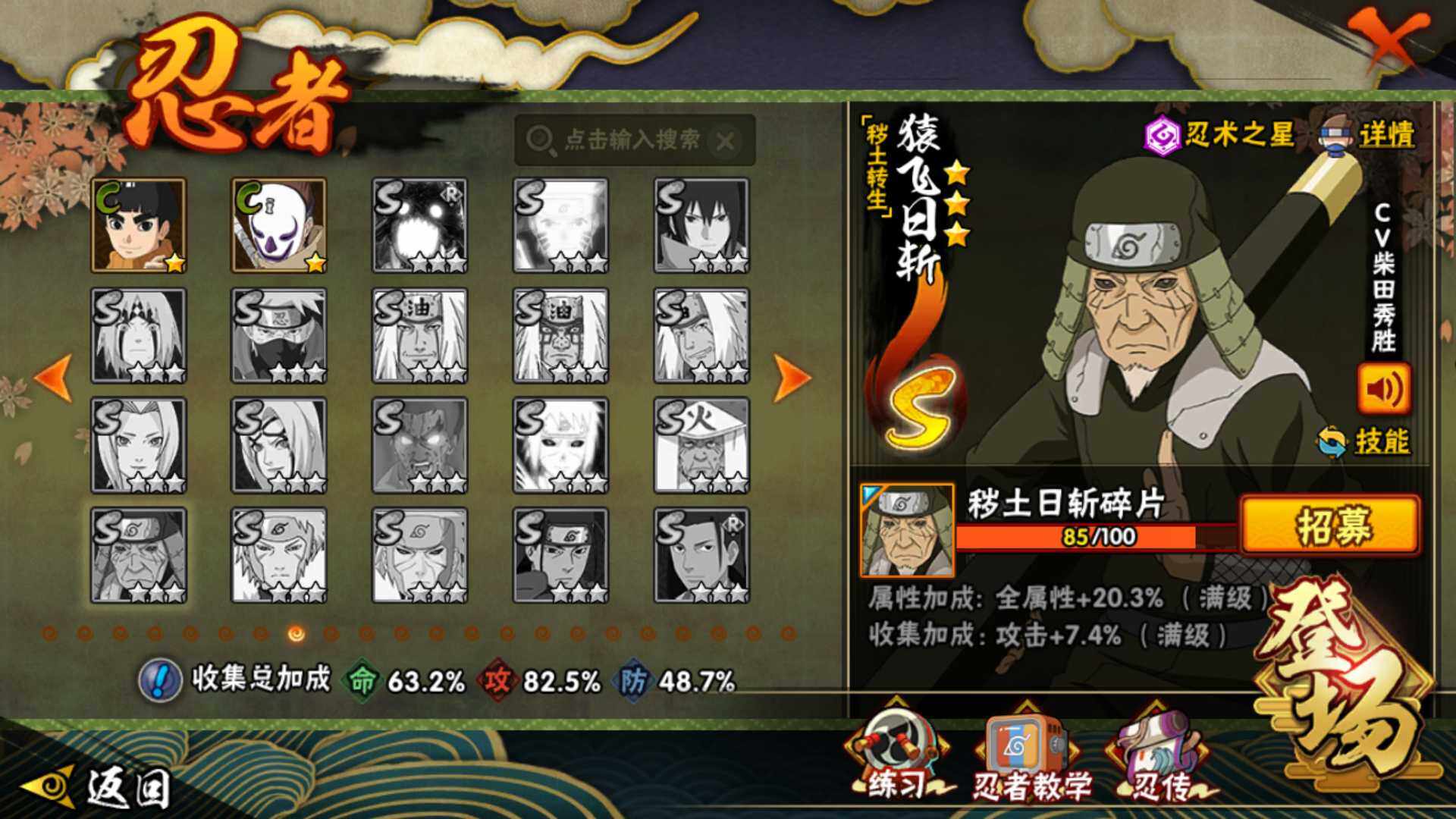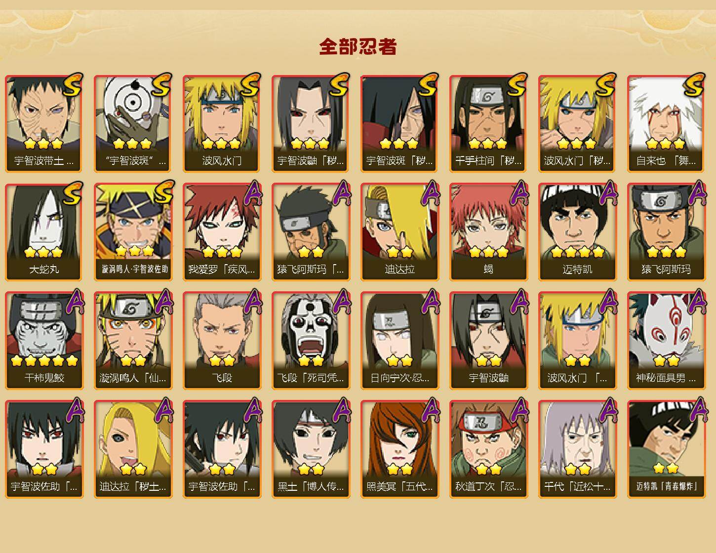 【S级忍者】:波风水门「秽土转生」(3星),千手柱间「秽土转生」(3星),宇智波鼬「秽土转生」(3星),宇智波斑「秽土转生」(3星),宇智波带土「忍界大战」(3星),自来也「舞之豪杰」(3星),大蛇丸(3星),波风水门(3星),宇智