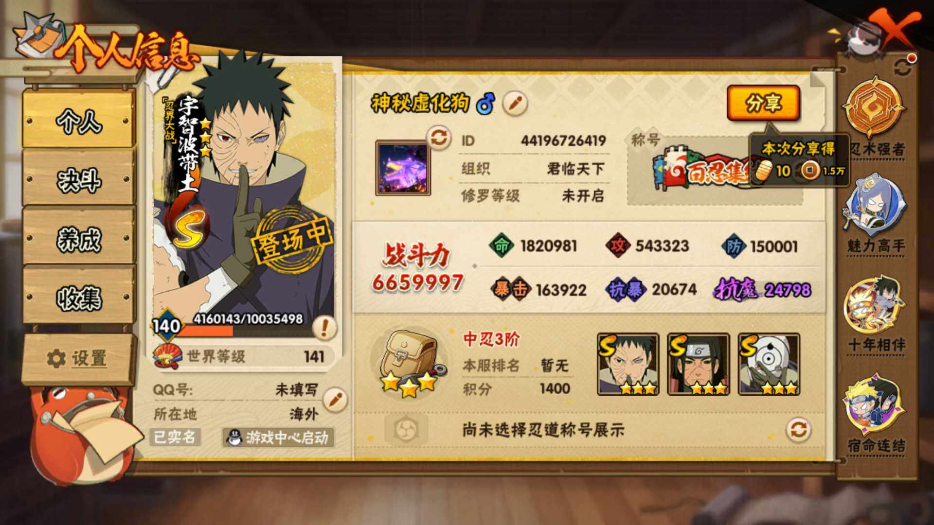 (可免费转苹果)v5 10S 22A 665w战力 永恒佐助58片 秽土日斩85片 热门A忍:神秘面具男忍者之路 1个主场景:木叶周年庆 1453金币 YY1892
