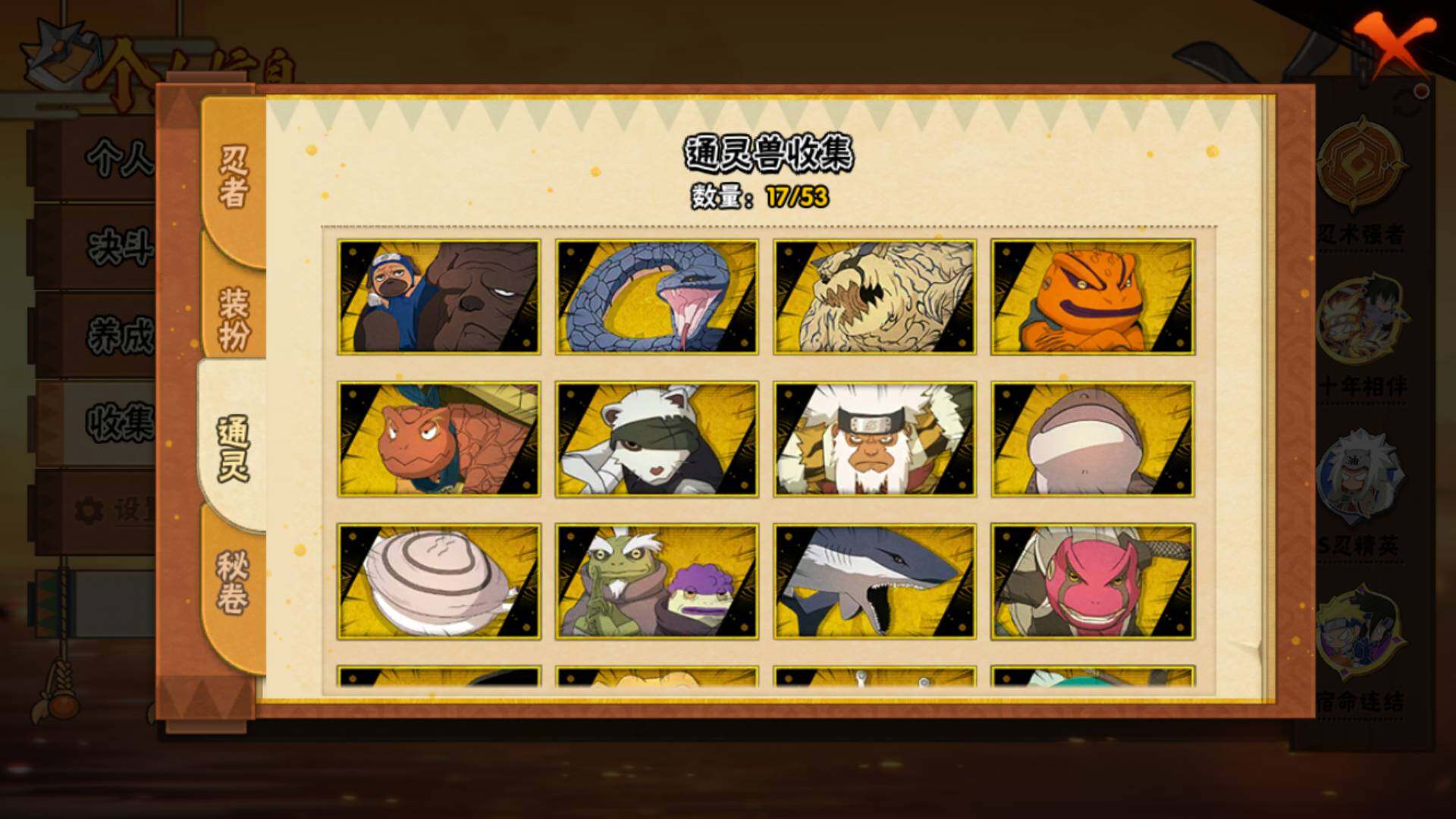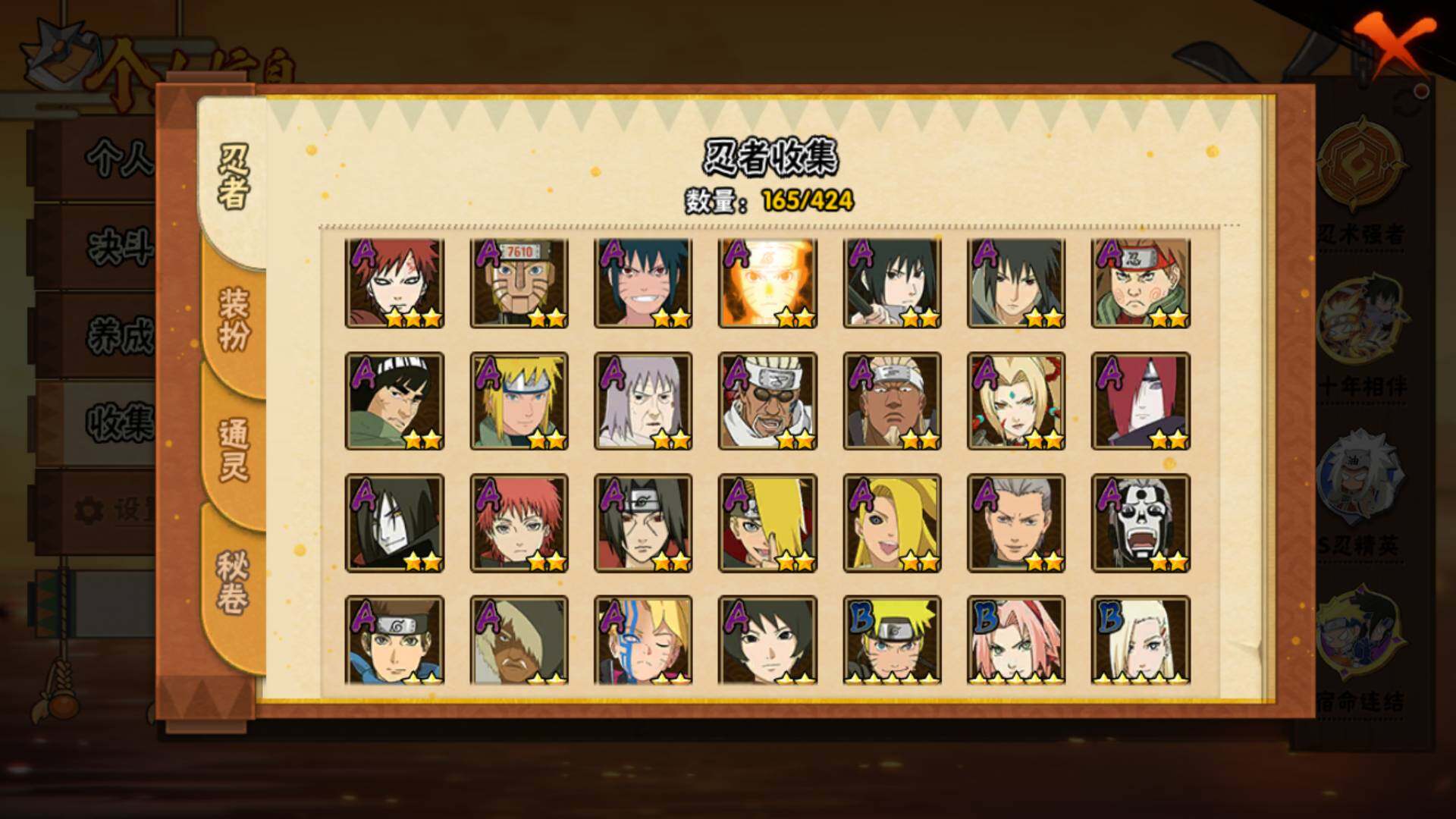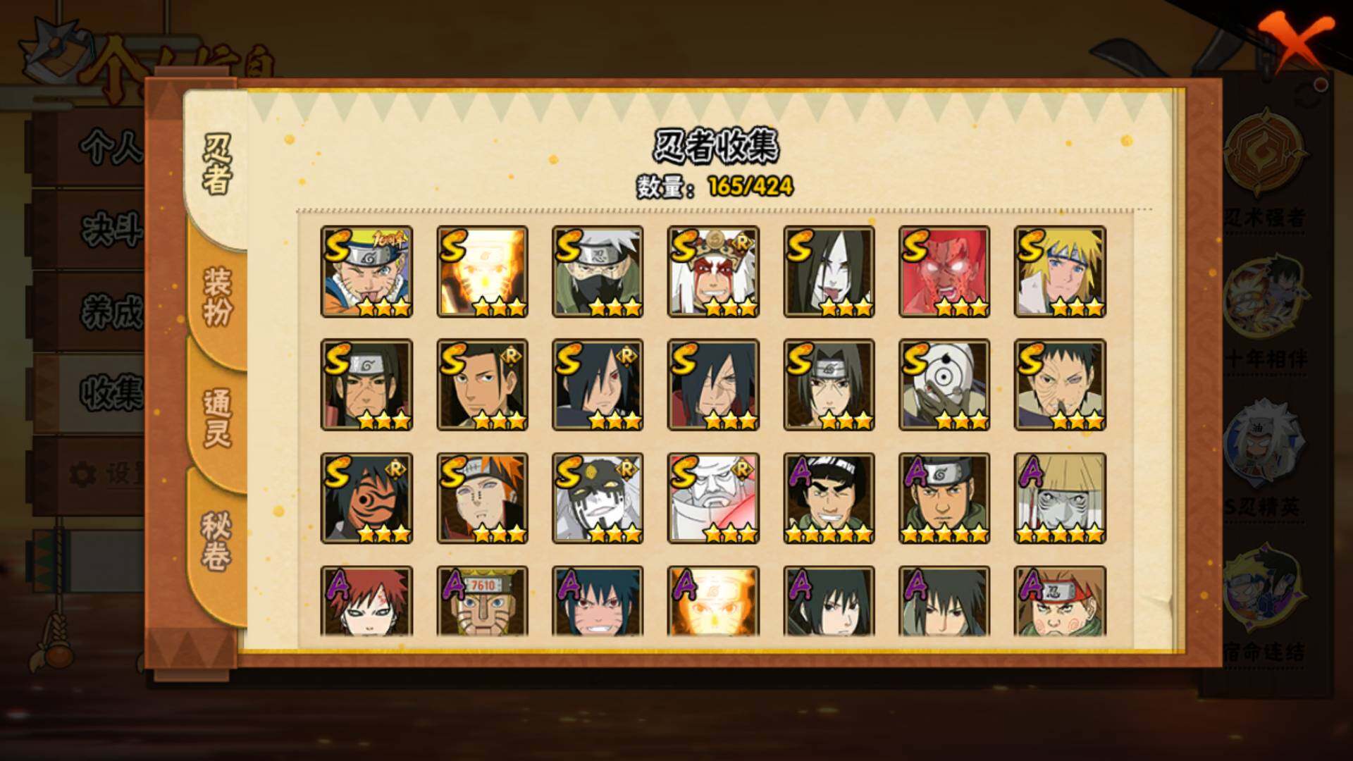 【S级忍者】:千手柱间「秽土转生」(3星),宇智波斑「秽土转生·解」(3星),宇智波带土「忍界大战」(3星),宇智波鼬「须佐能乎」(3星),旗木卡卡西「须佐能乎」(3星),宇智波斑「木叶创立」(3星),千手柱间「木叶创立」(3星),自来也「舞之豪杰」(3星),大蛇丸(3星),波风水门(3星),神秘面具男「红夜之刃」(3星),漩涡鸣人