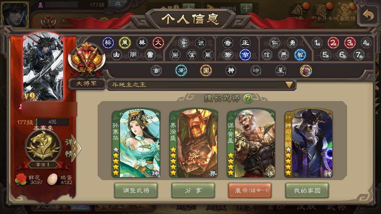 【1359】官阶:大将军;VIP等级:VIP9;史诗武将数量:44;动态皮肤数量:42;武将总数:334;史诗宝珠数量:2;将魂数量:12332;神将:4;魏国史诗武将:16;蜀国史诗武将:8;吴国史诗武将:7;群史诗武将:16