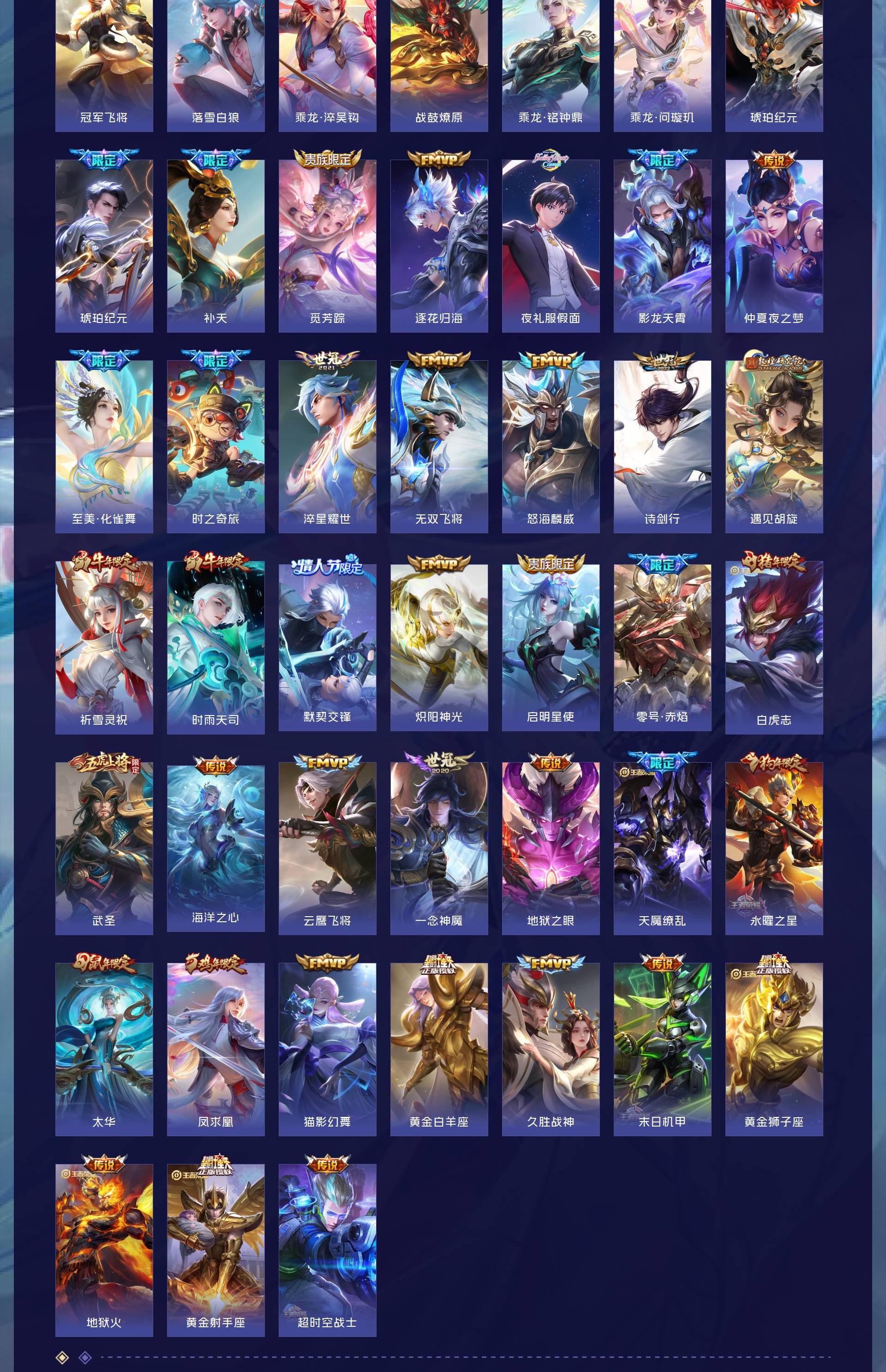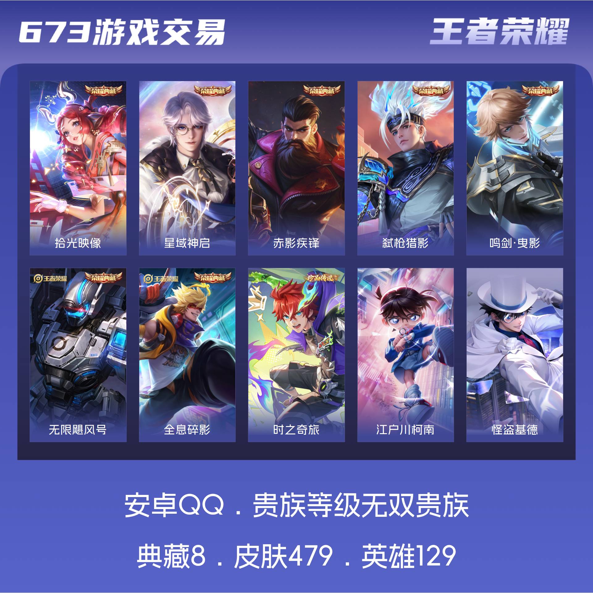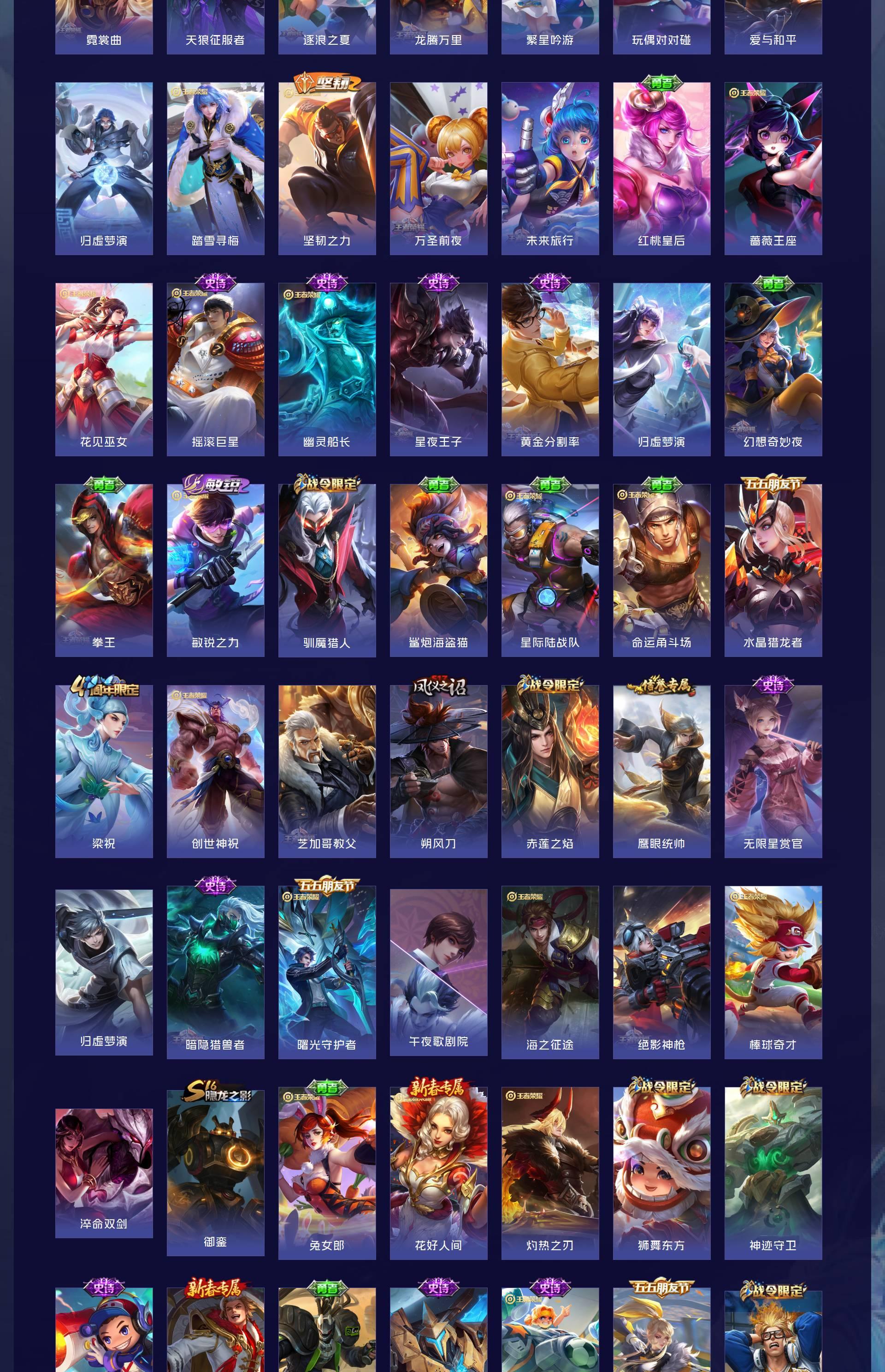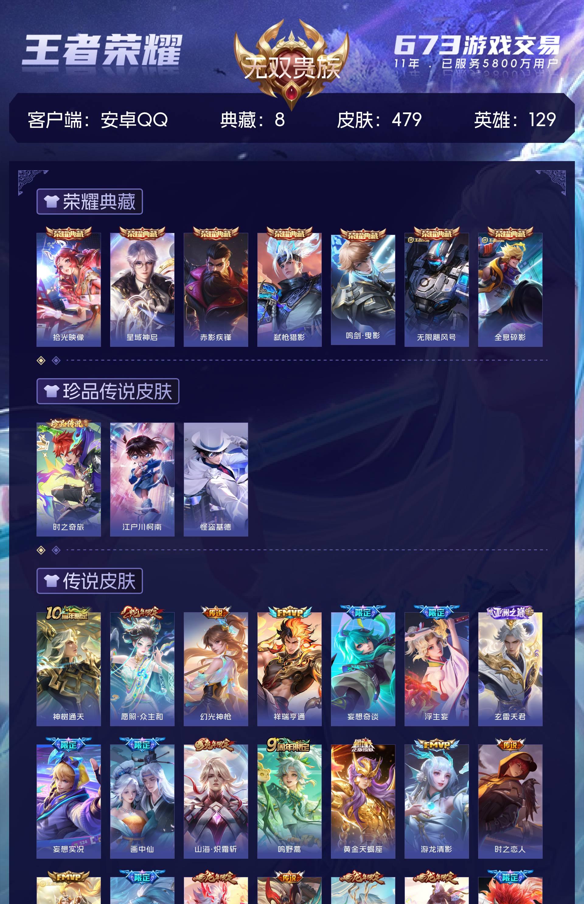 无双贵族 皮肤479 英雄129 最强王者 荣耀典藏8 珍品传说3 星传说1 传说60 其他皮肤415