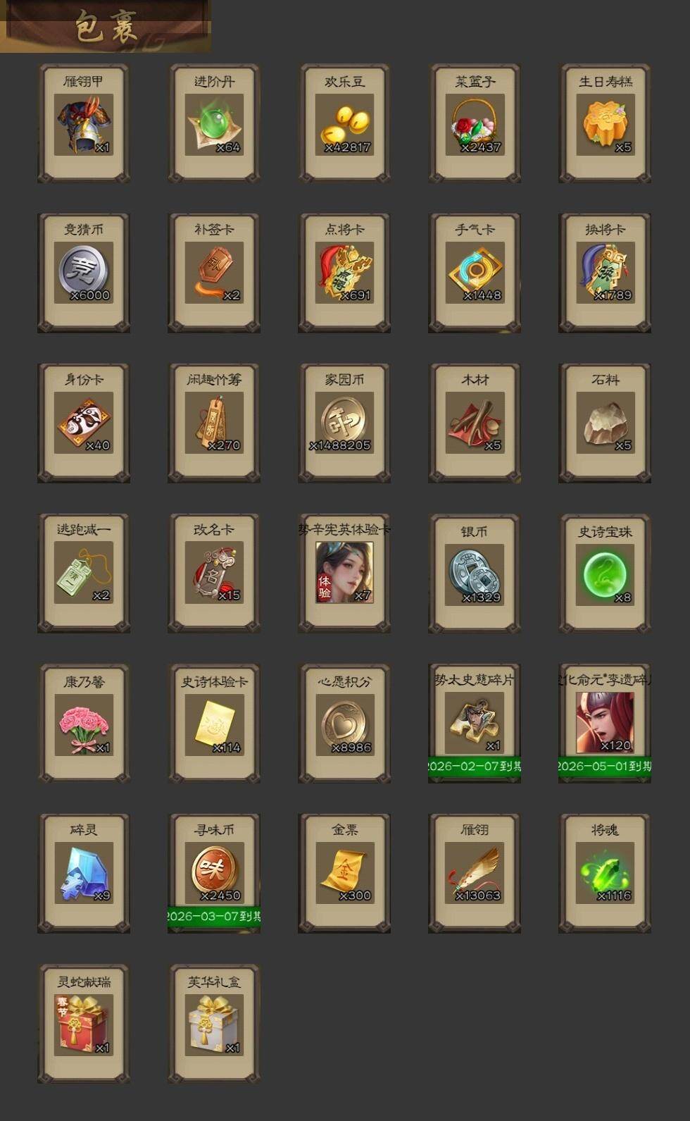 【1372】官阶:骠骑将军;VIP等级:VIP9;史诗武将数量:32;动态皮肤数量:25;武将总数:331;史诗宝珠数量:8;将魂数量:1116;神将:2;魏国史诗武将:14;蜀国史诗武将:8;吴国史诗武将:6;群史诗武将:10