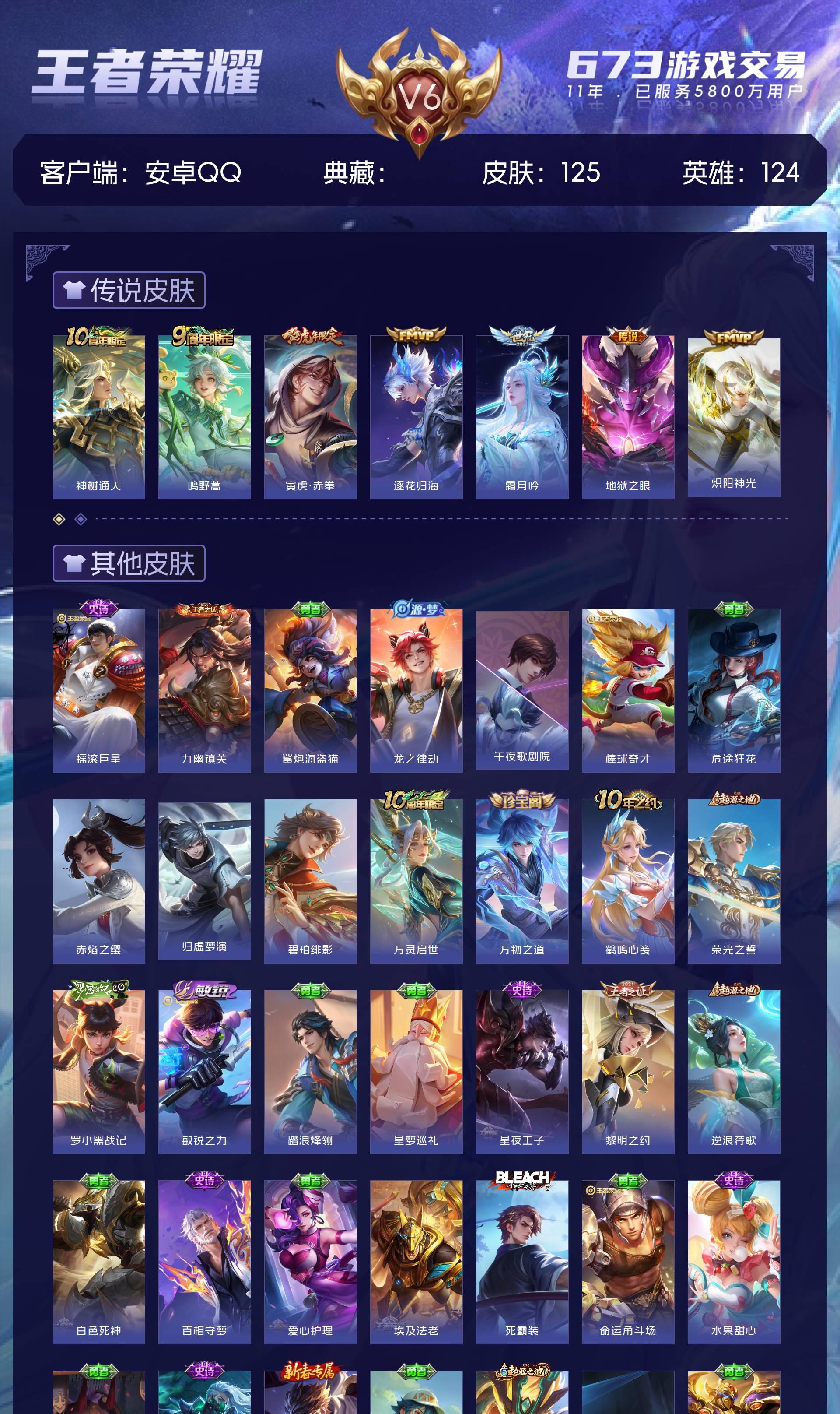 V6 皮肤125 英雄124 至尊星耀 传说7 其他皮肤123