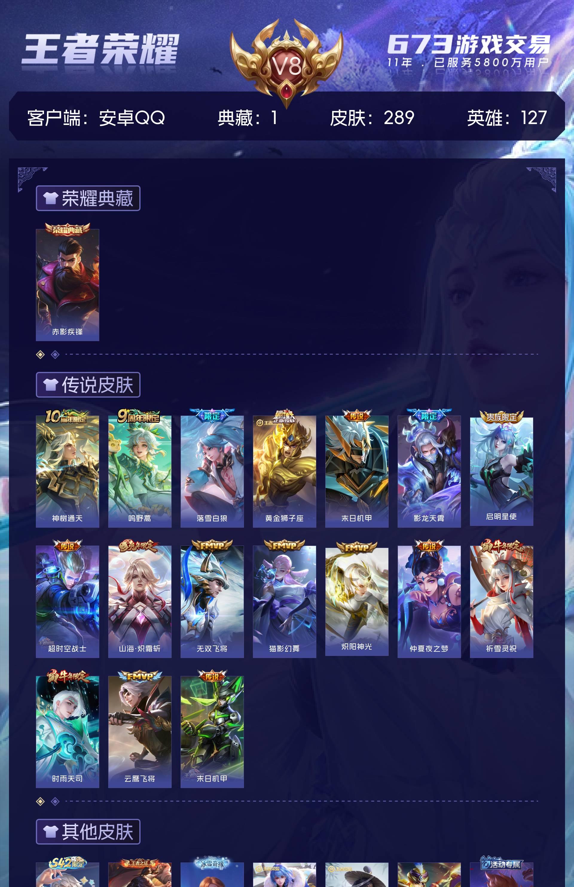V8 皮肤289 英雄127 最强王者 荣耀典藏1 传说18 其他皮肤276