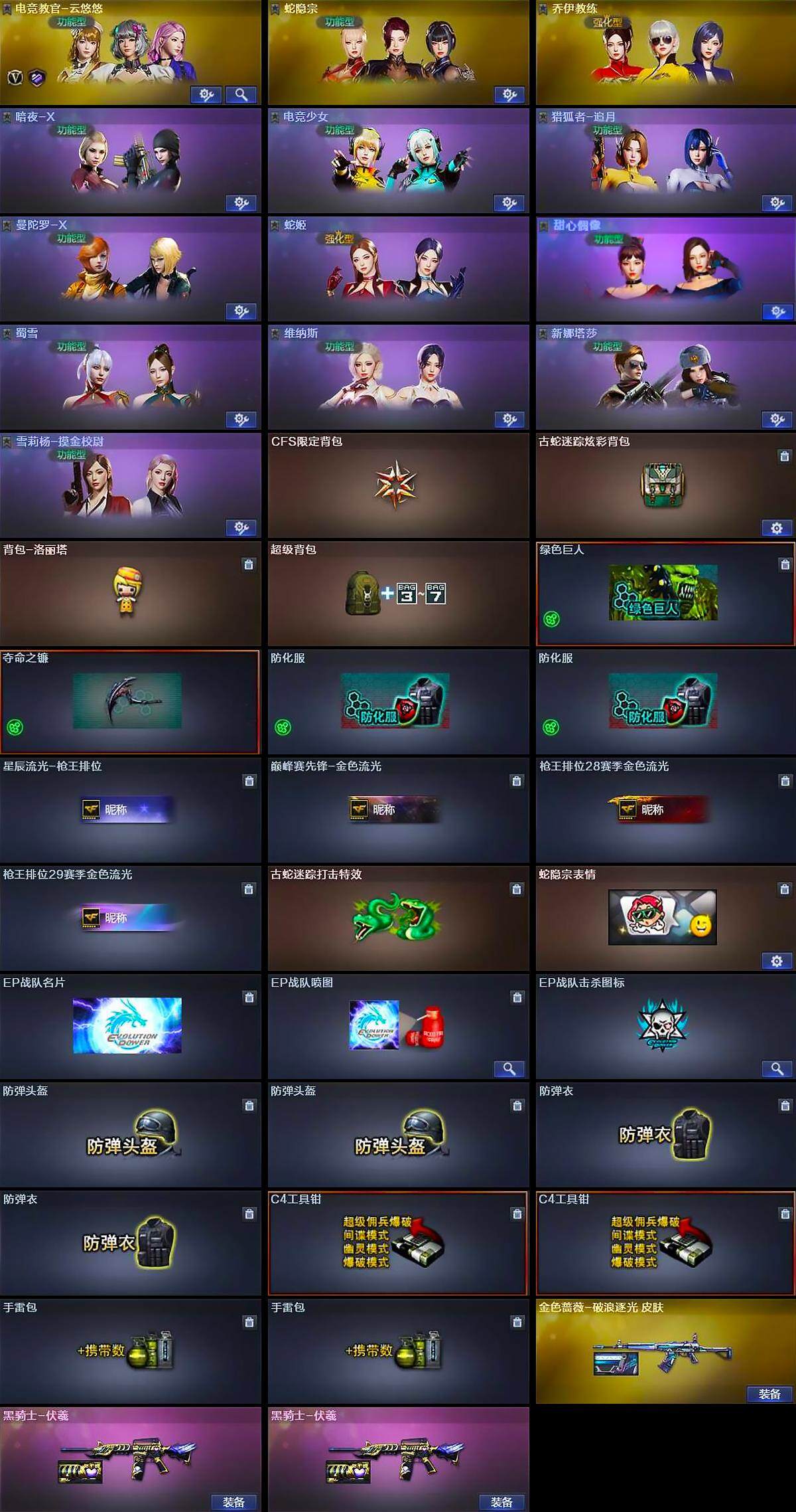 【角色】:电竞教官-云悠悠,蛇隐宗,乔伊教练,暗夜-X,电竞少女,兰-新年限定,猎狐者-追月,0号玩家,曼陀罗-X,蛇姬,甜心偶像,蜀雪,兔囡囡,维纳斯,新娜塔莎,雪莉杨-摸金校尉