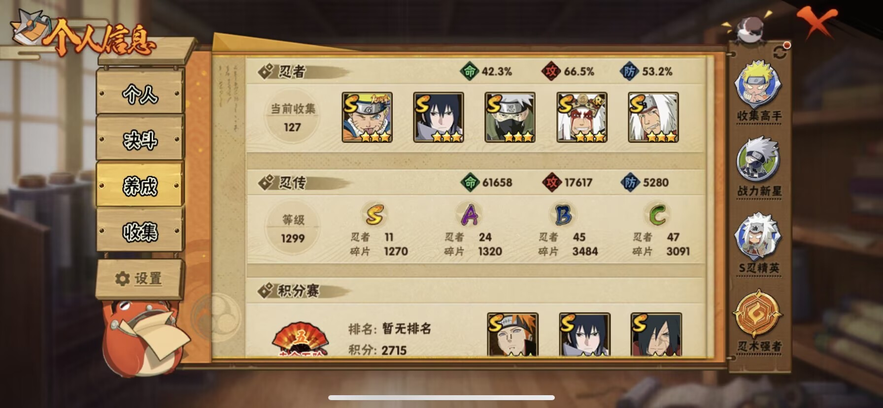 【S级】波风水门 宇智波斑「秽土转生·解」 佩恩「天道」 漩涡鸣人·宇智波佐助 自来也「传说中的三忍」 自来也「舞之豪杰」 宇智波佐助「永恒万花筒」 药师兜「仙人模式」 旗木卡卡西「须佐能乎」 宇智波斑「五影会谈」 宇智波鼬「须佐能乎」