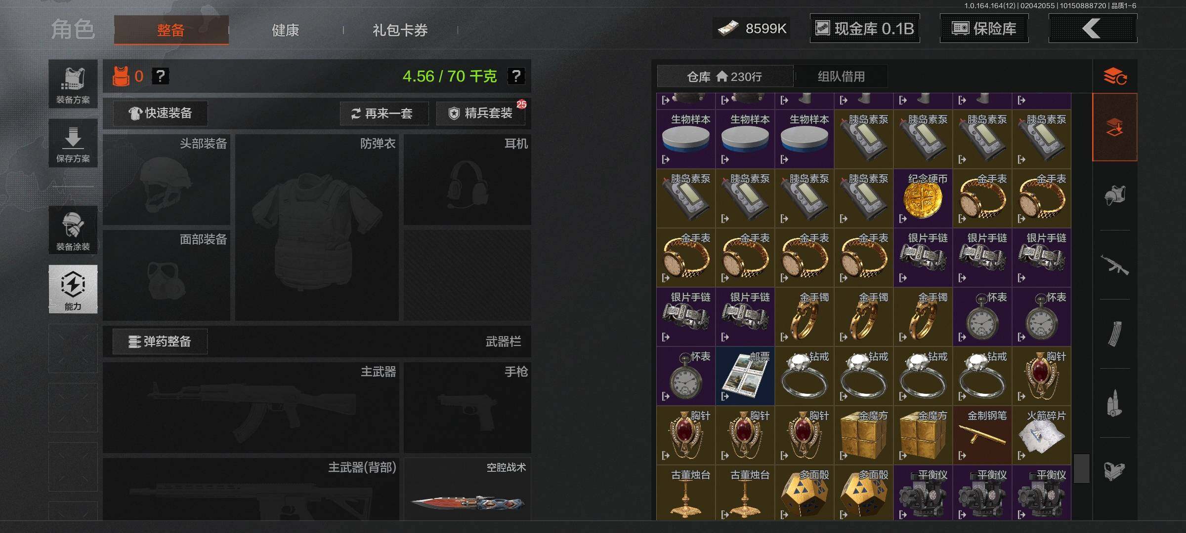 【AQZG1187】等级:30/段位:暗区传说/仓库价值(百万):249.9/柯恩币:18599000/空腔战术/骑士之剑VSS/旧王圣谕VSS/伦琴幻影AX50/棱光裂变QBU191/乌金黑曜QBZ192/旧王圣谕QBZ191/战术大师AN94/告丧夜曲AR57/告丧夜曲AUG/战术大师AEK
