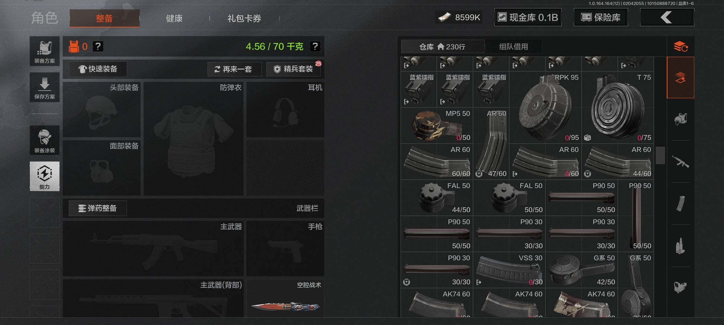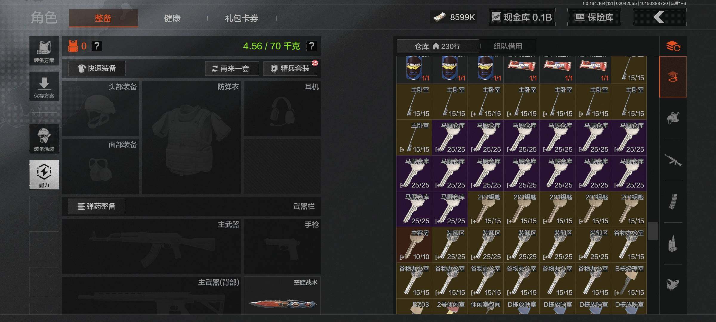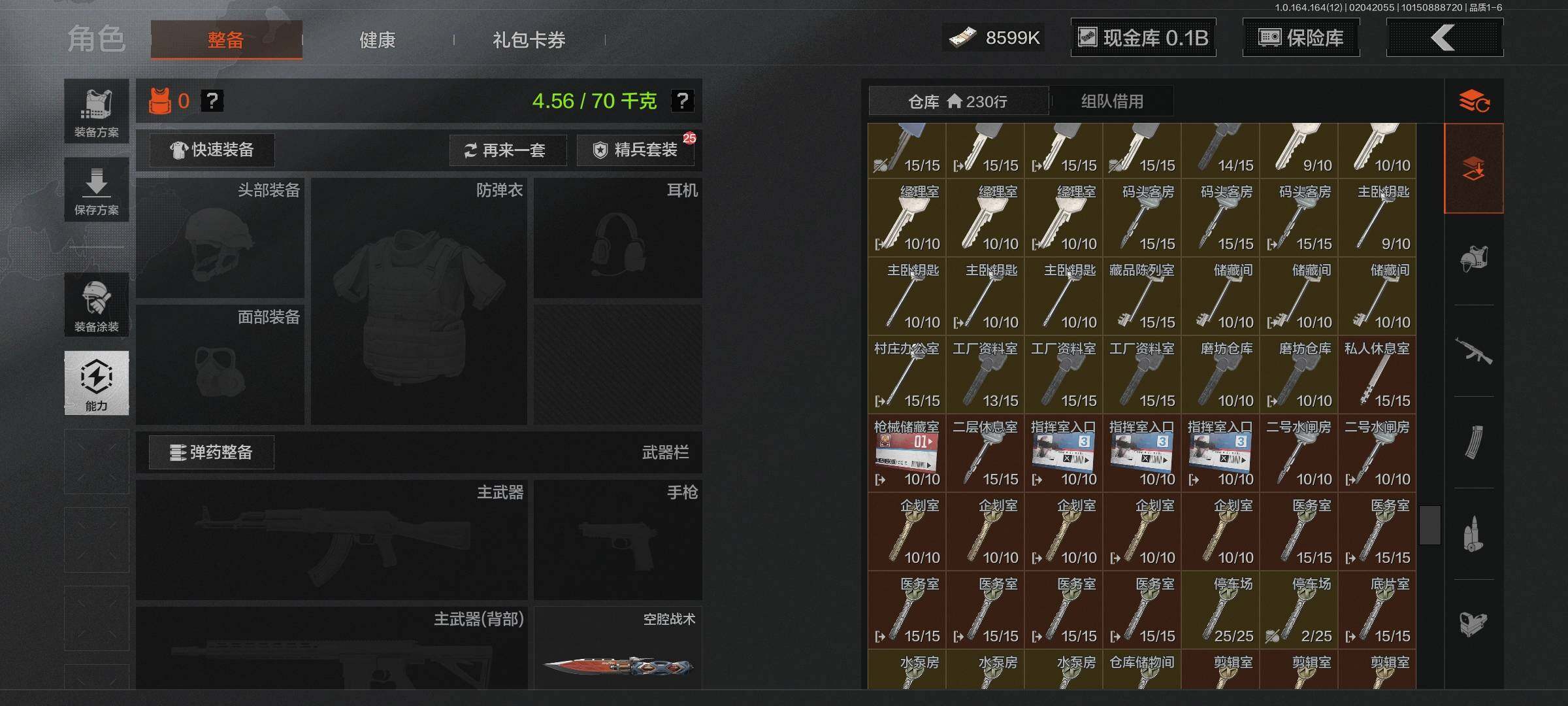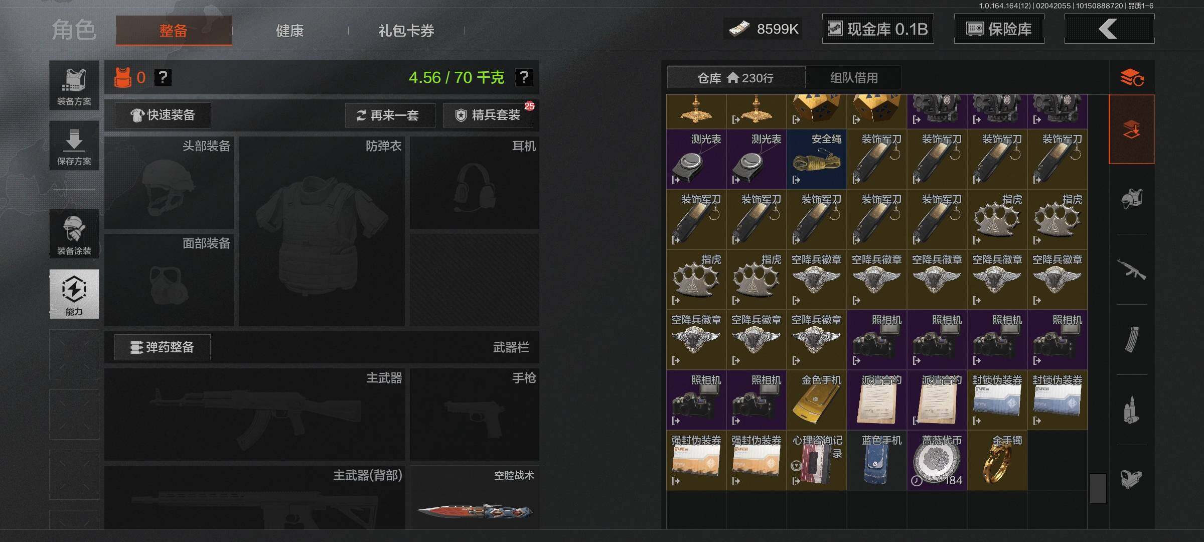 等级:30/段位:暗区传说/仓库价值(百万):249.9/柯恩币:18599000/空腔战术/骑士之剑VSS/