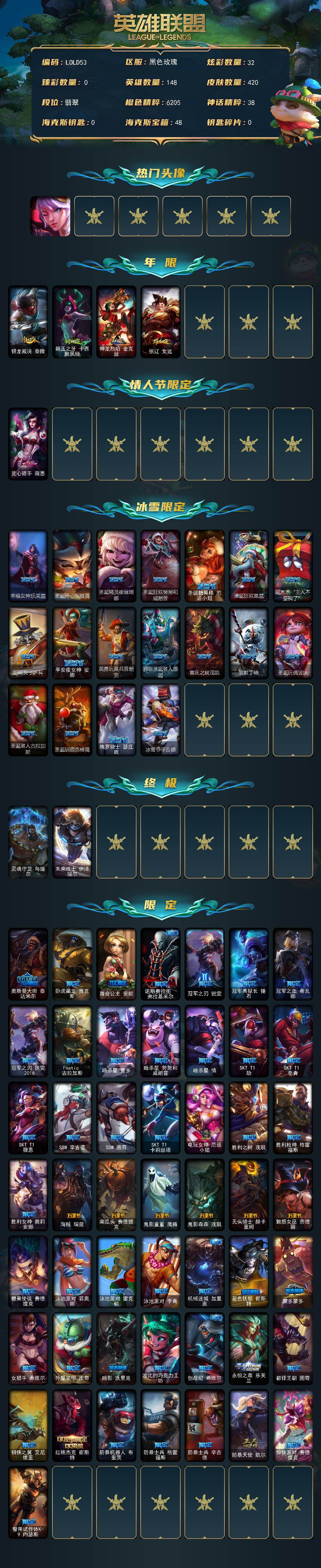 【LOLD53】148英雄/420皮肤/2终极/73限定/32炫彩/40传说/124史诗/流光翡翠/觅心之翼奎因头像/银龙裁决泰隆/碧玉之牙卡西奥佩娅/神龙烈焰金克丝/张辽文远/觅心猎手薇恩/幸福女神乐芙兰/圣诞开心鬼提莫/圣诞精灵崔丝塔娜/圣诞狂欢努努和威朗普/圣诞糖果棒厄运小姐/圣诞狂欢基兰/阿木木“主人不要我了”/胡桃夹子萨科/平安夜女神娑娜/英勇玩具兵普朗克/邪恶圣诞老人维迦/喜庆之树茂凯/雪默丁格/圣诞玩偶波比/圣诞老人古拉加斯/圣诞驯鹿克格莫/魄罗骑士瑟庄妮/冰雪节辛吉德/灵魂守卫乌