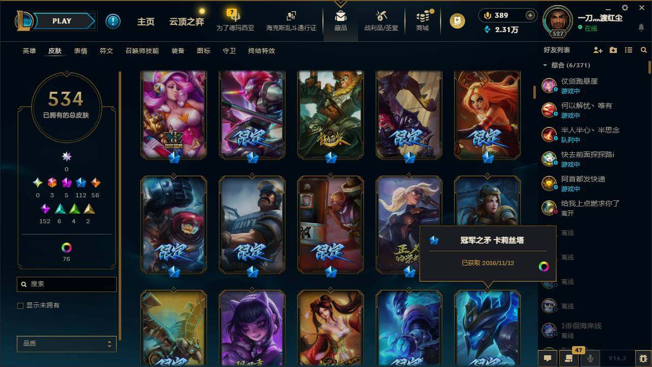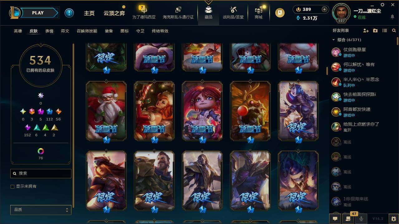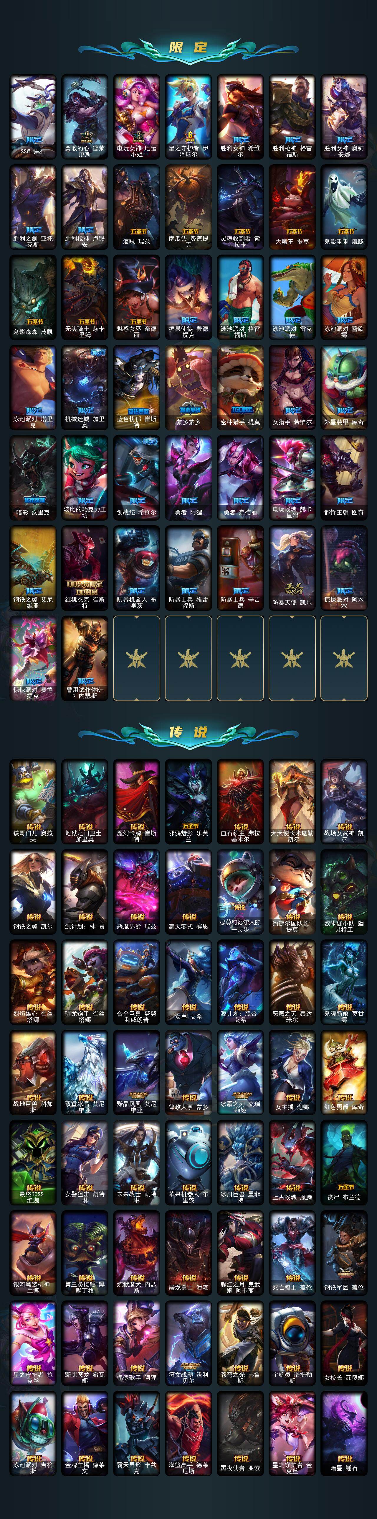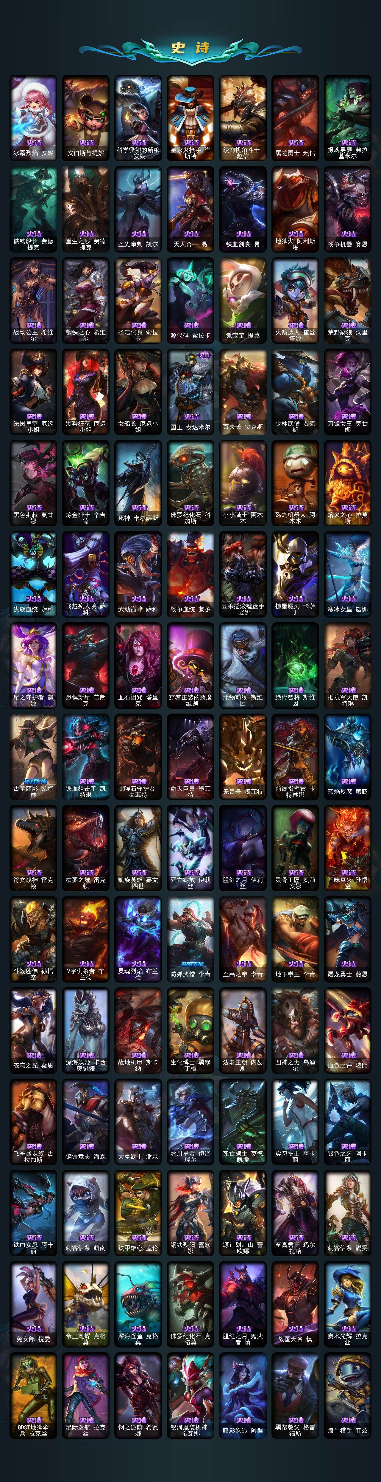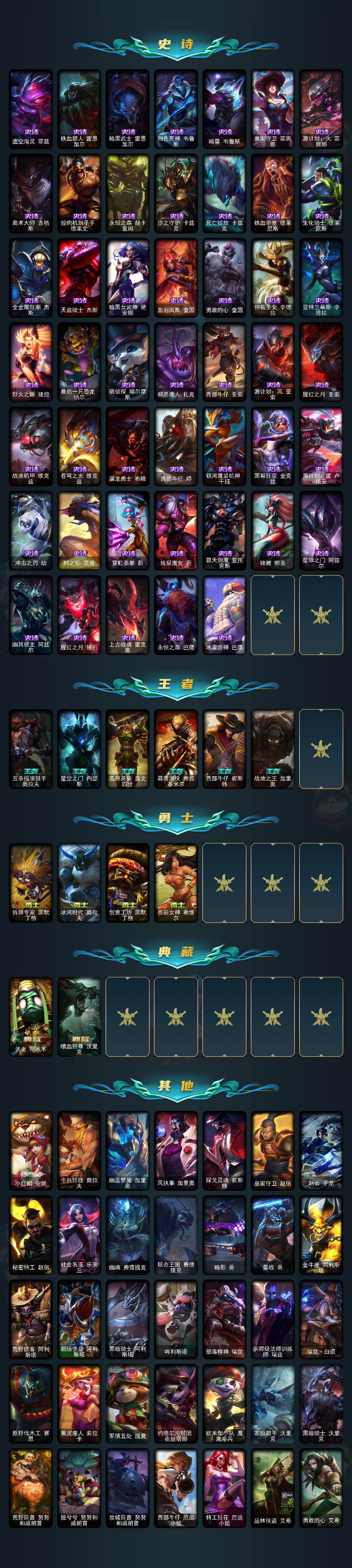 161英雄/534皮肤/3终极/5神话/112限定/5臻彩/104炫彩/56传说/152史诗/黄金/十周年纪念安妮/