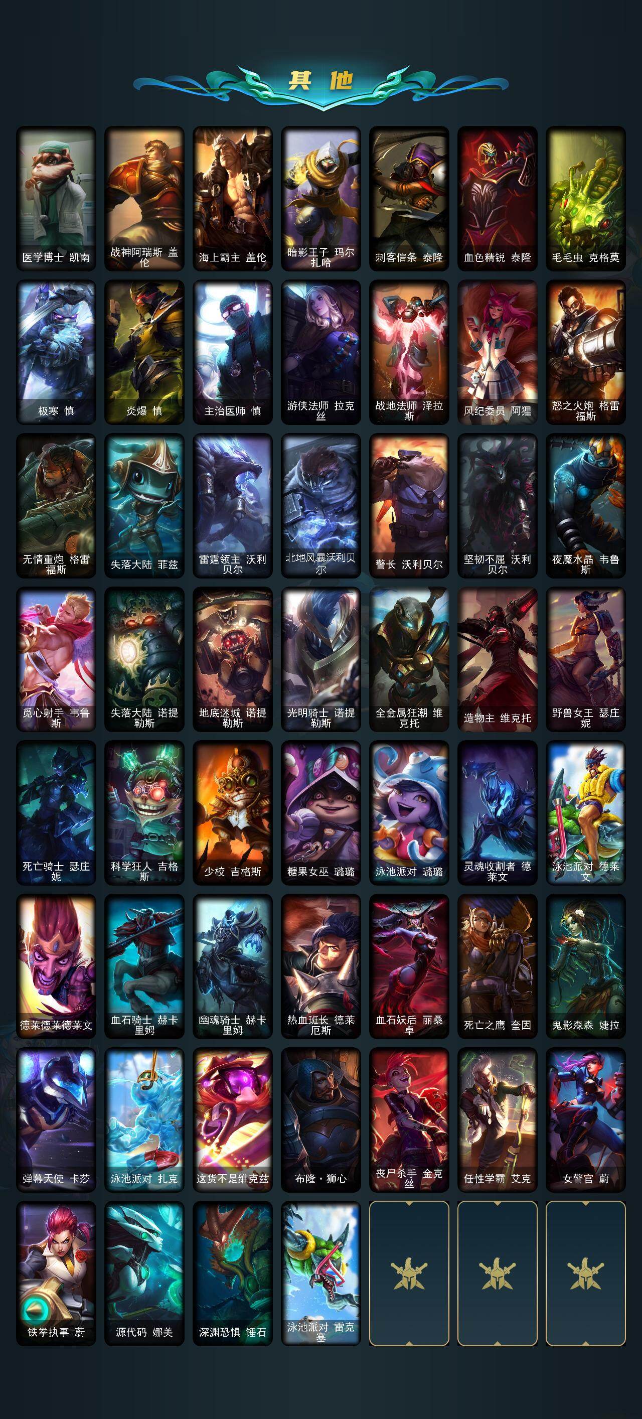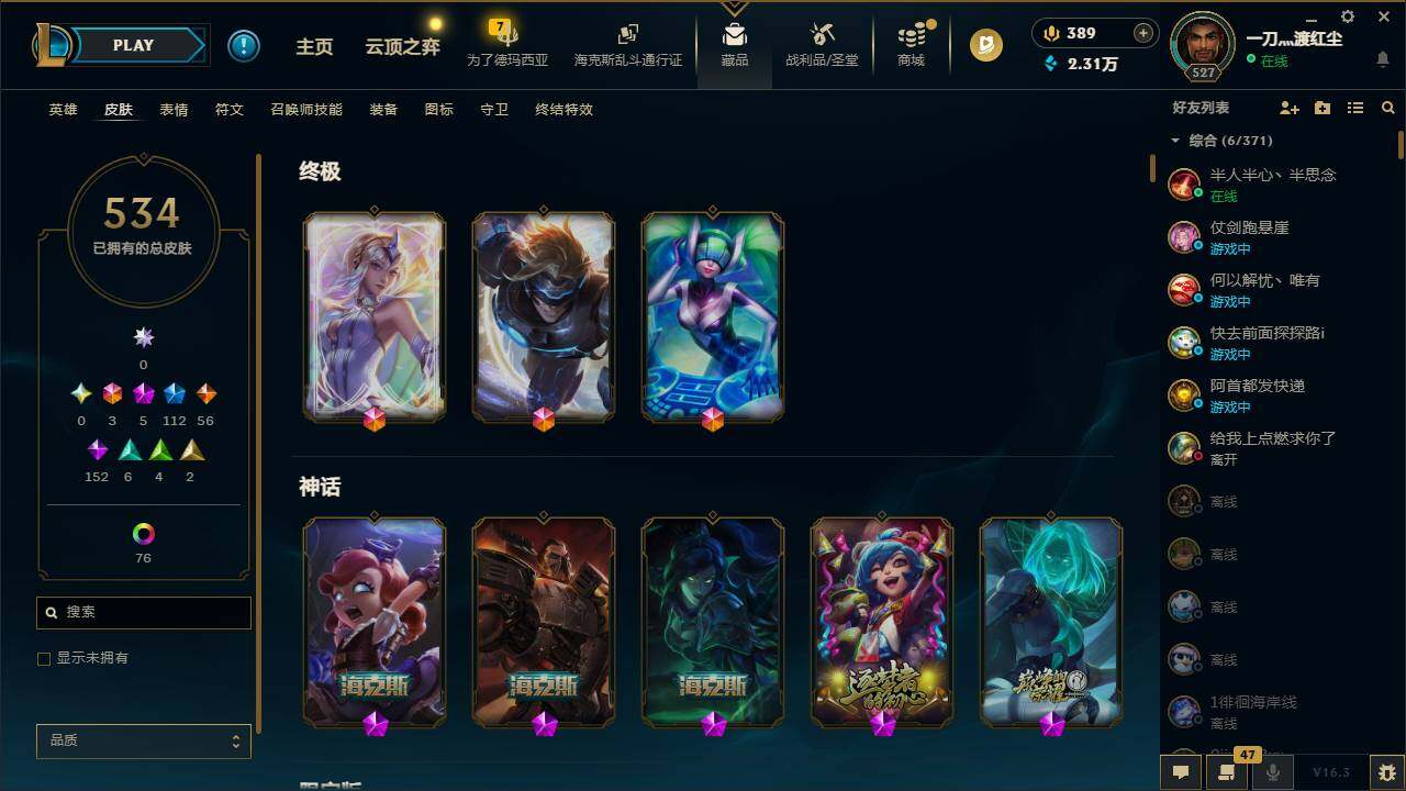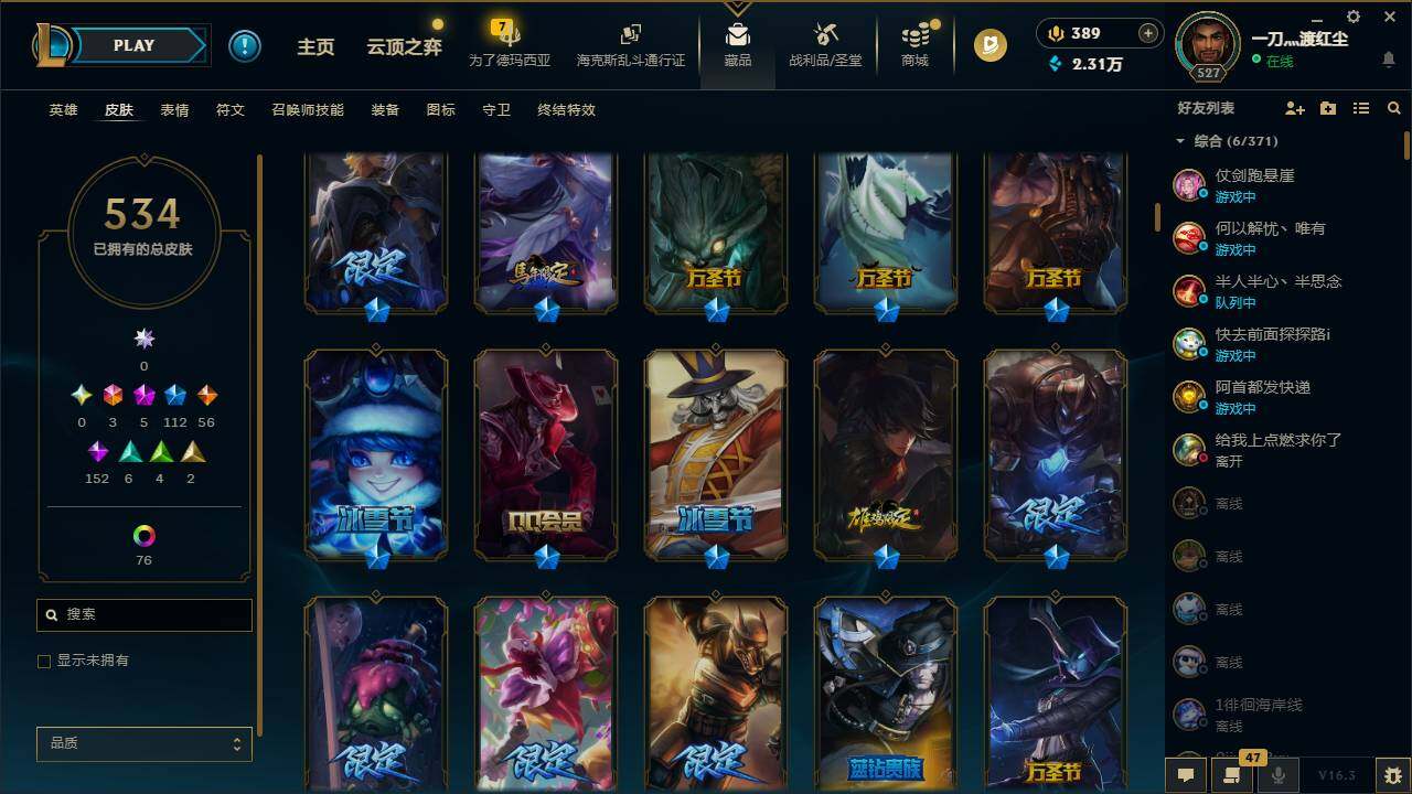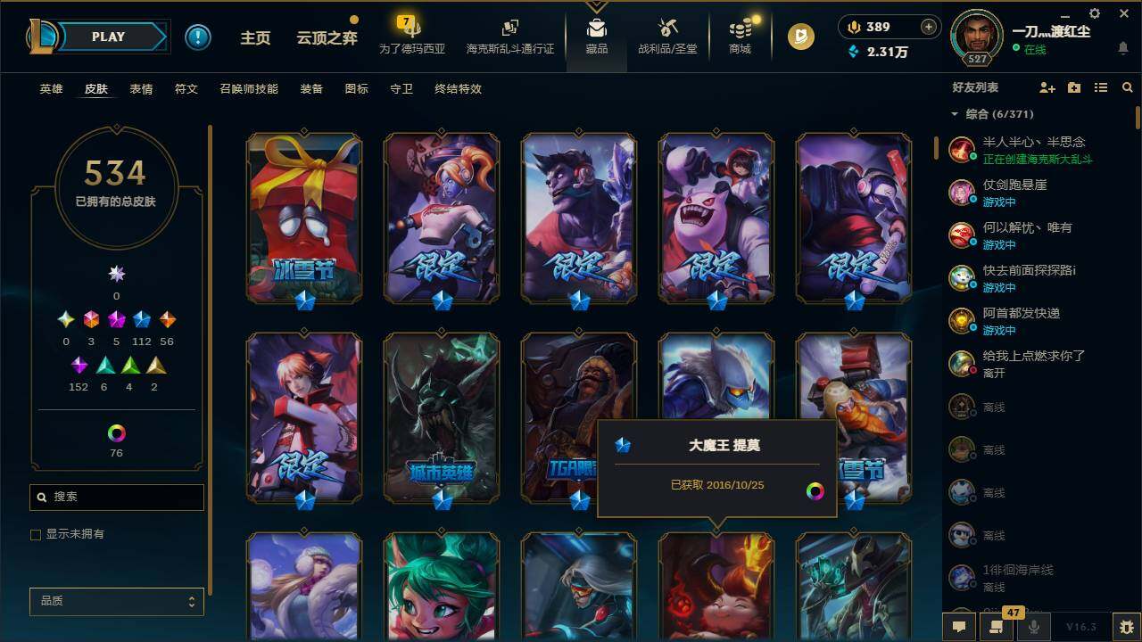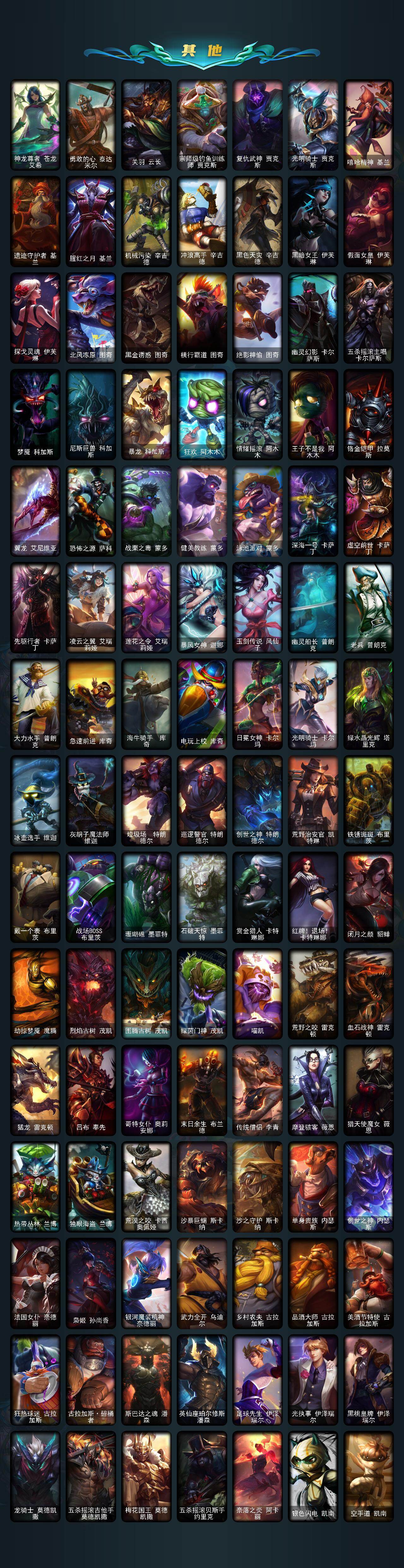 161英雄/534皮肤/3终极/5神话/112限定/5臻彩/104炫彩/56传说/152史诗/黄金/十周年纪念安妮/