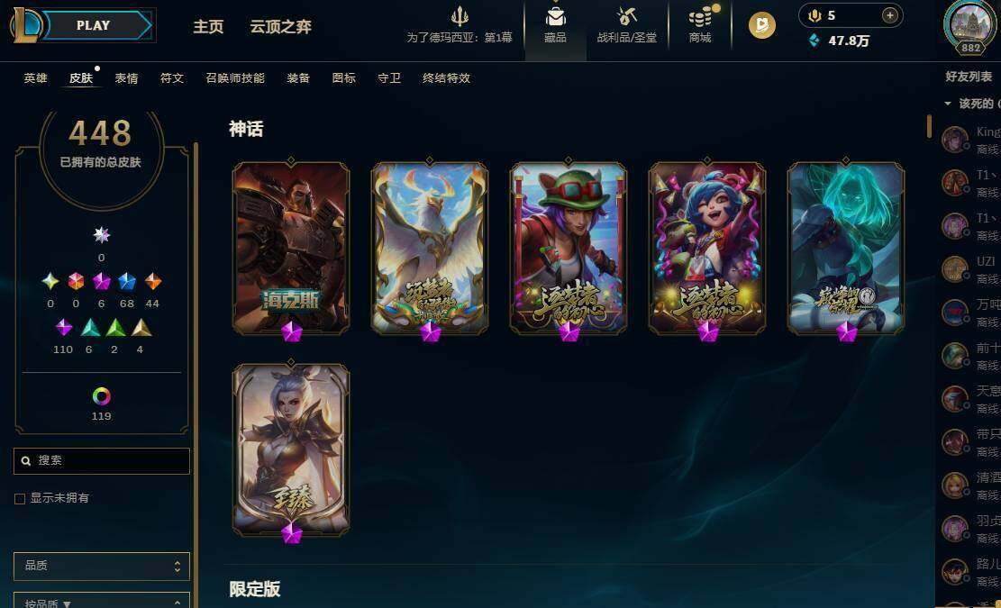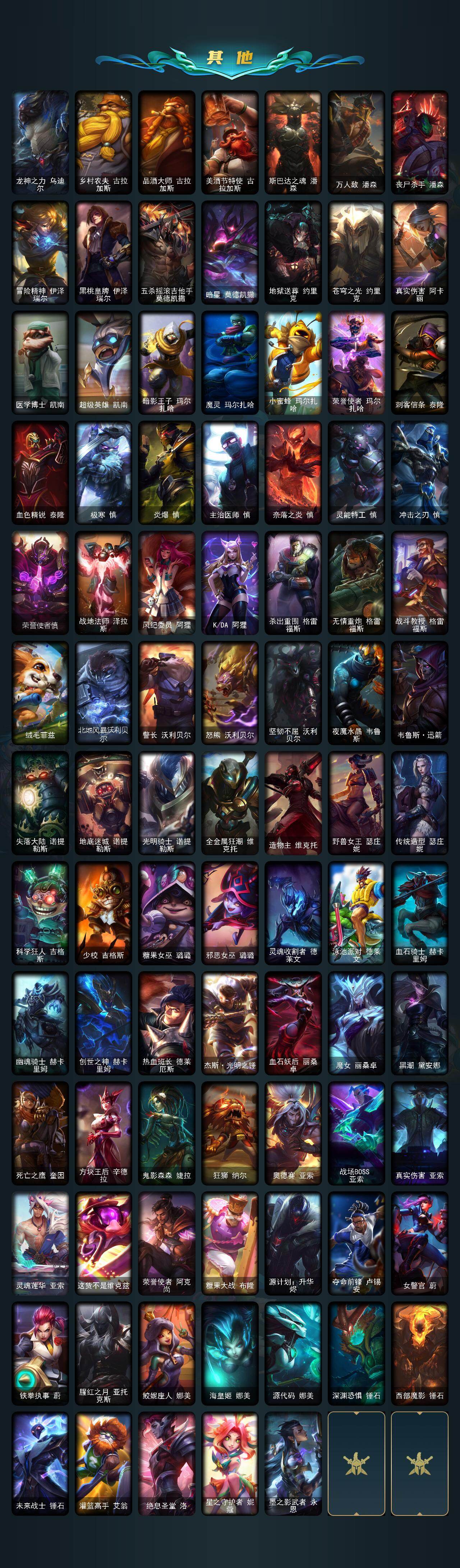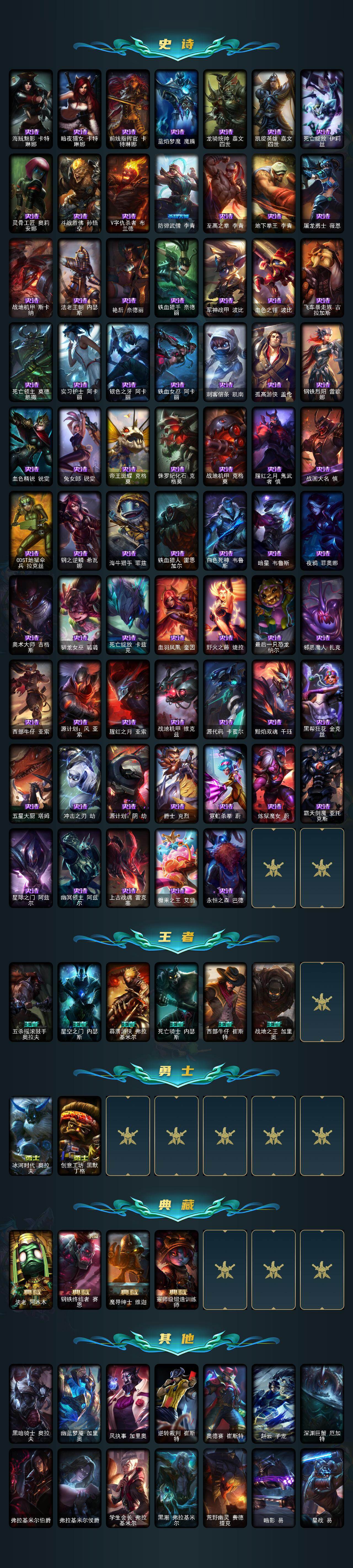 172英雄/449皮肤/6神话/69限定/4臻彩/135炫彩/44传说/110史诗/未定级/