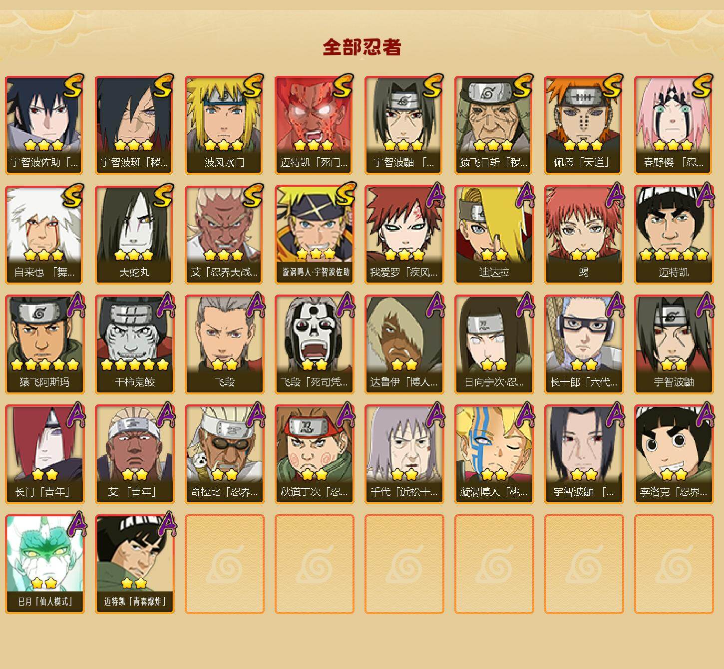 【HYYT214】V0/S忍12/A忍22/忍界大战-日向宁次/五代目雷影-达鲁伊/死司凭血-飞段/宇智波鼬/永恒万花筒-宇智波佐助/5星猿飞阿斯玛/青年-长门/蝎/秽土转生-猿飞日斩/天道-佩恩/3星漩涡鸣人·宇智波佐助/波风水门/忍界大战-秋道丁次/5星迈特凯/桃式显现-漩涡博人/忍界大战-奇拉比/3星我爱罗「疾风传」/忍界大战-李洛克/六代目水影-长十郎/舞之豪杰-自来也/死门-迈特凯/飞段/忍界大战-春野樱/夏日限定-宇智波鼬/迪达拉/2星巳月「仙人模式」/大蛇丸/3星艾「忍界大战」/秽