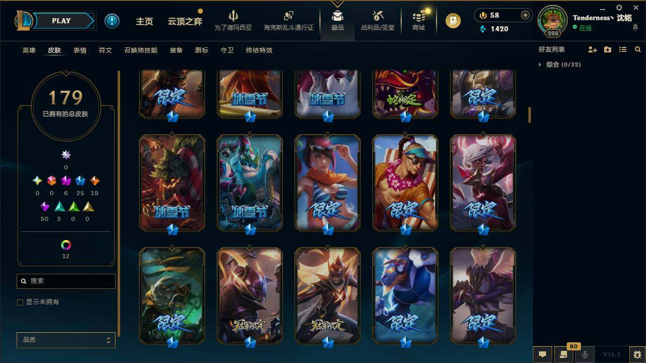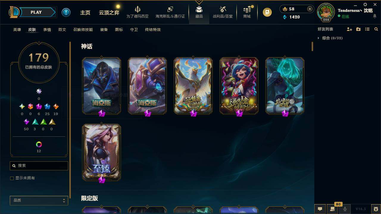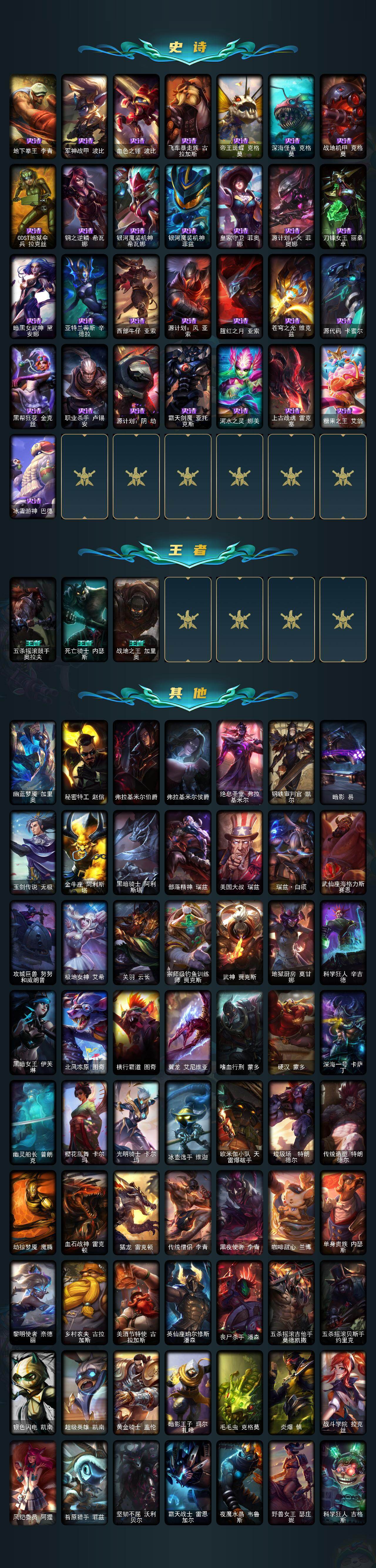 171英雄/179皮肤/6神话/25限定/3臻彩/19炫彩/19传说/50史诗/未定级/十周年纪念安妮/
